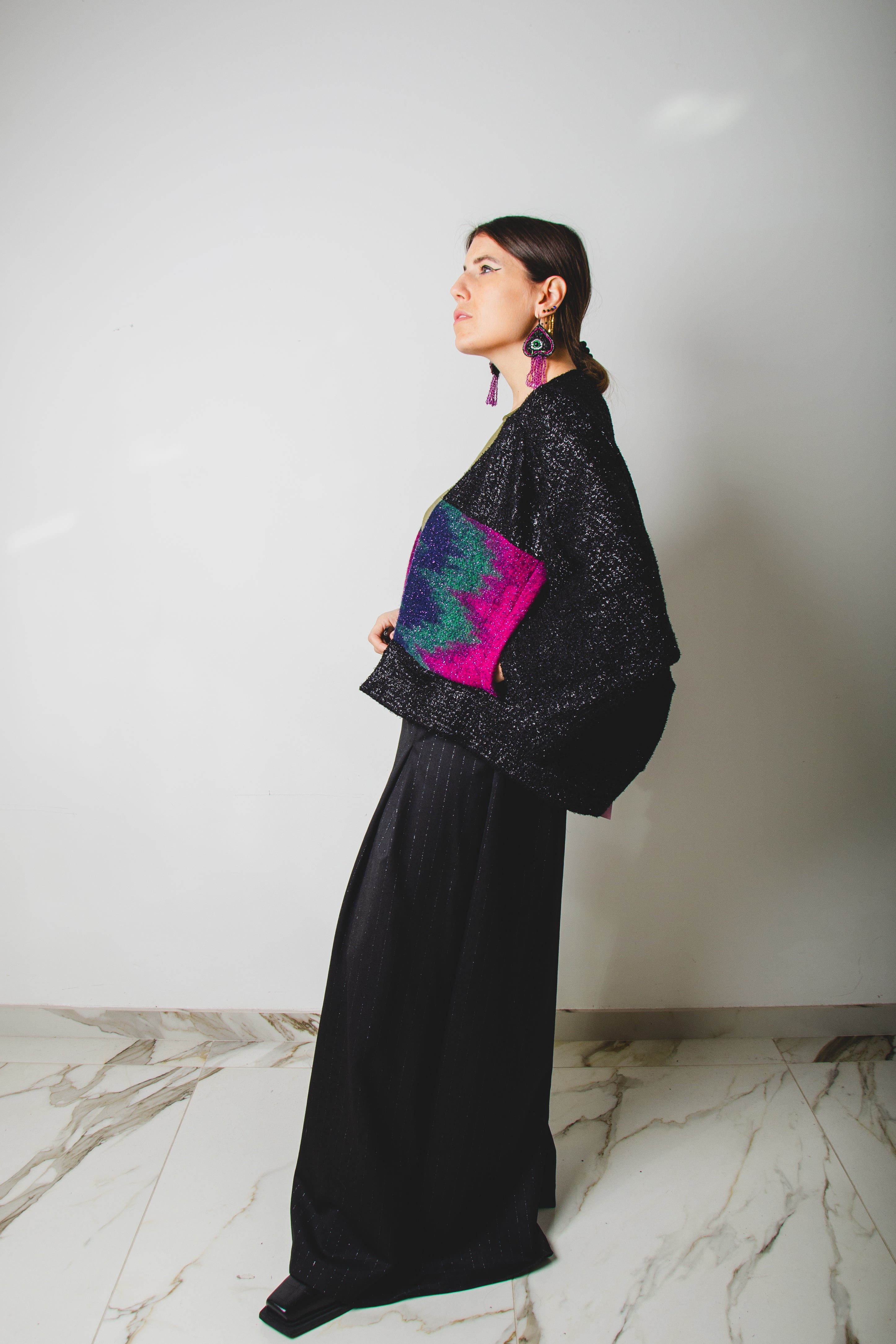 Pantalone palazzo NICOLE con elastico in vita in maglina elasticizzata verde e viola con lurex TAGLIA 1