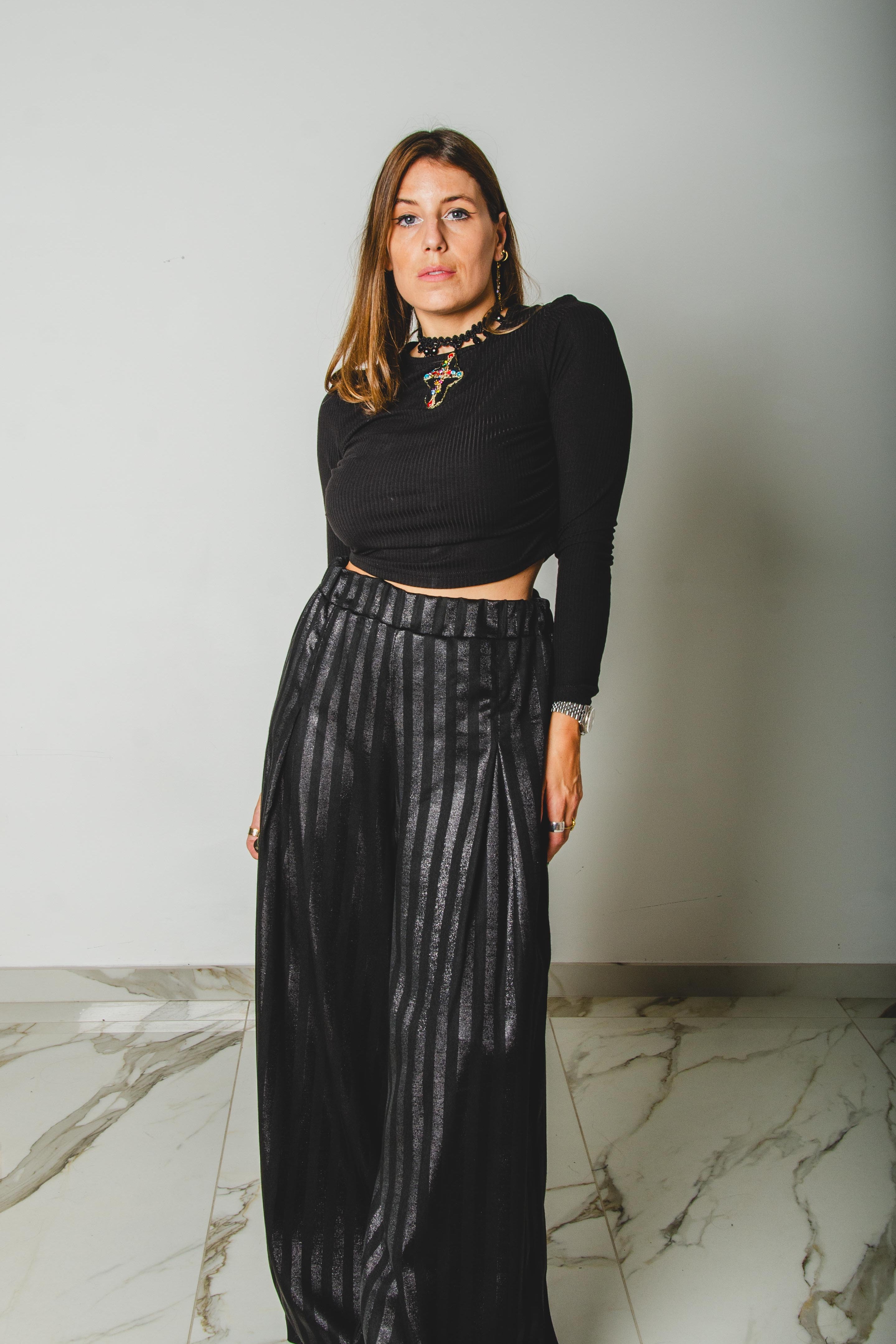34 - Pantalone palazzo NICOLE sartoriale in lana nera con gessatura in lurex brillante
