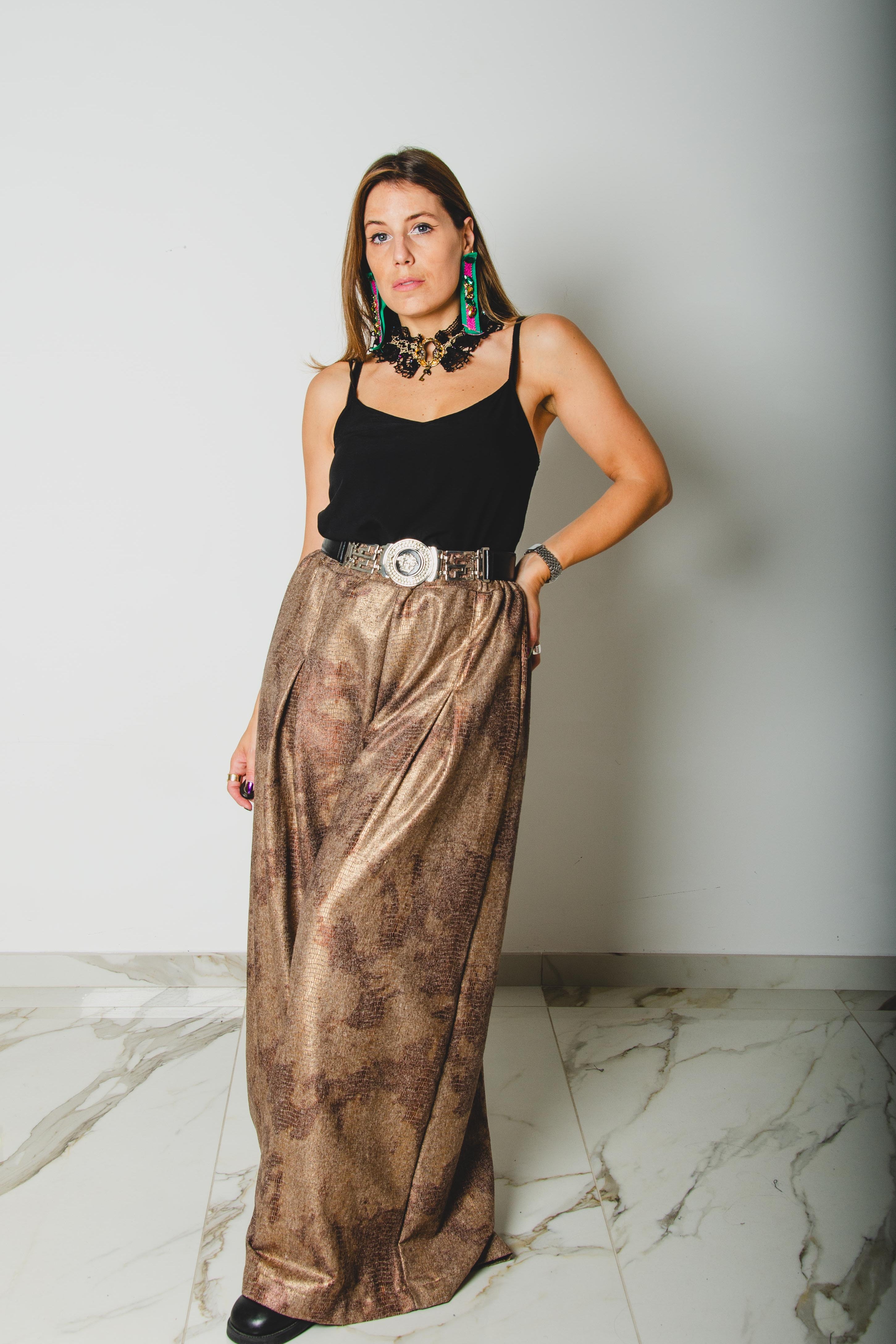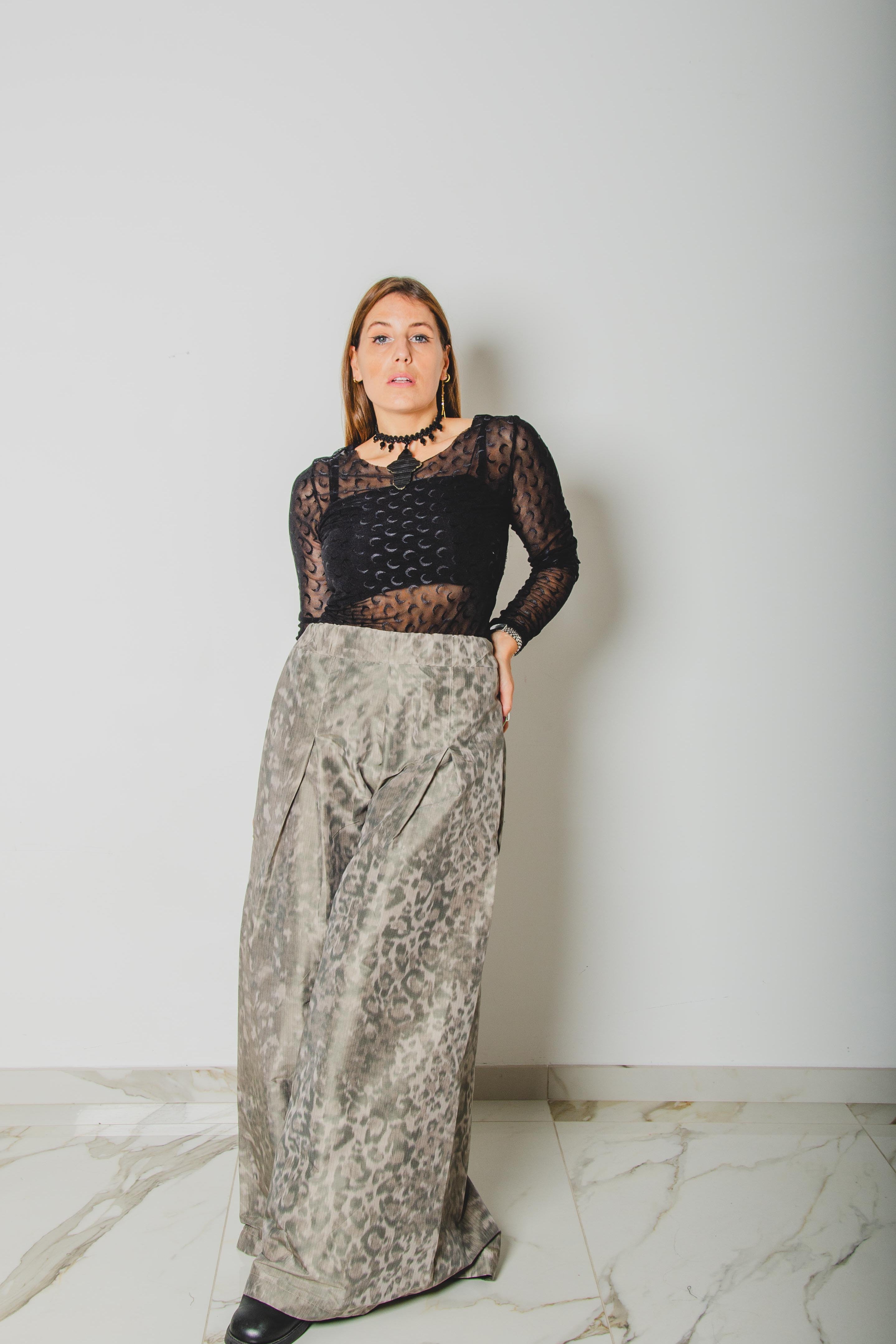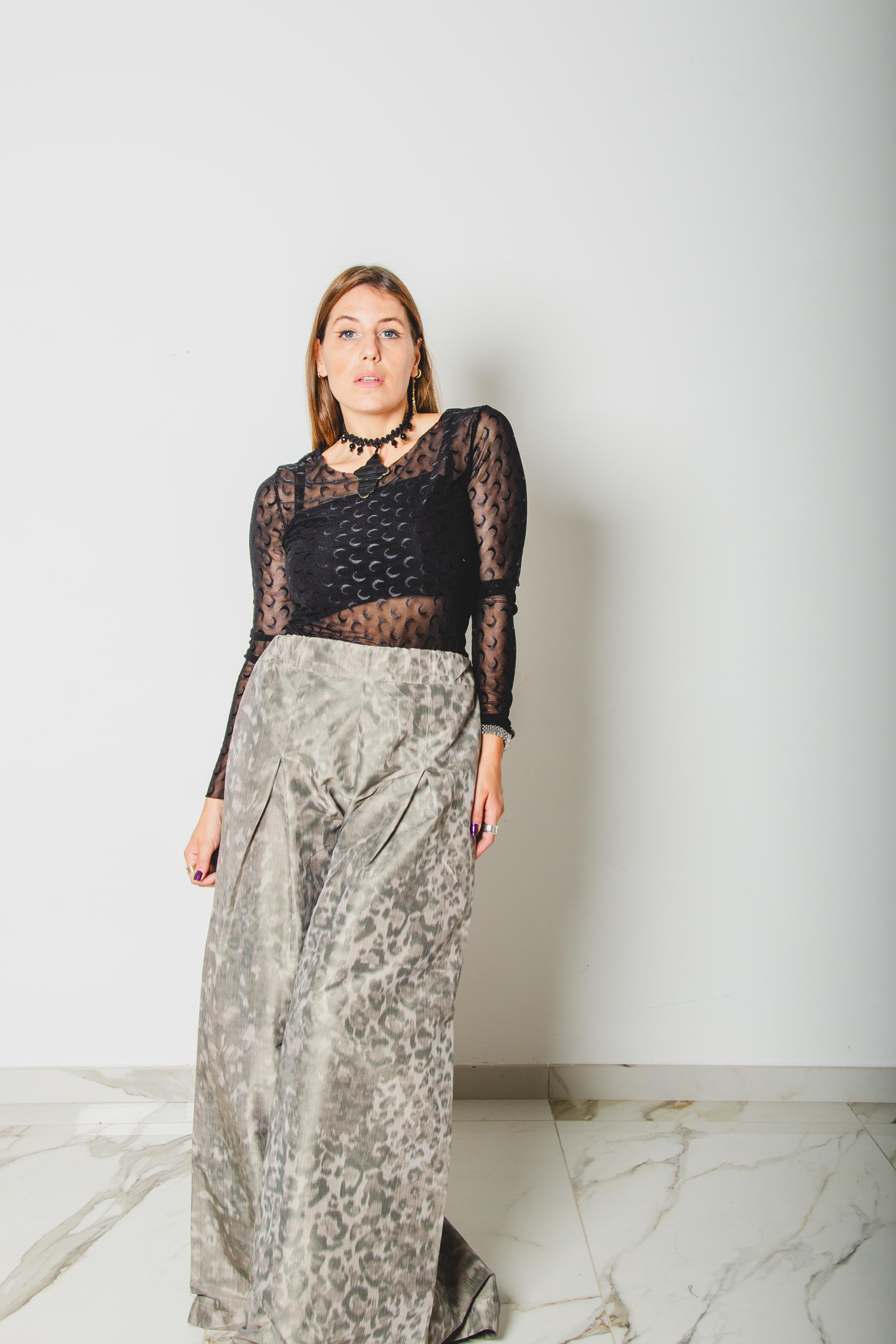 38 - Pantalone palazzo NICOLE sartoriale in taffetà effetto rigido fantasia animalier astratta