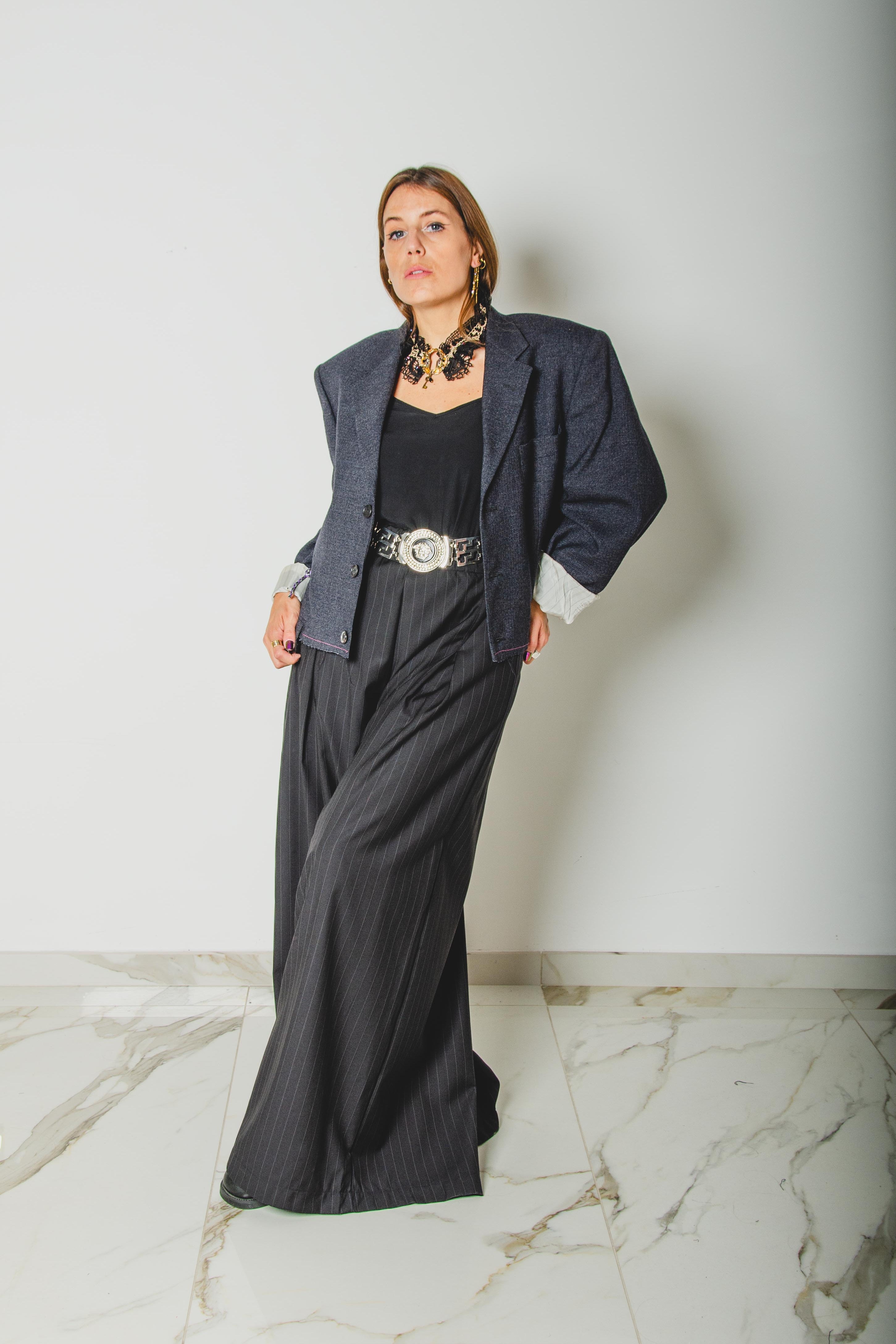 40 - Pantalone palazzo NICOLE sartoriale in lana grigia gessata