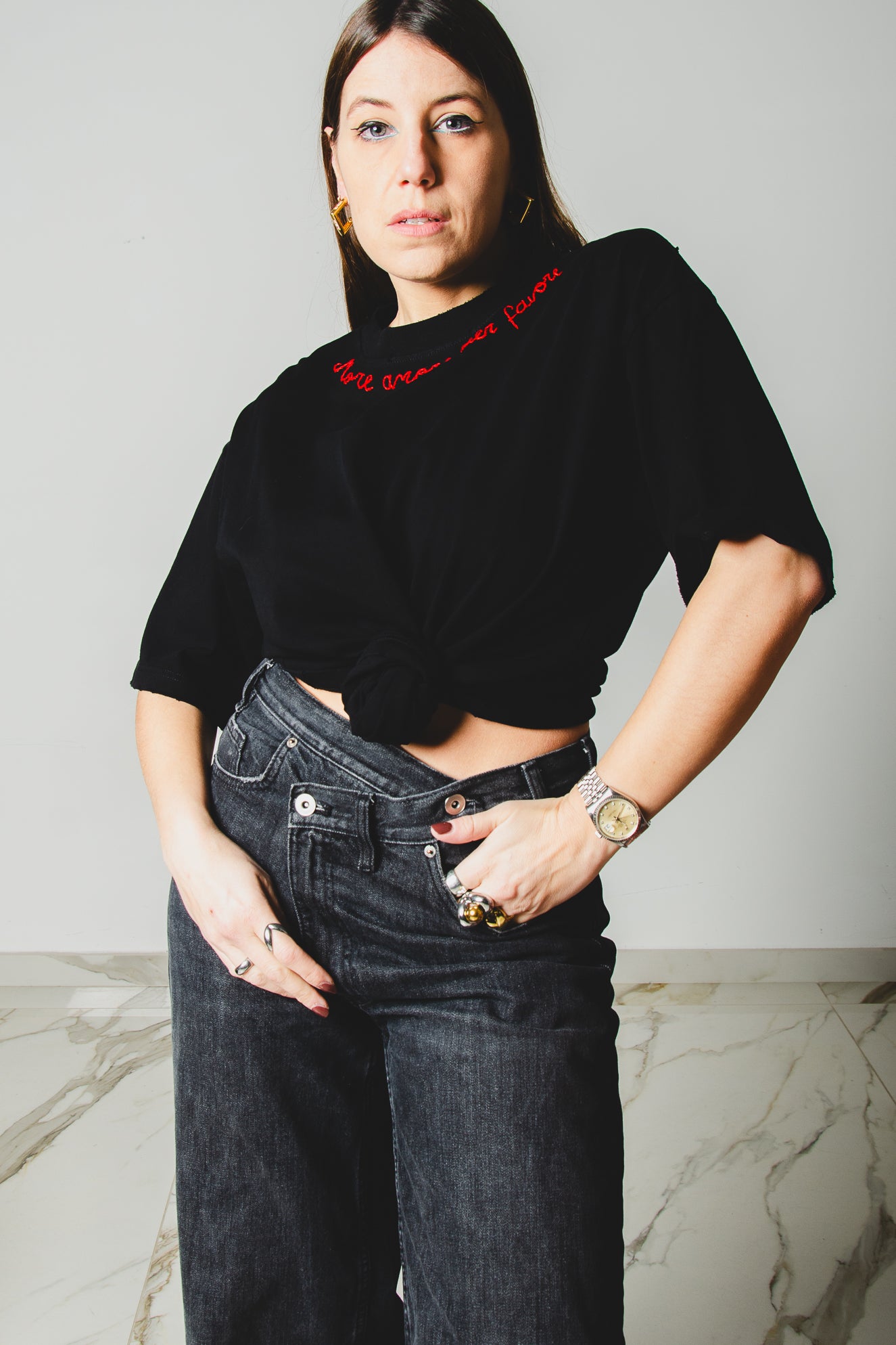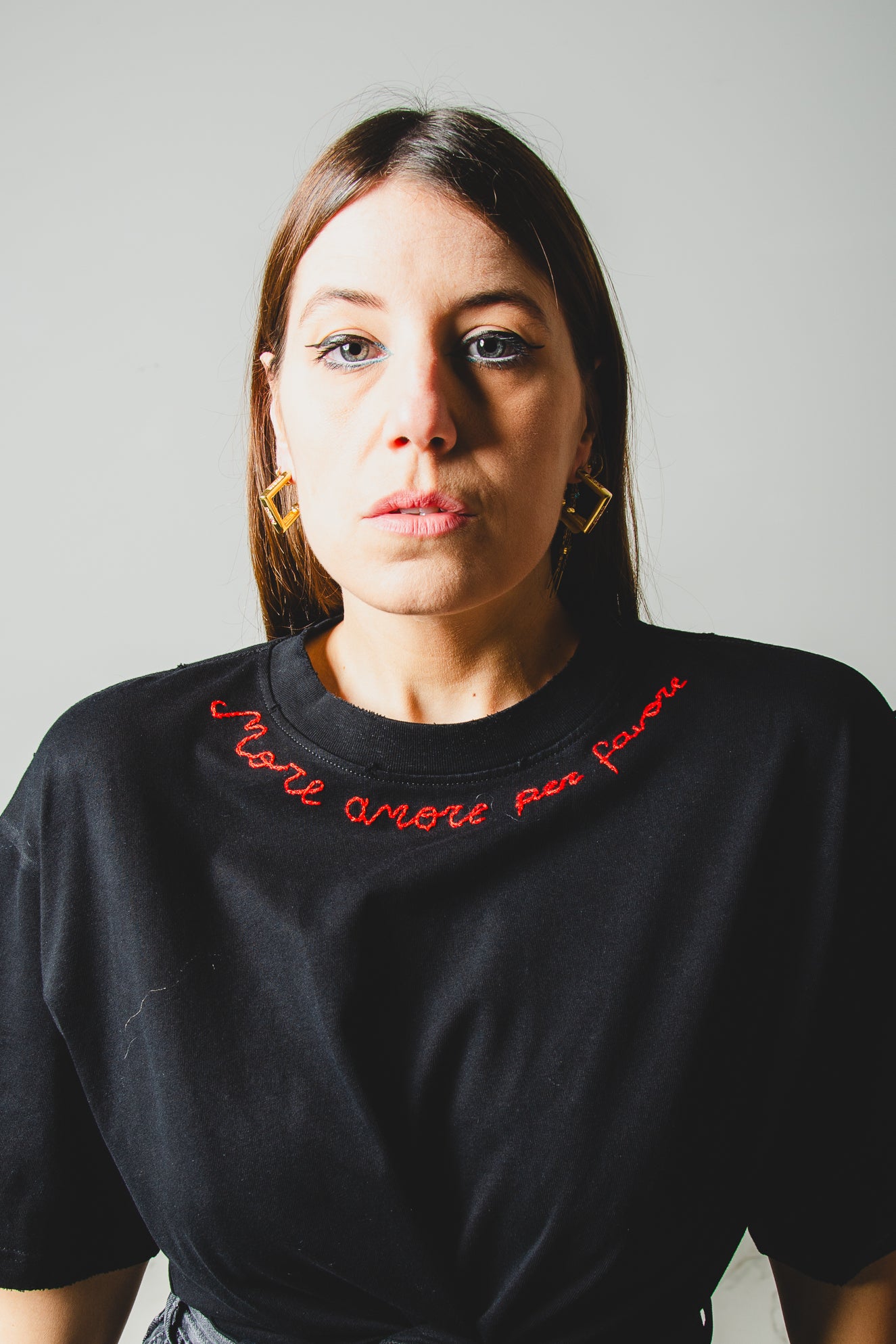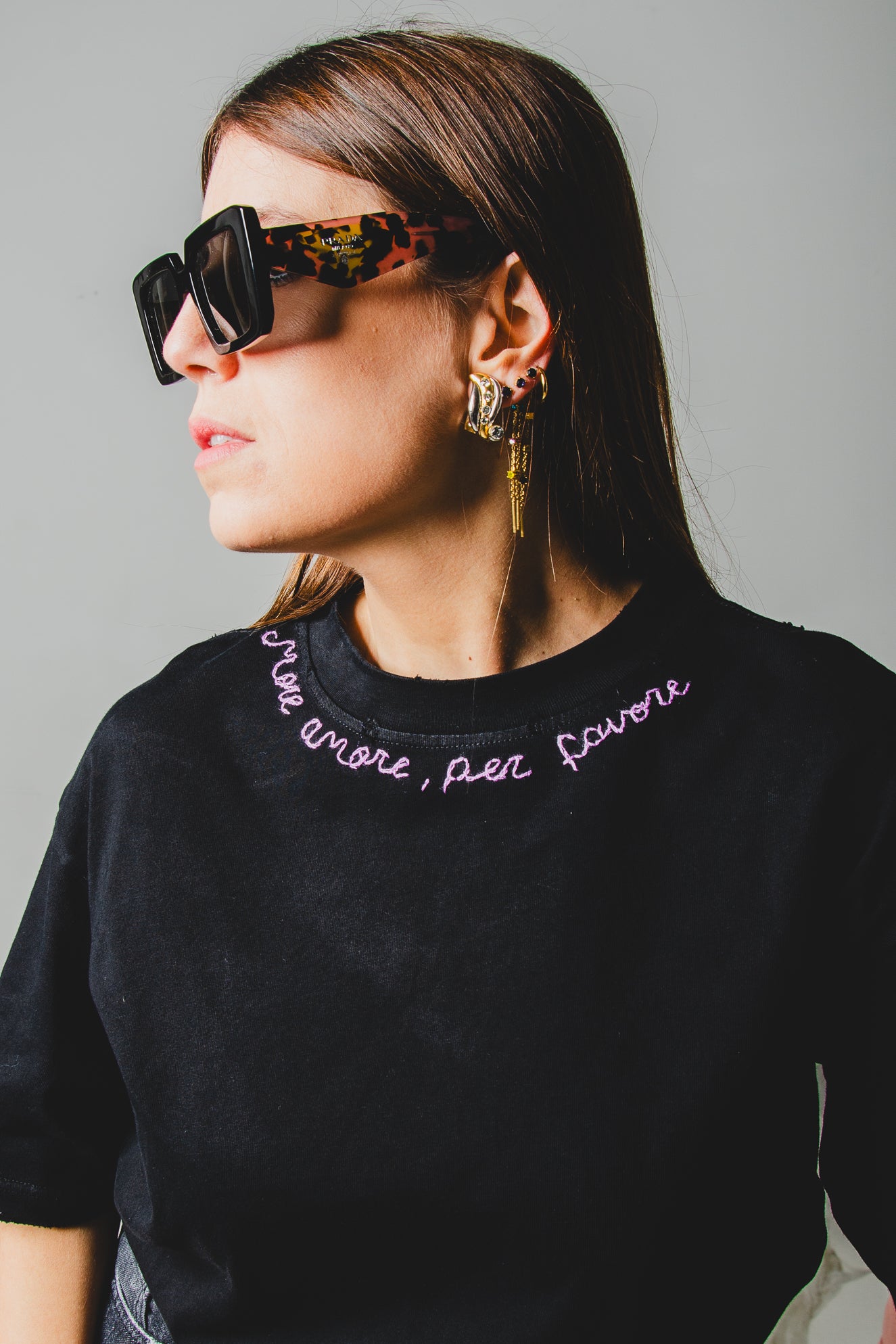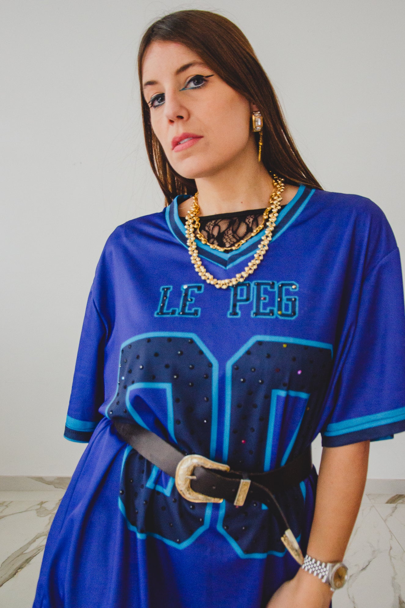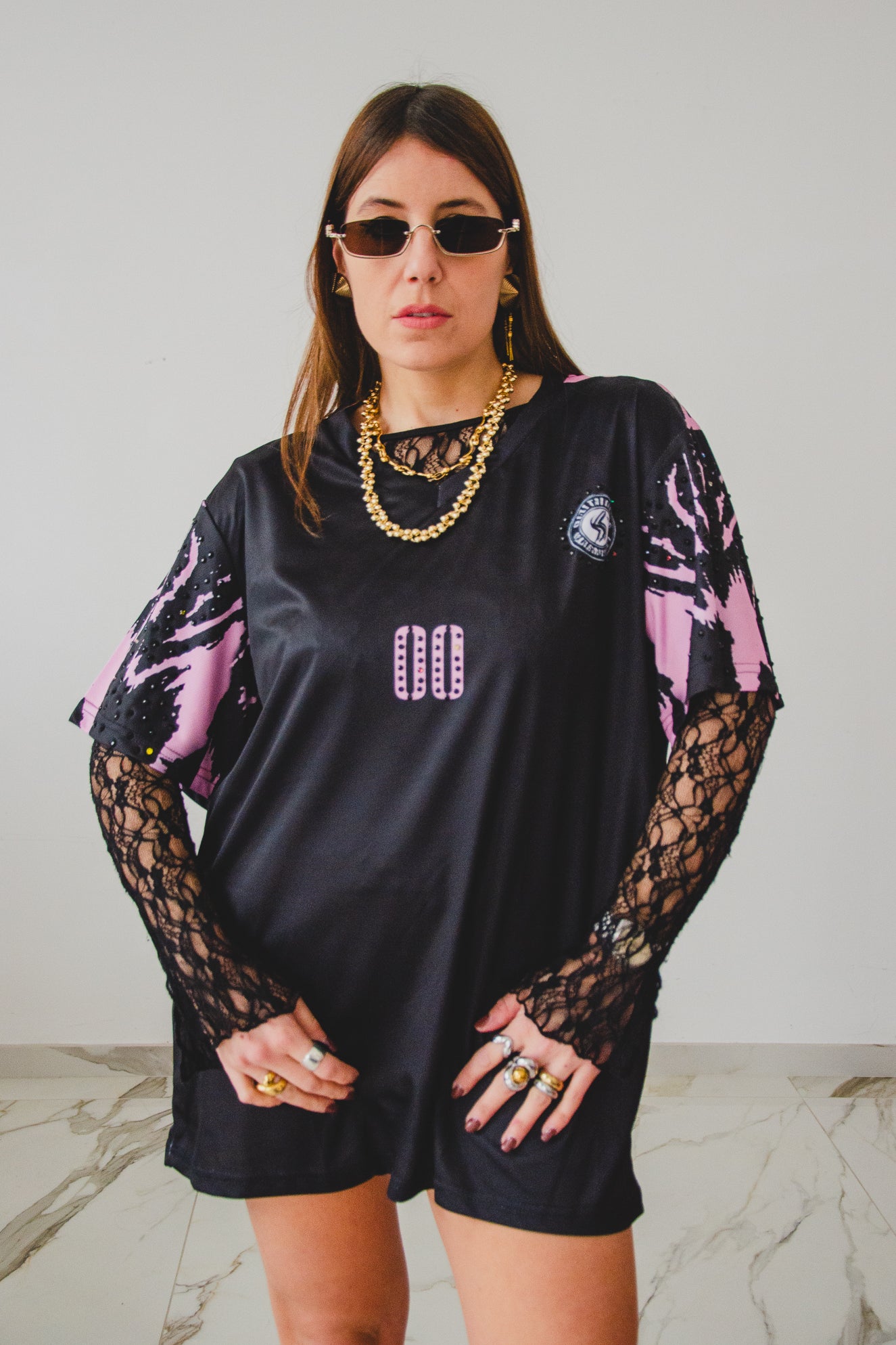 T-shirt dal taglio oversize , modello maschile con personalizzazioni come ricami a mano, pittura, strass.