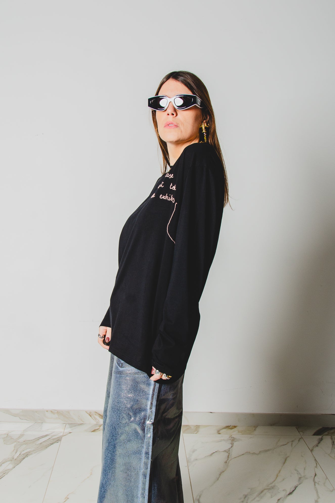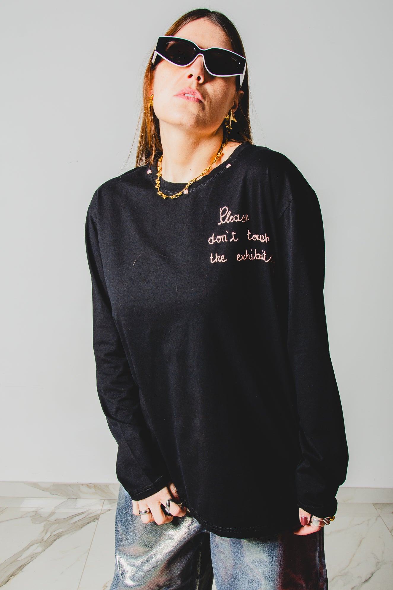 20 - Maglia oversize nera a maniche lunghe in cotone XXXL ricamata a mano PLEASE DON’T TOUCH THE EXHIBITS