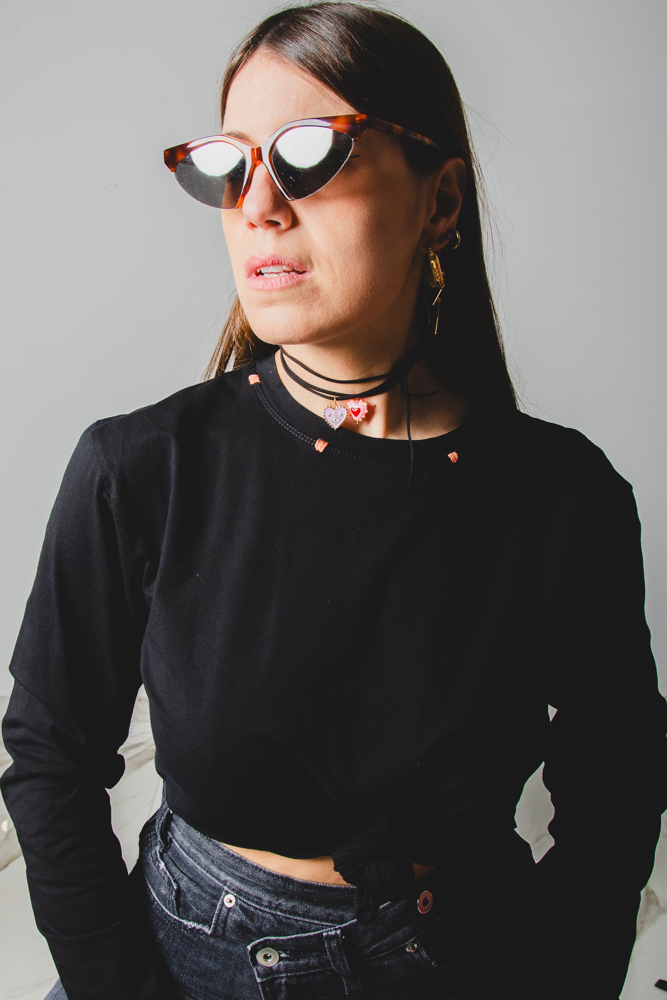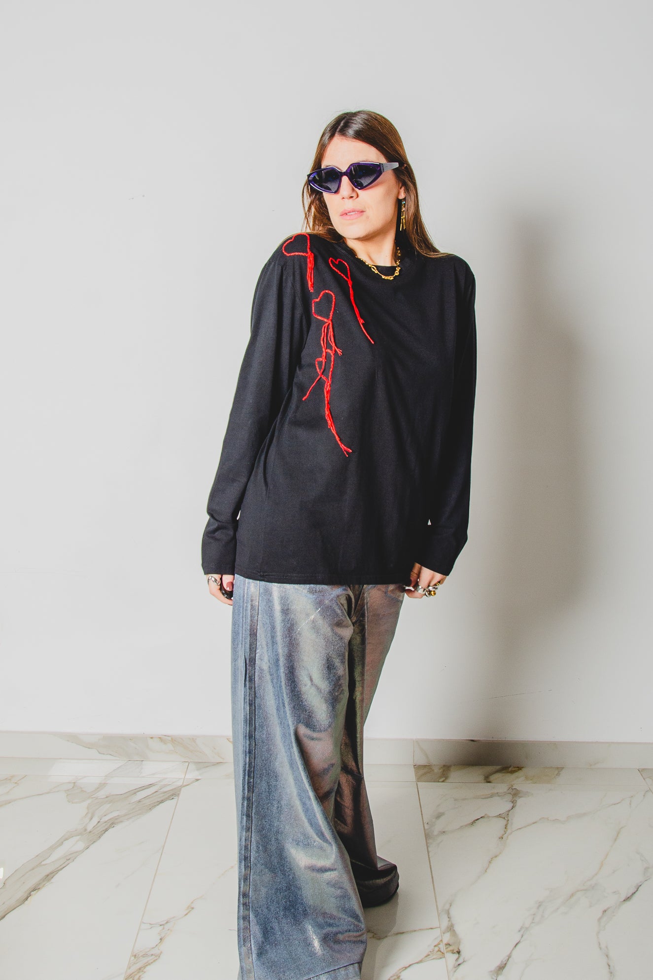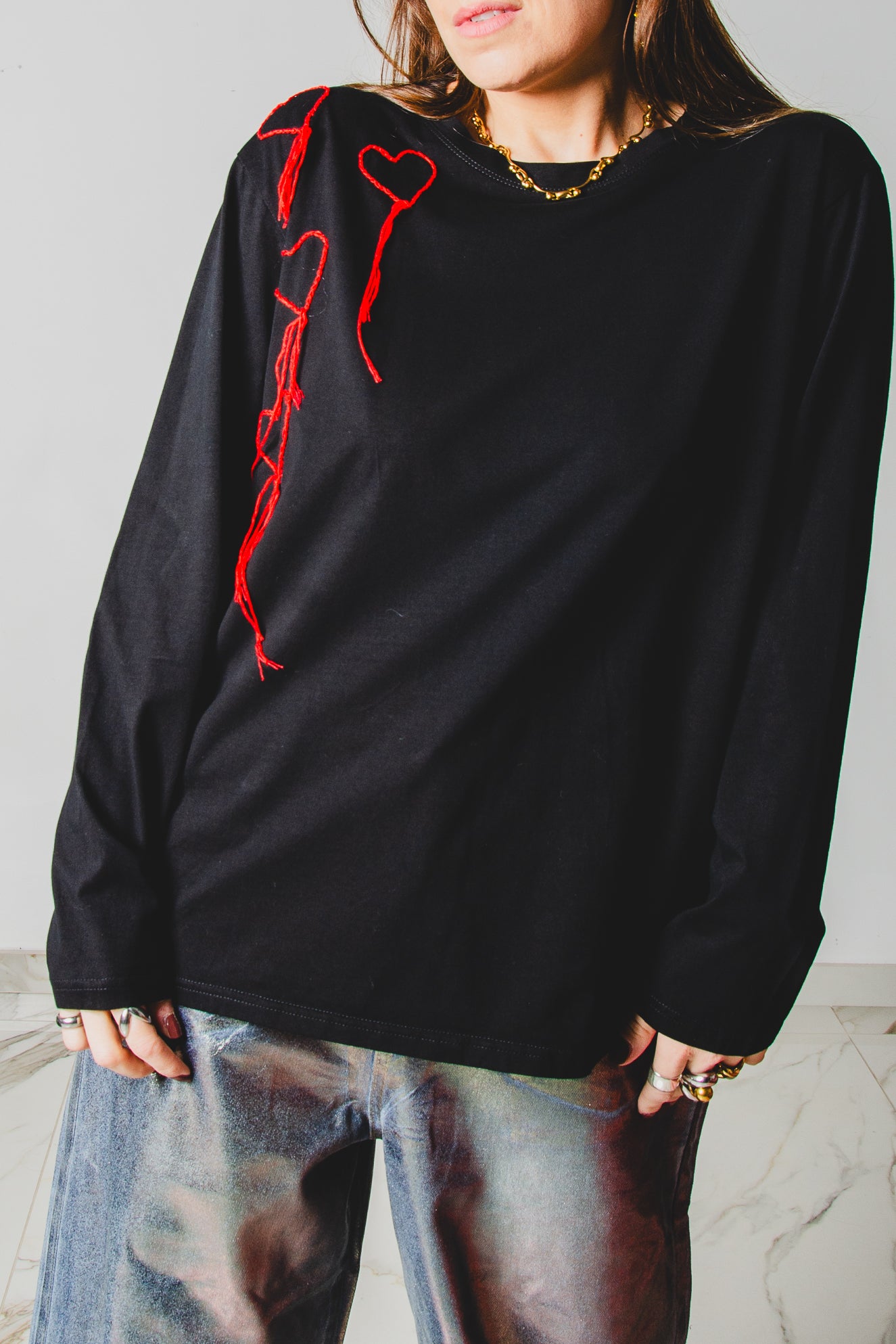 21 - Maglia oversize nera a maniche lunghe in cotone XXL ricamata a mano con cuori rossi