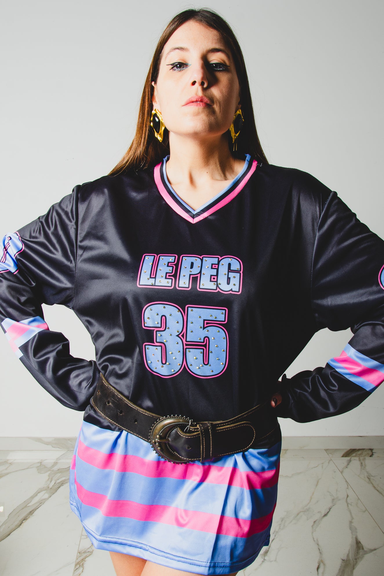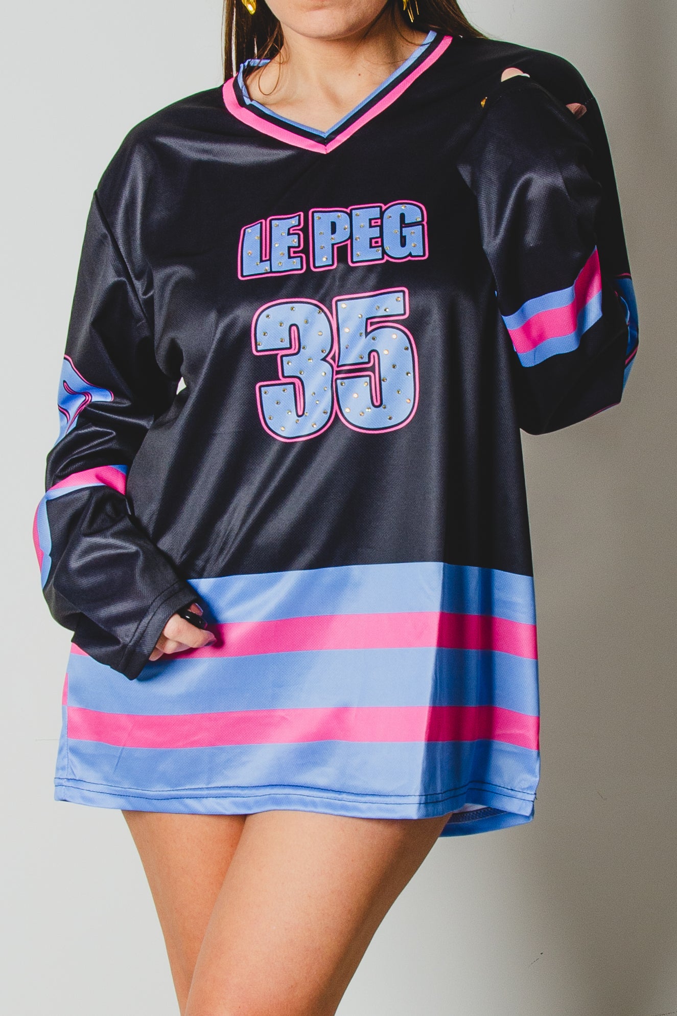 32 - T-Shirt Sportiva a Maniche Lunghe Nera e azzurra Le Peg 35 con strass Tg L