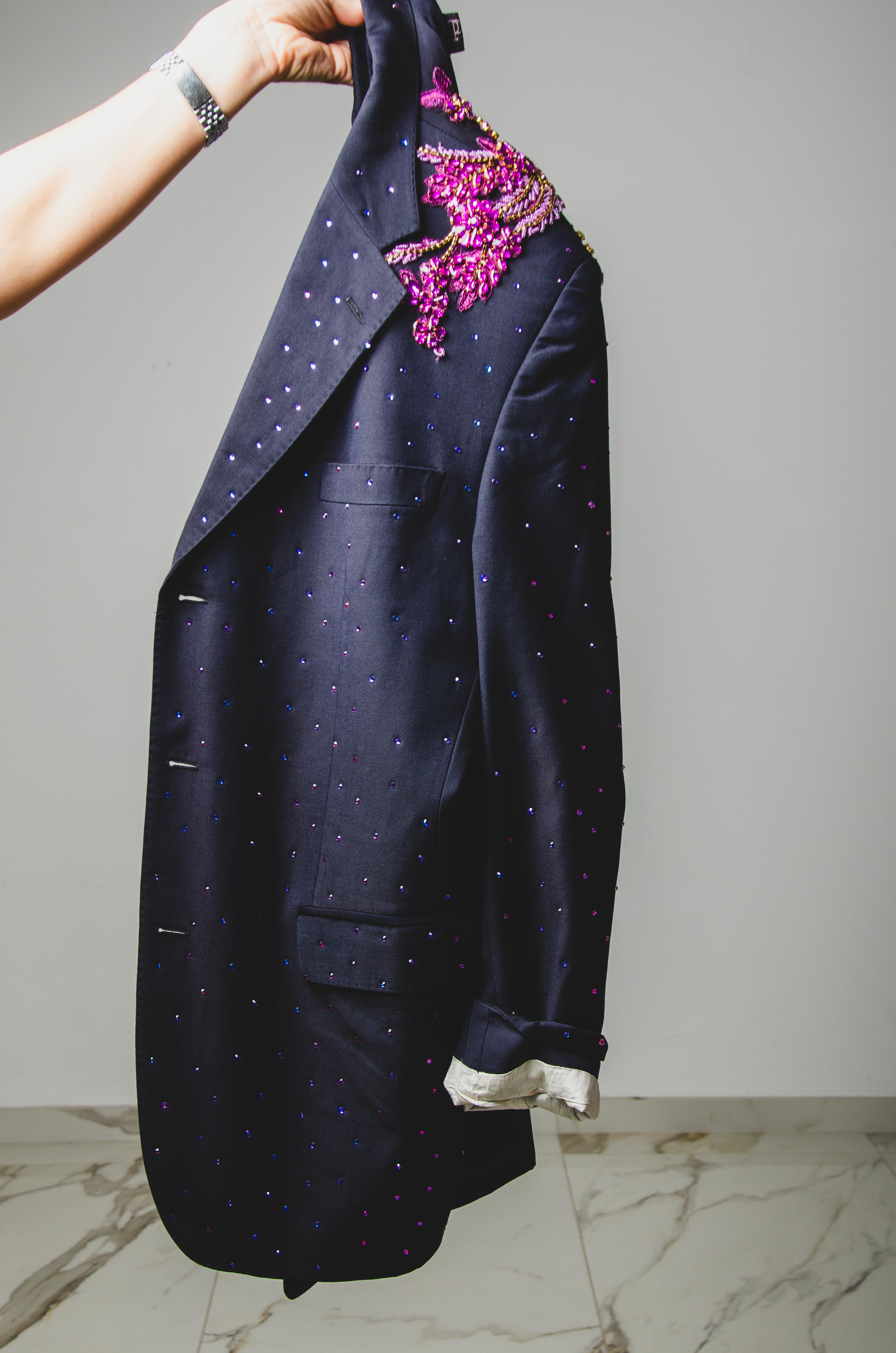 400 ARMANI double-breasted grey jacket with silver rhinestones in pure lightweight virgin wool with rhinestone illustration and colours - Size 50