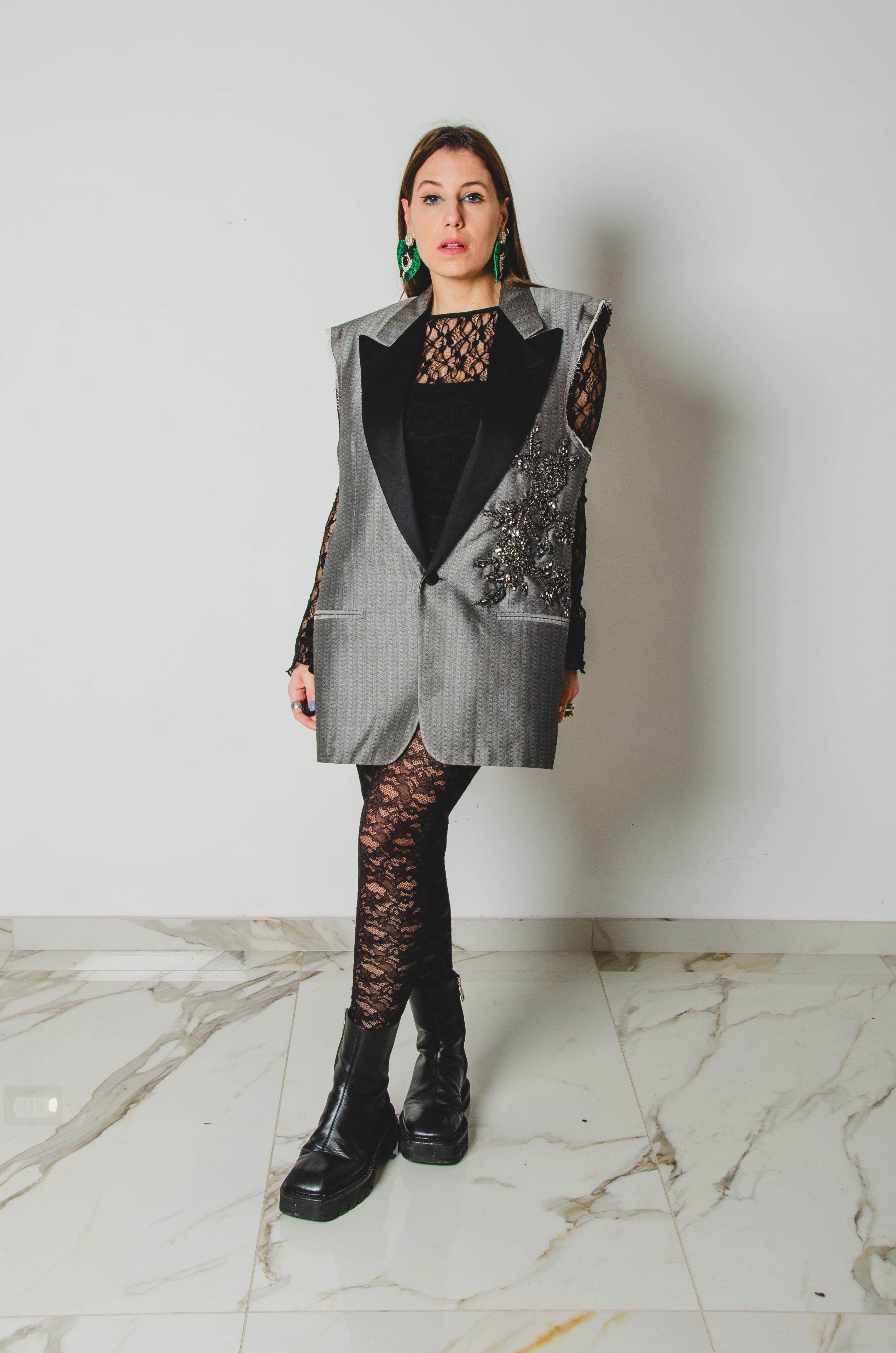400 ARMANI double-breasted grey jacket with silver rhinestones in pure lightweight virgin wool with rhinestone illustration and colours - Size 50