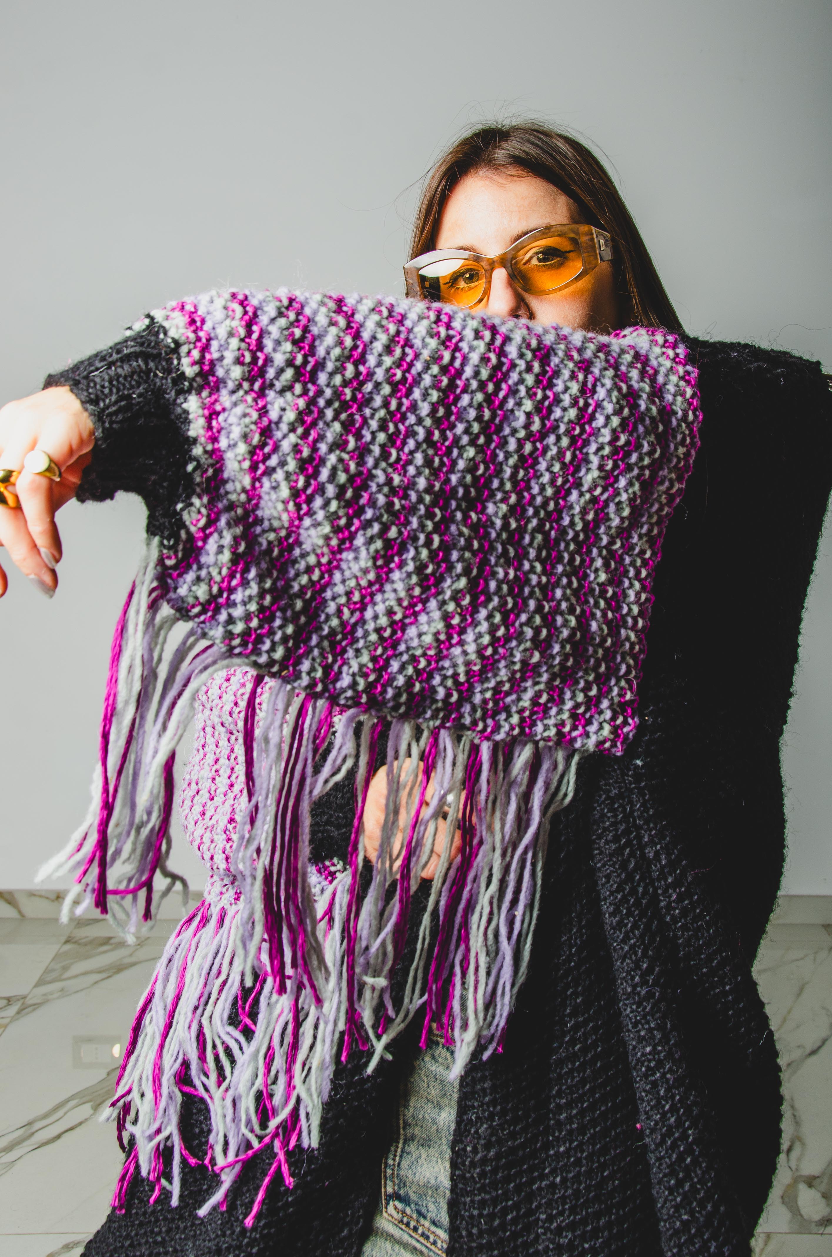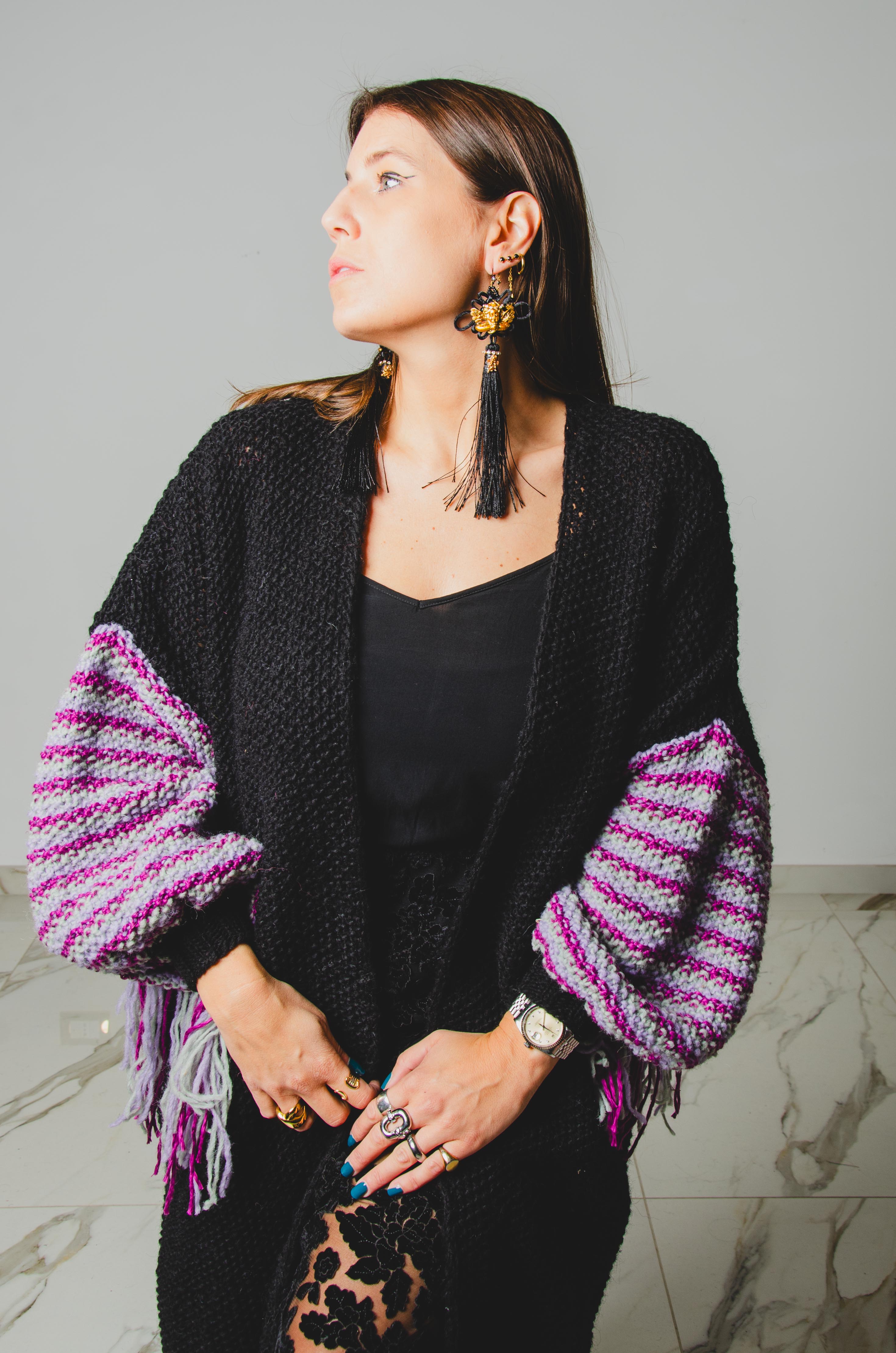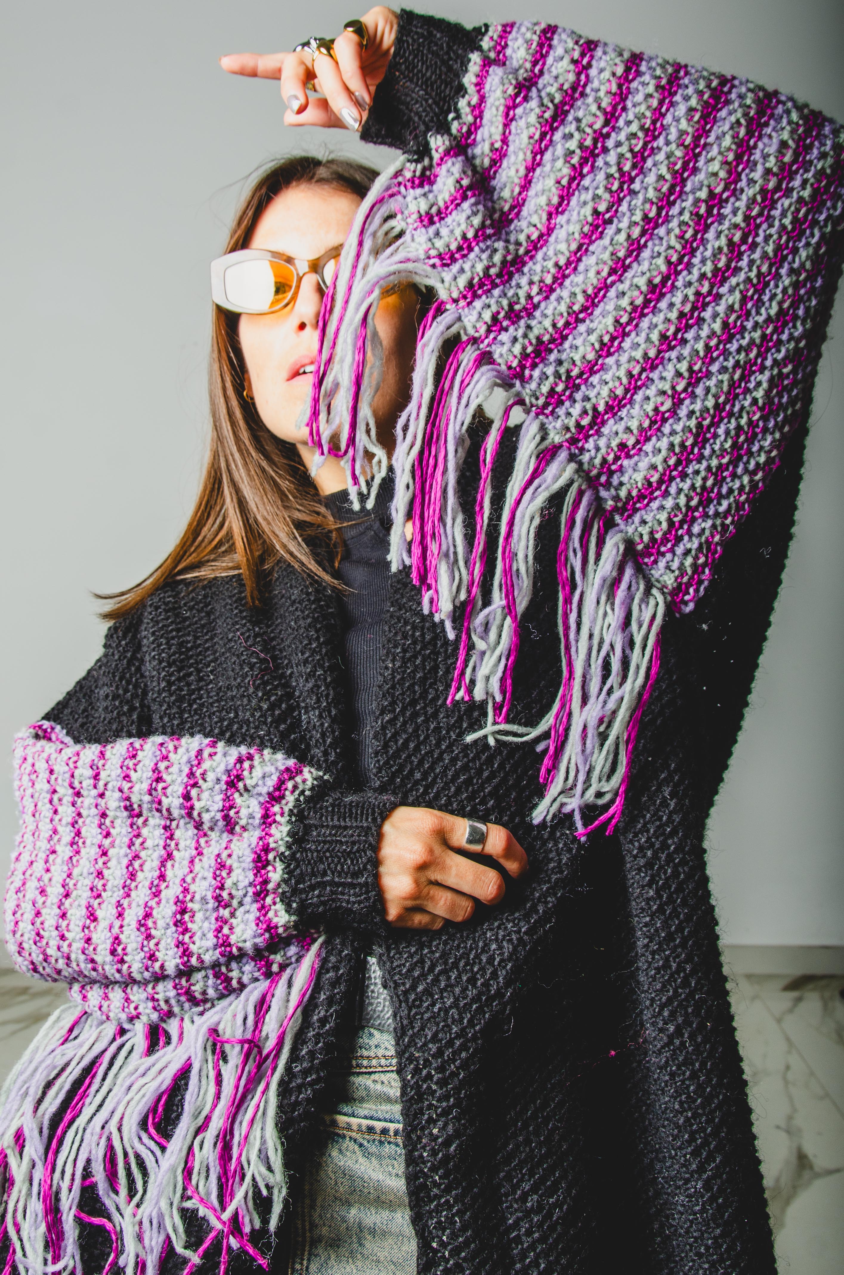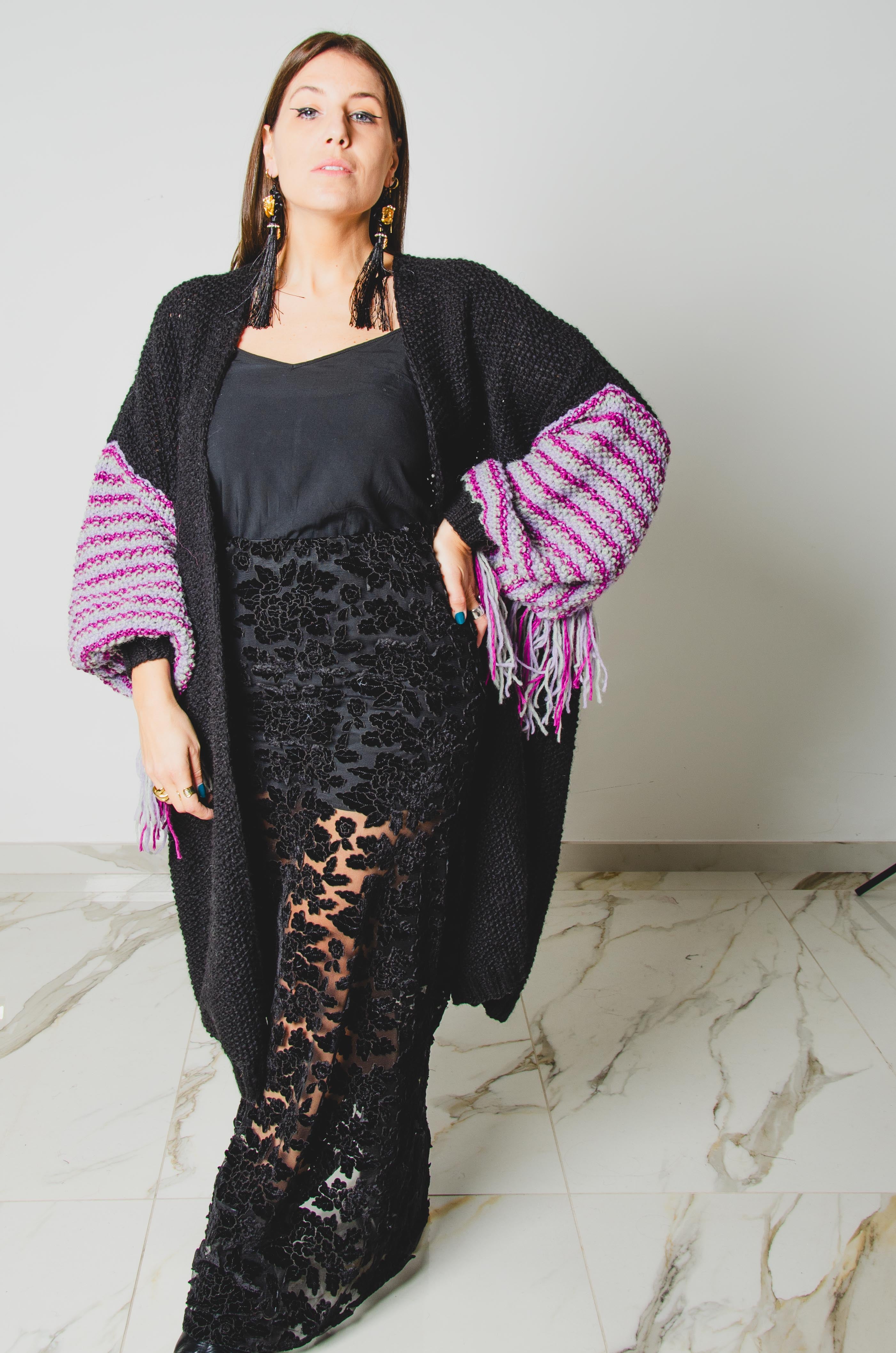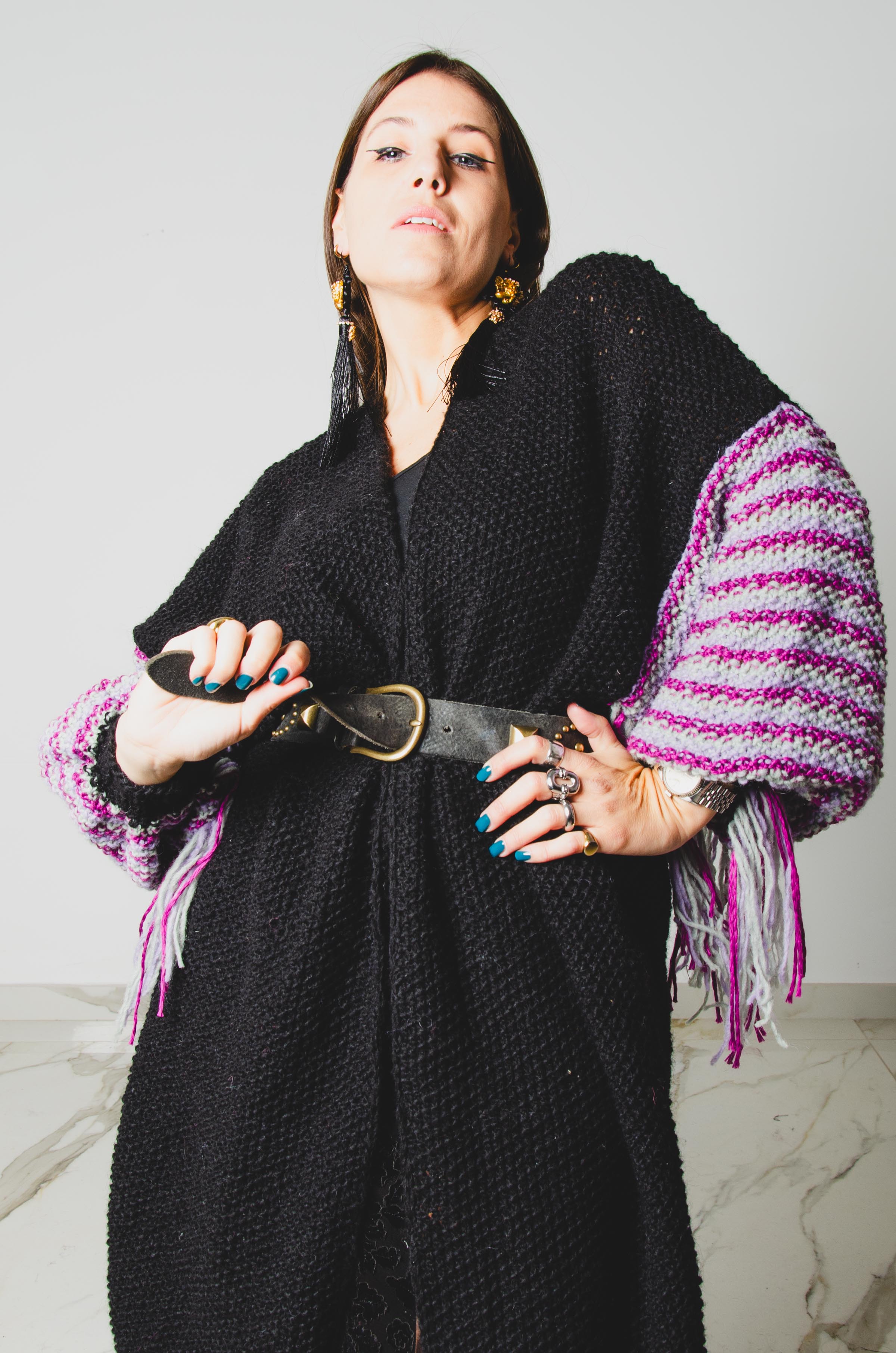 Questo cardigan lungo è un capo unico, realizzato interamente a mano da donne artigiane serbe con lana locale proveniente dalla Serbia. La base nera viene valorizzata da maniche lavorate a maglia multicolor nei toni del lilla, viola e verde, impreziosite da lunghe frange che aggiungono movimento e carattere al design.