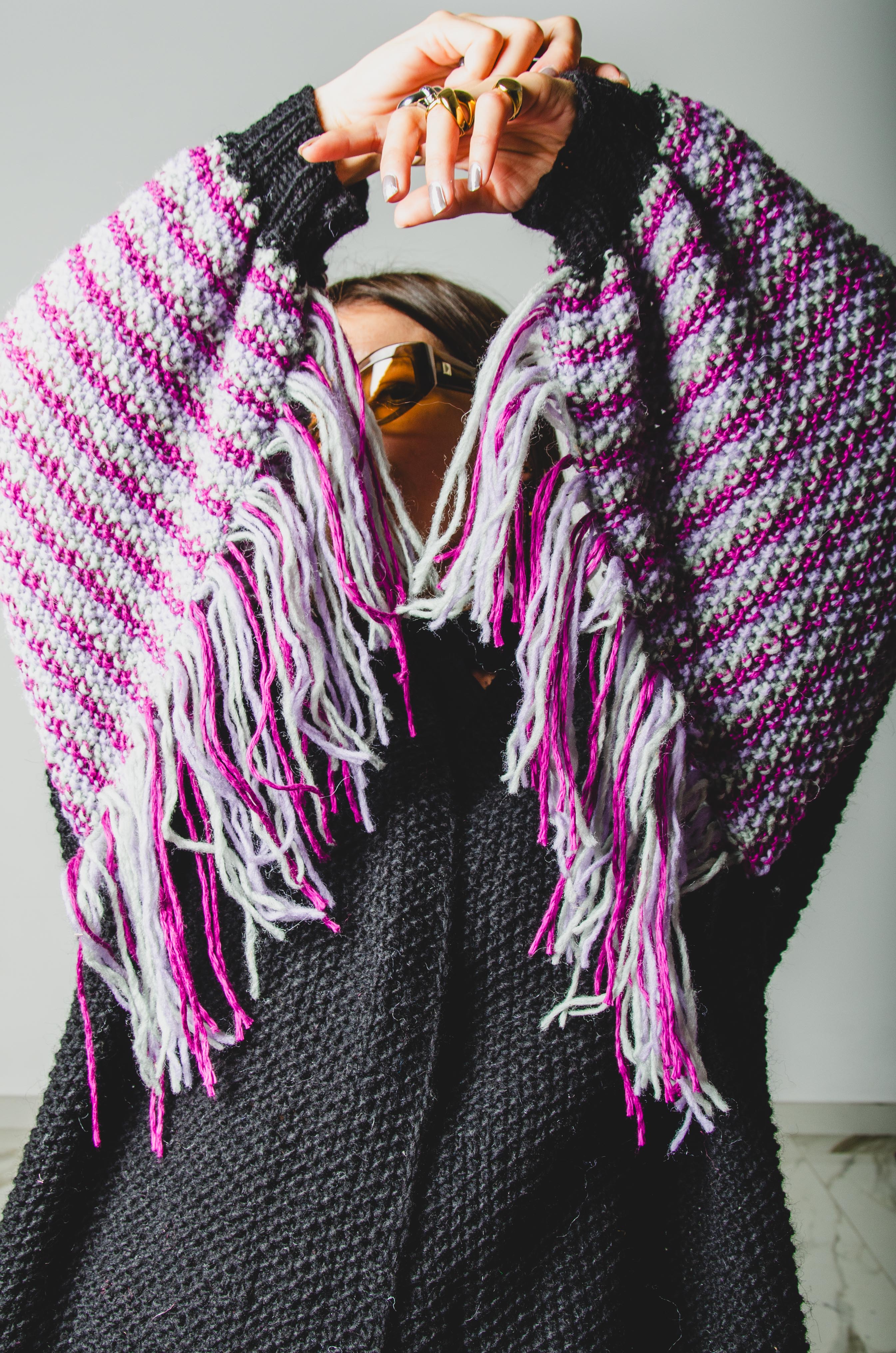 Caratteristiche: base nera, maniche multicolor lilla/viola/verde, frange decorative, vestibilità oversize taglia unica