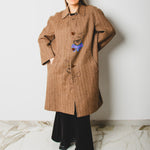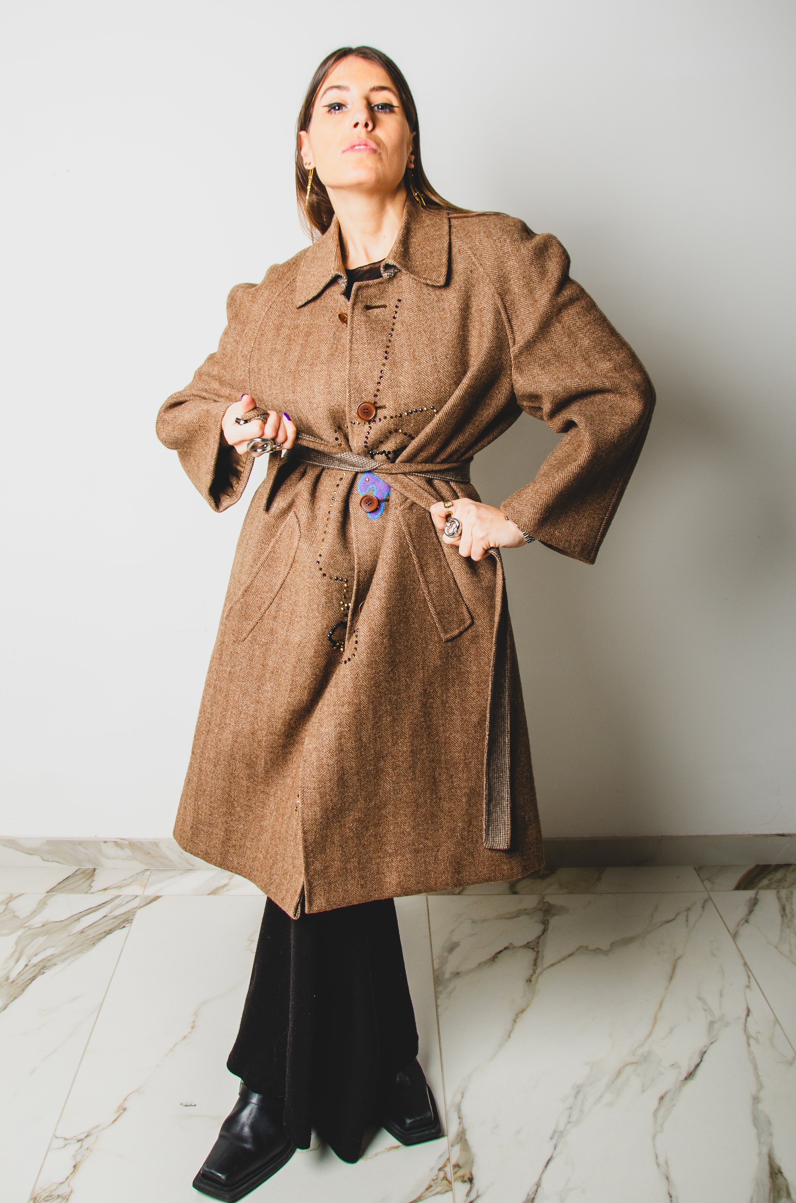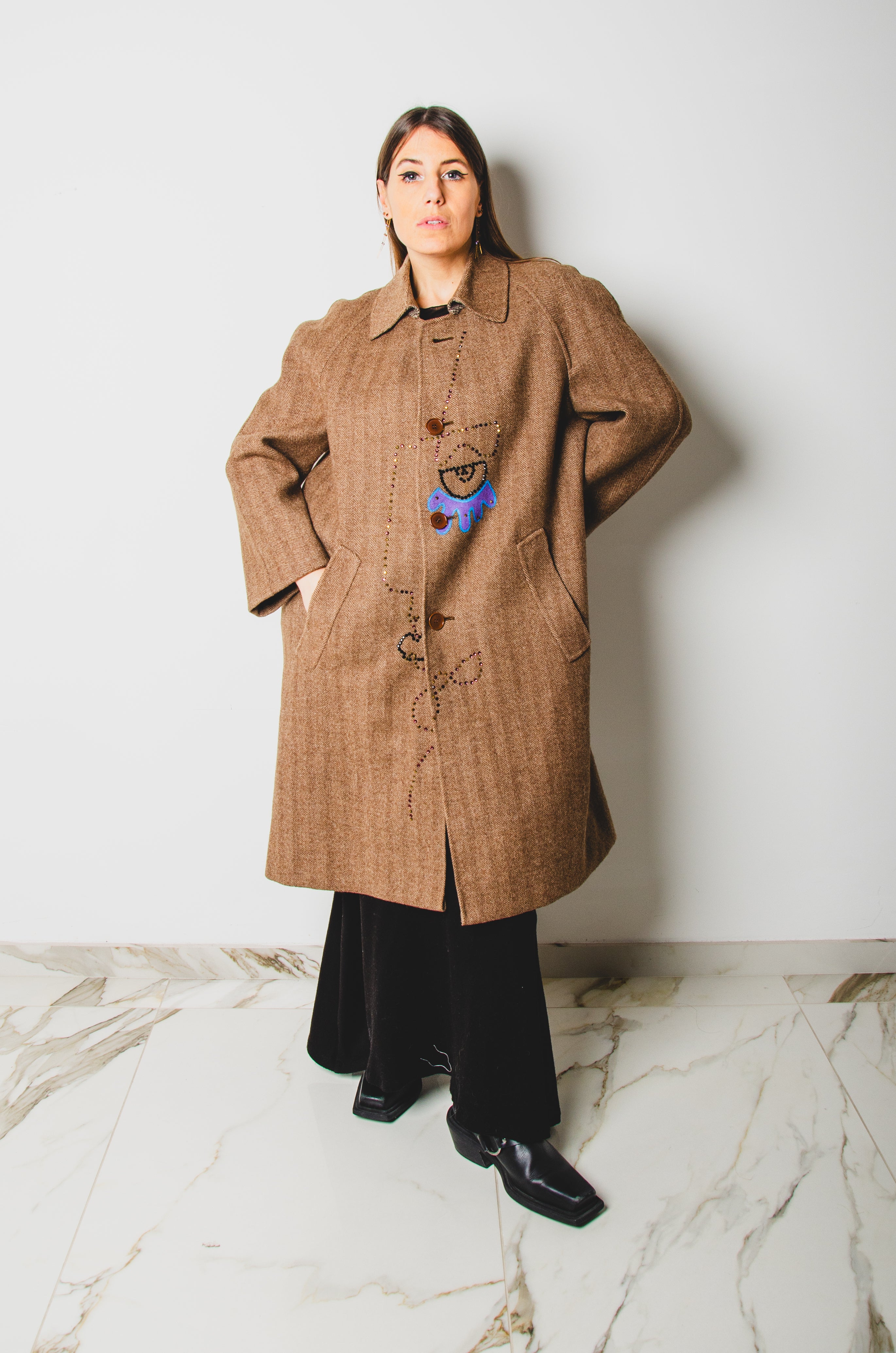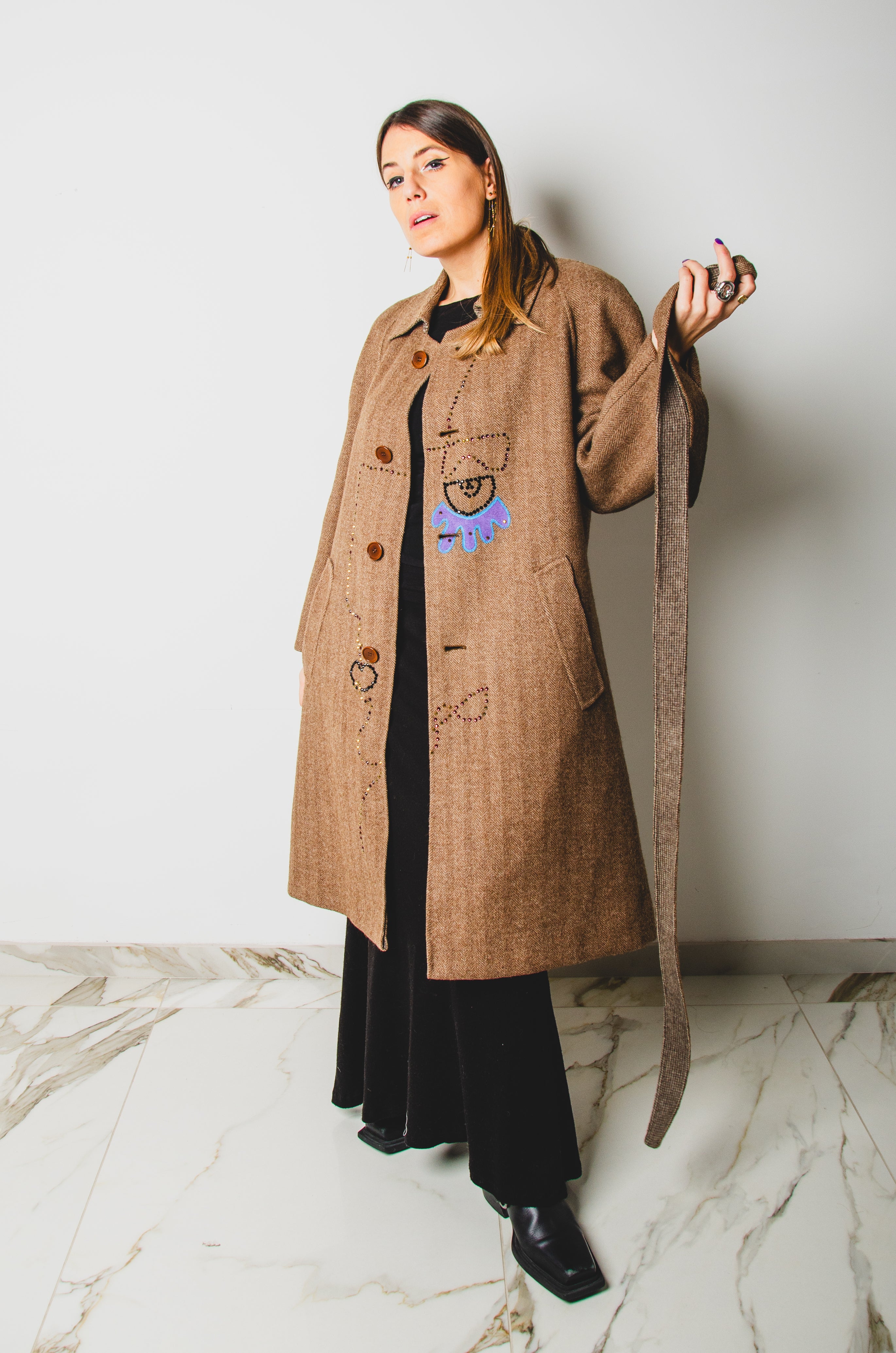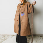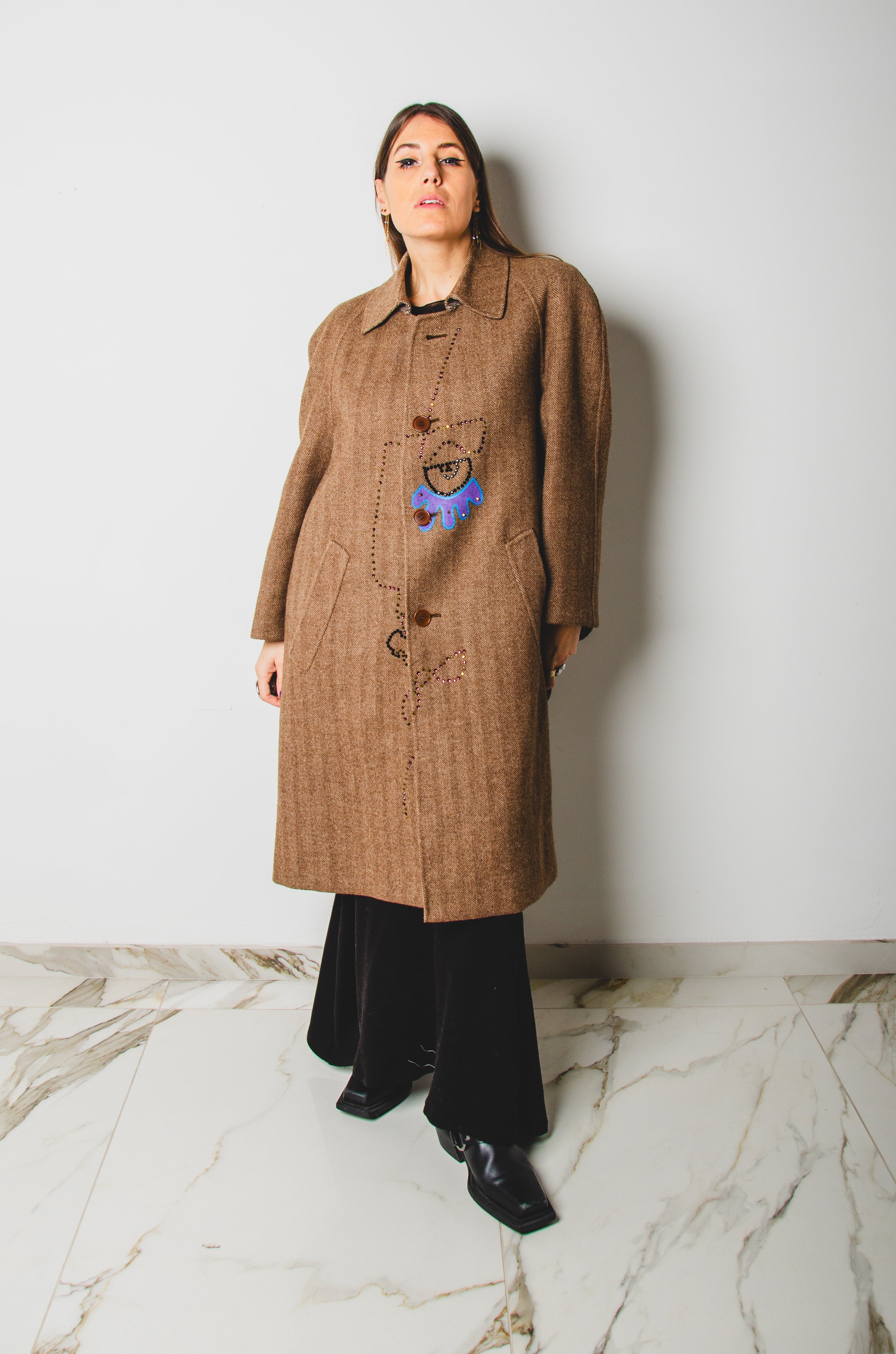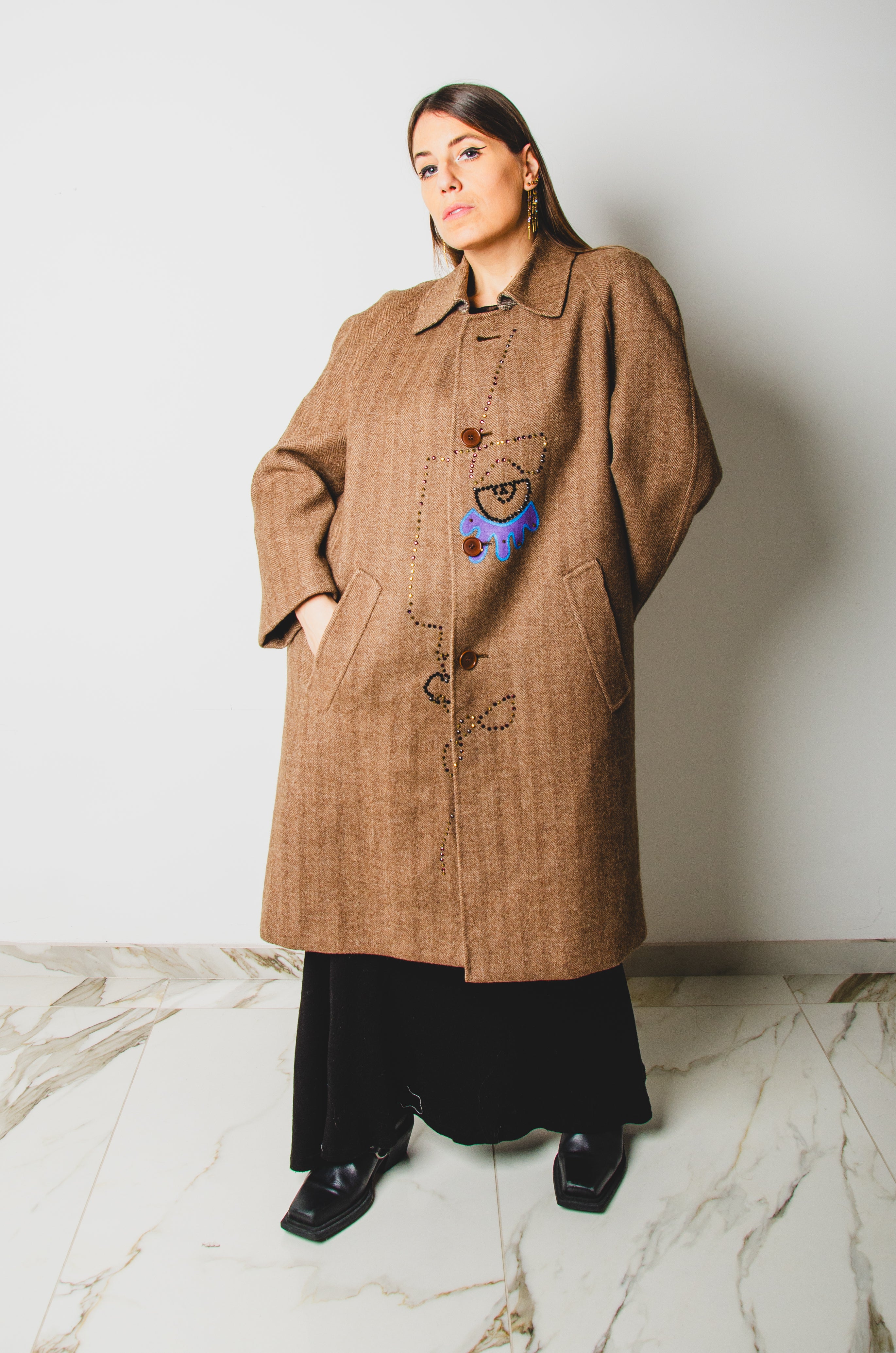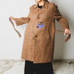 Vintage upcycling trench coat with raglan sleeves and cape with rhinestones and hand-painted illustration - size 50/52