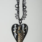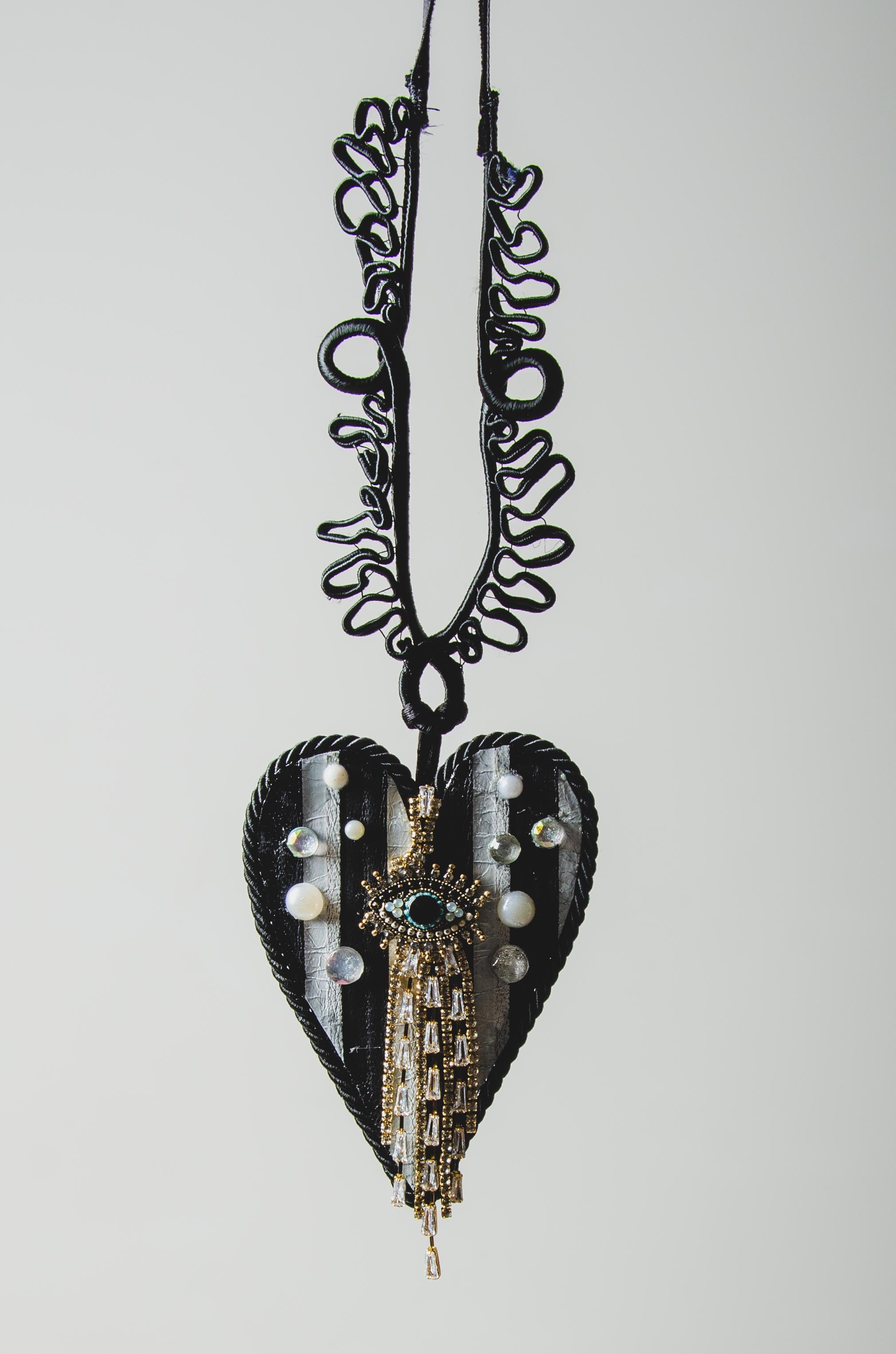 118 Collana 100% Handmade con passamaneria nera e ciondolo a cuore piatto grande con occhio- in pelle a righe bianca e nera