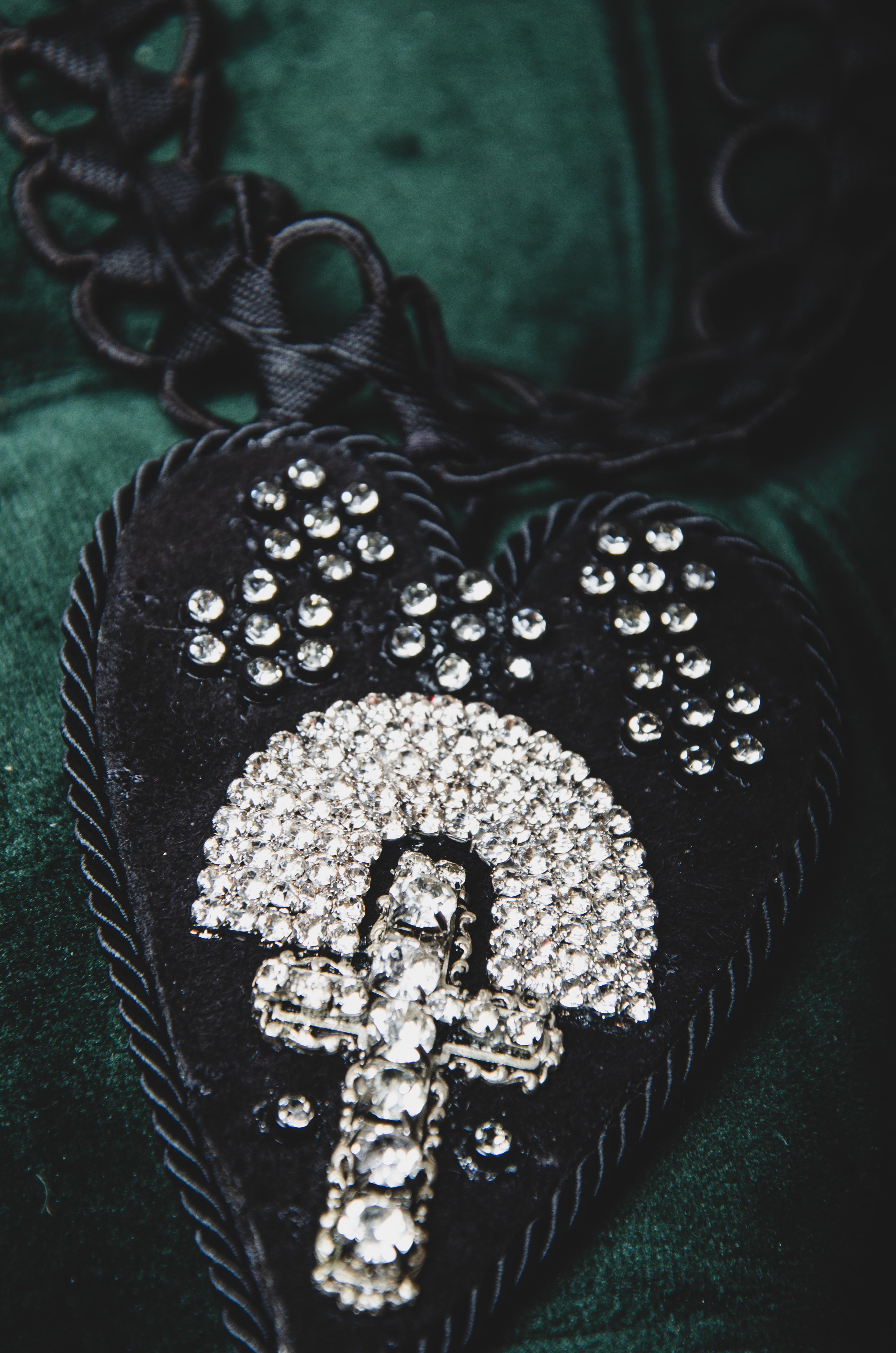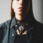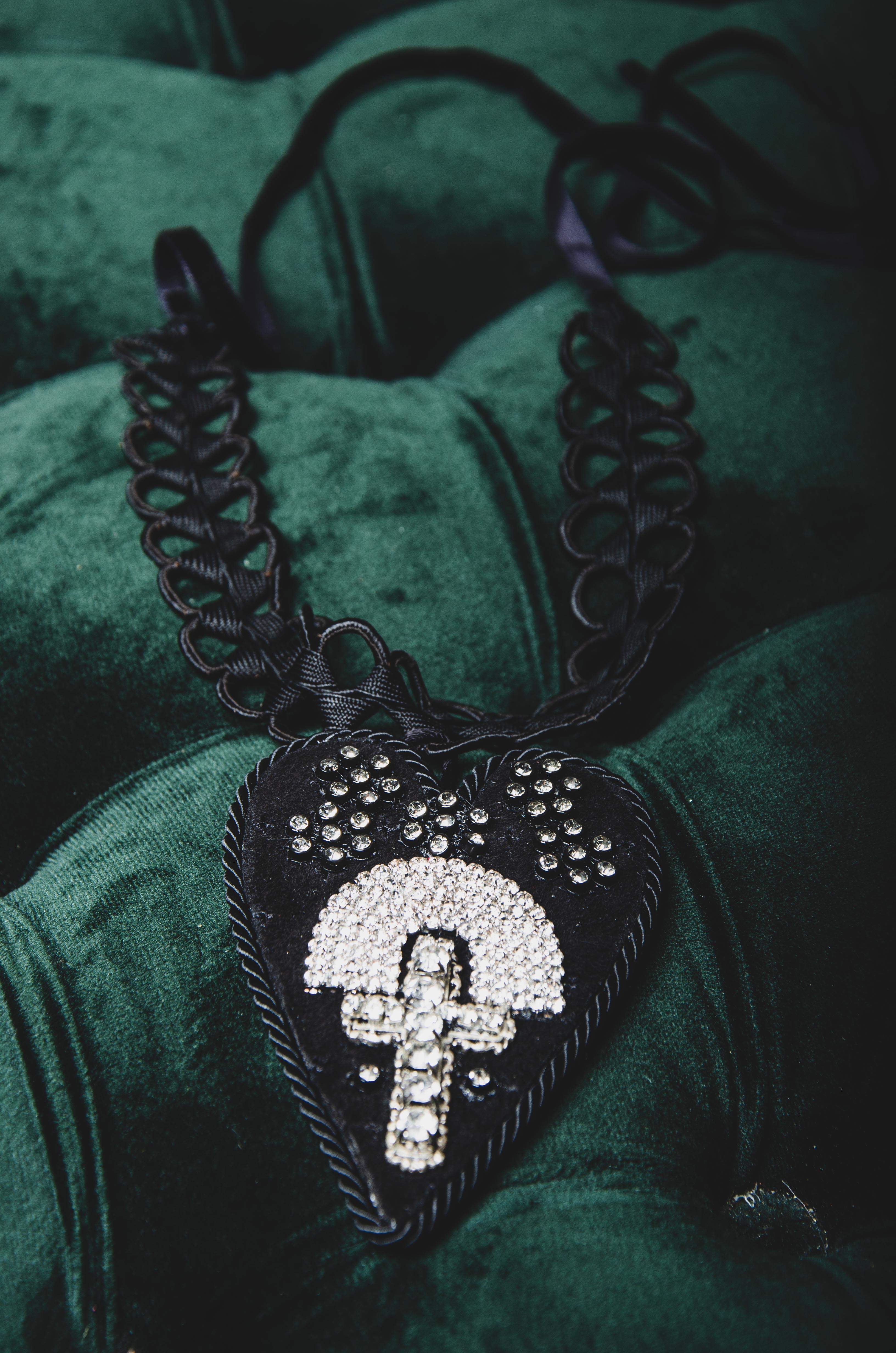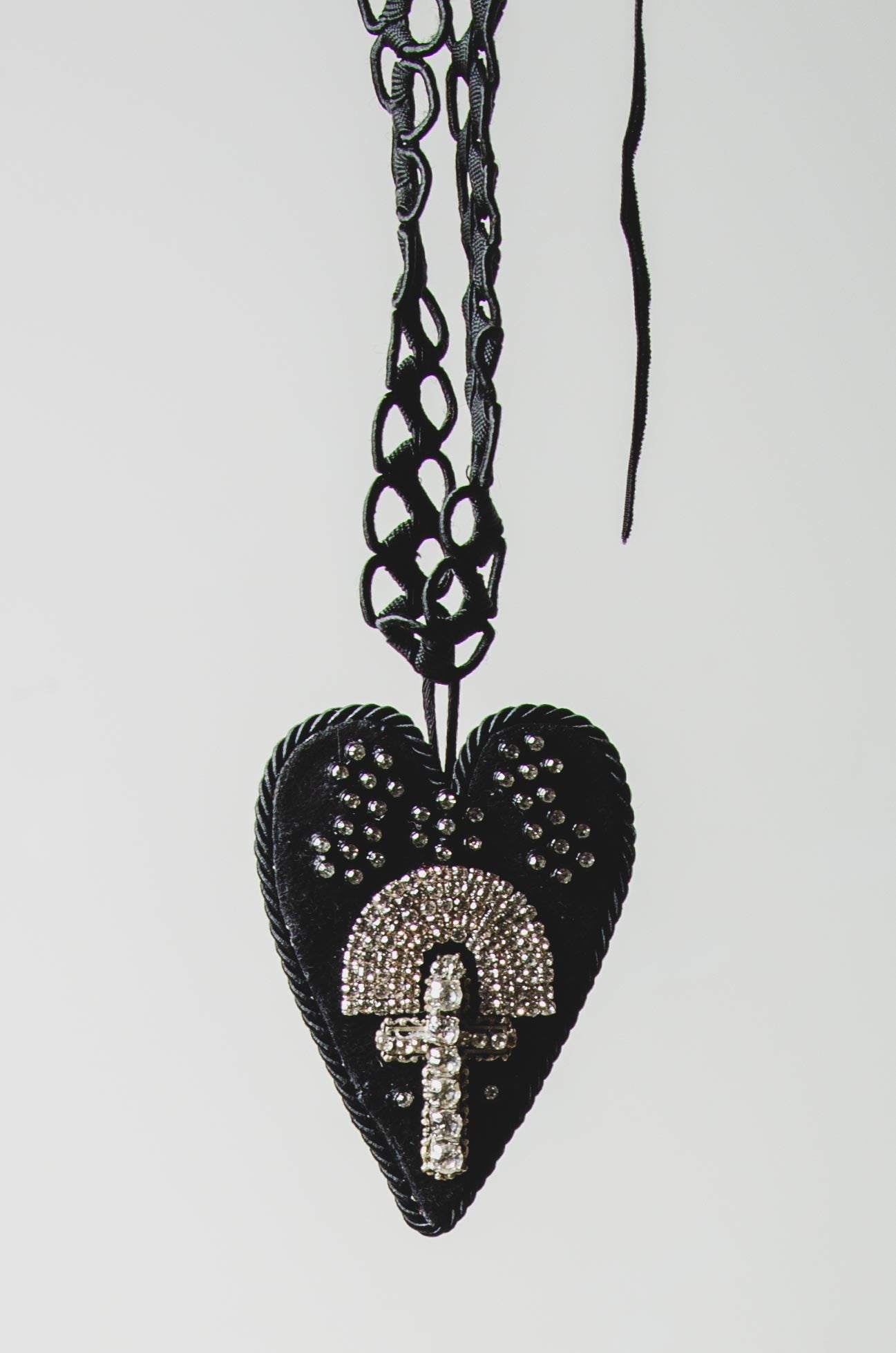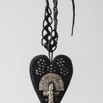 124 Collana 100% Handmade con passamaneria nera e cuore centrale in pelle nera con croce argento