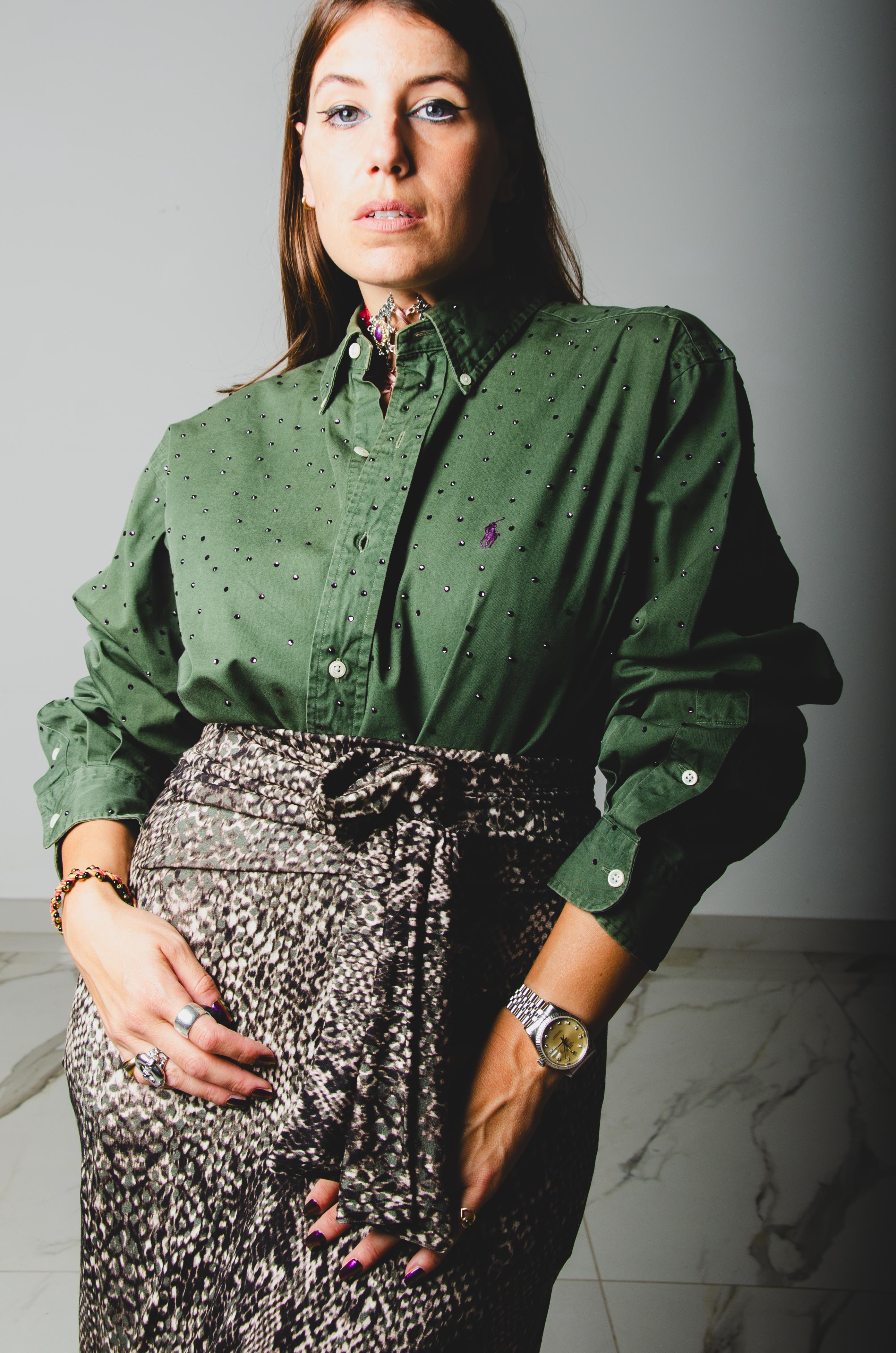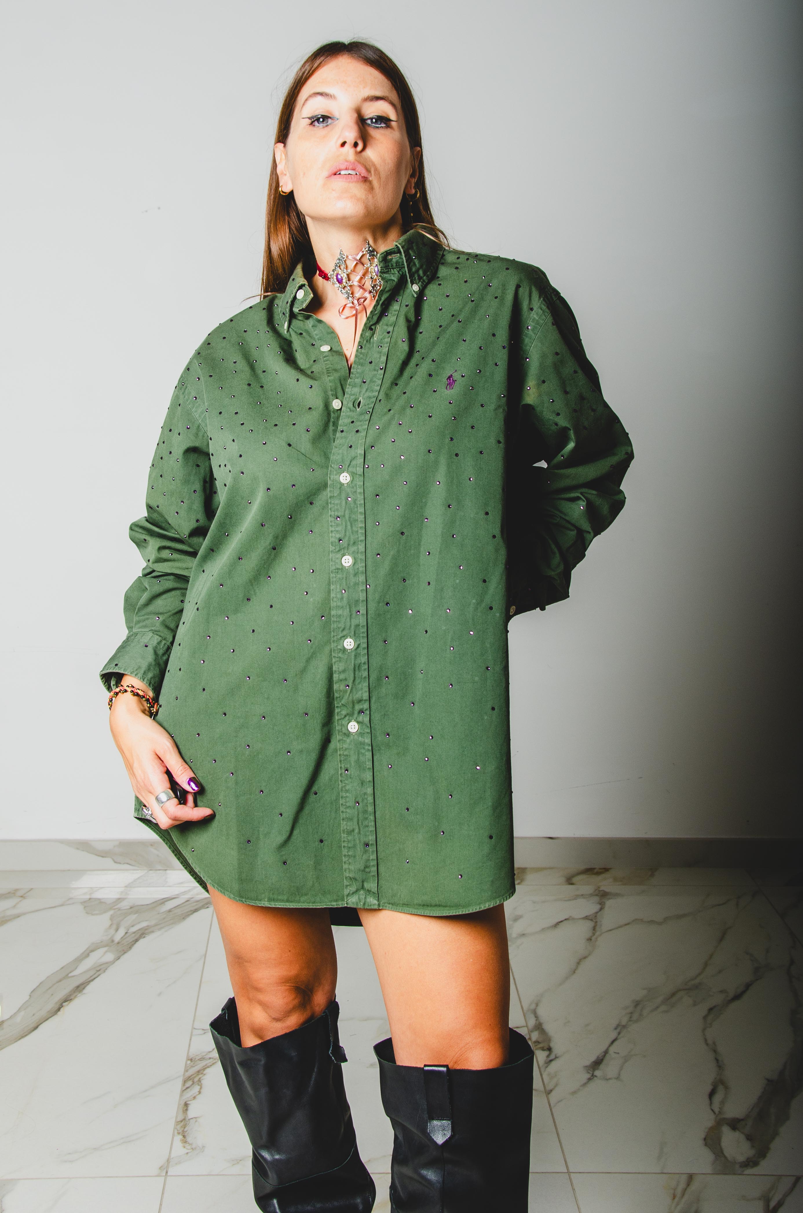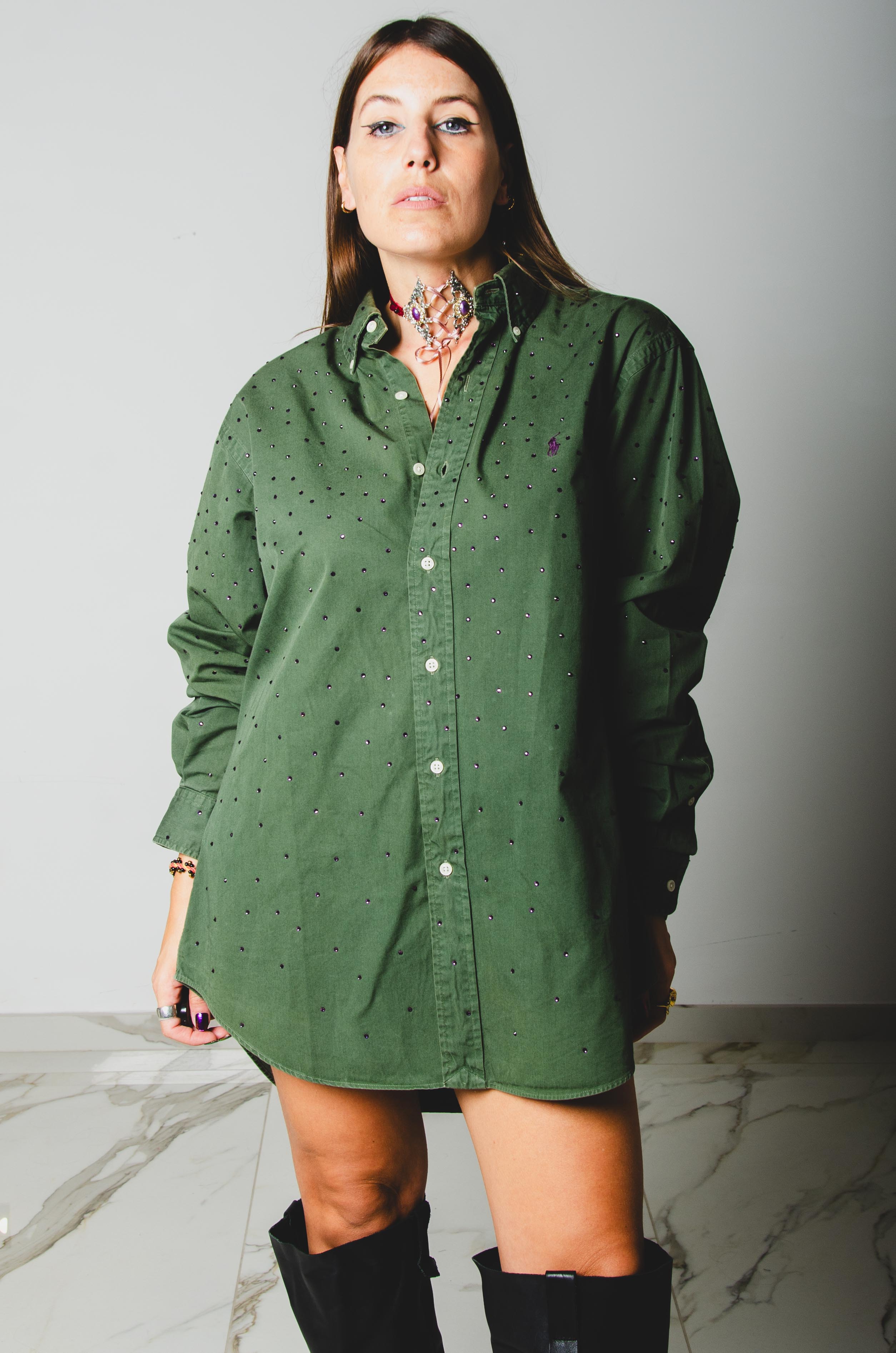 167 Camicia vintage maschile verde RALPH LAUREN in cotone pesante con CIRCA 800 strass viola Tg L