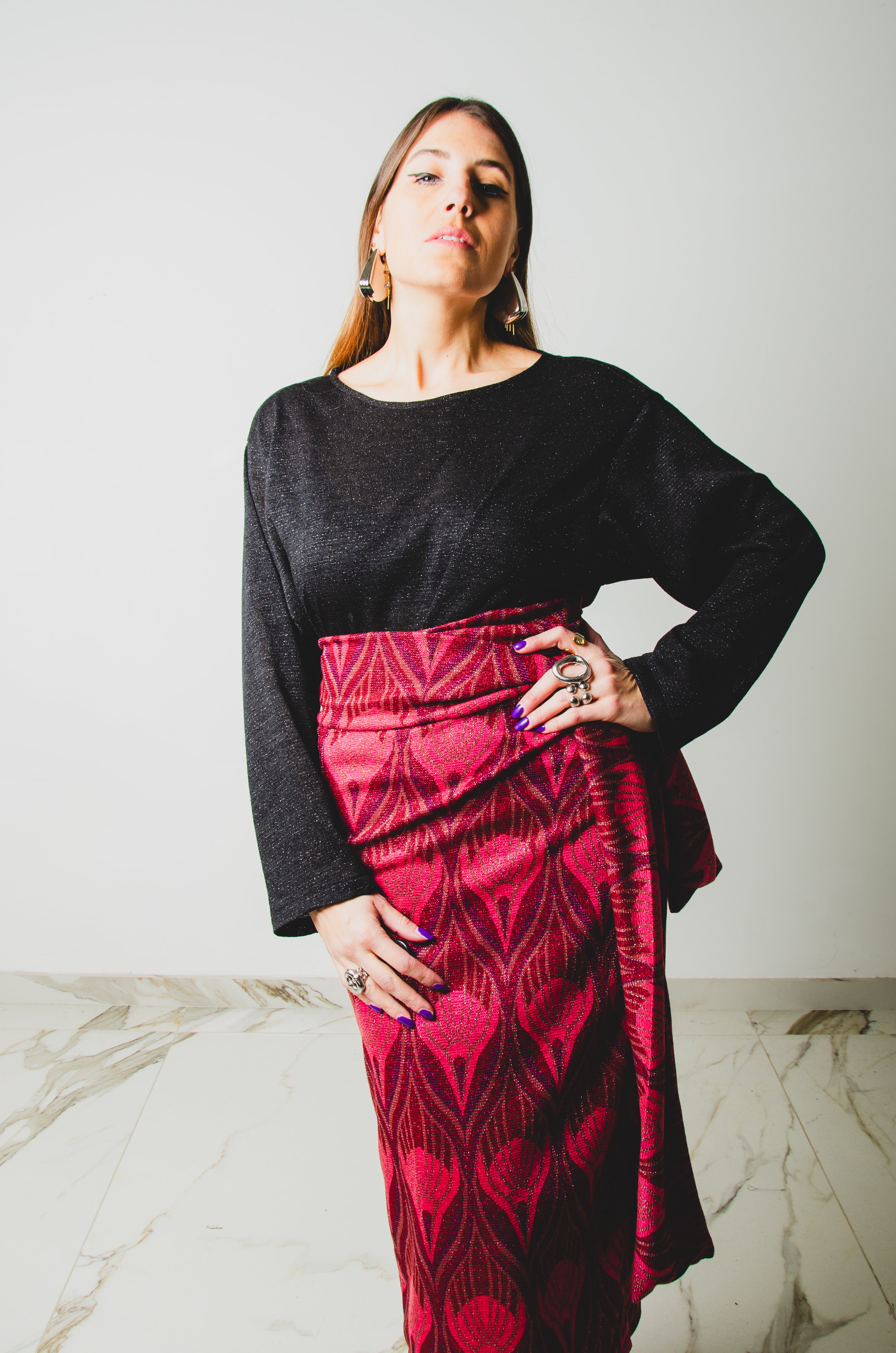 In più stiamo realizzando capi che si possano indossare indistintamente dalla propria taglia, come queste gonne che vestono dalla tg 36 alla tg 46, fino alla 48/50 se realizzate in tessuto elastico e si chiudono con la cintura.