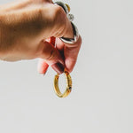La superficie presenta una texture luminosa e leggermente materica, capace di riflettere la luce con discrezione, rendendo questi orecchini perfetti sia per il giorno sia per la sera. Il formato a cerchio li rende un grande classico intramontabile, rivisitato in chiave vintage.