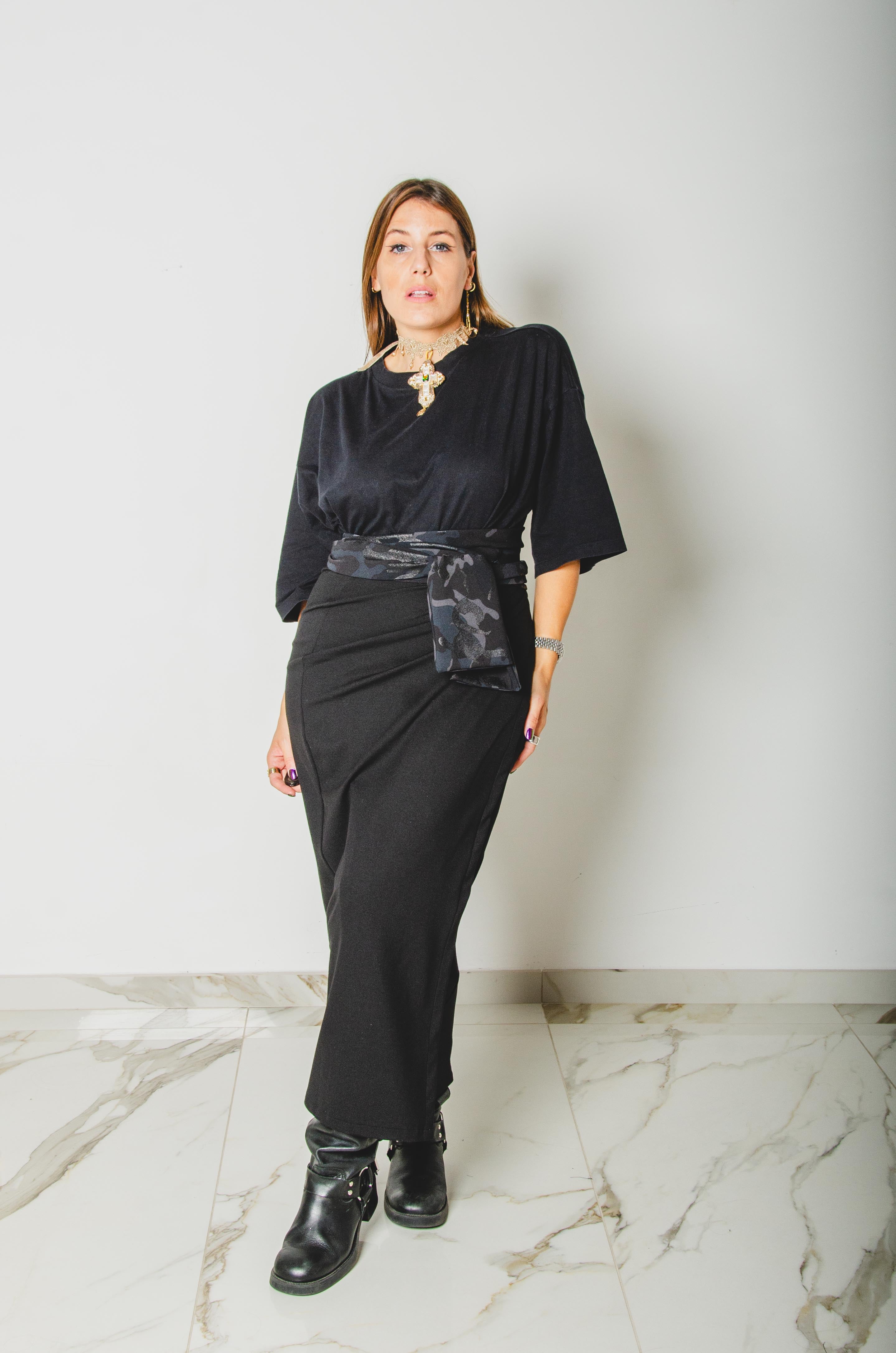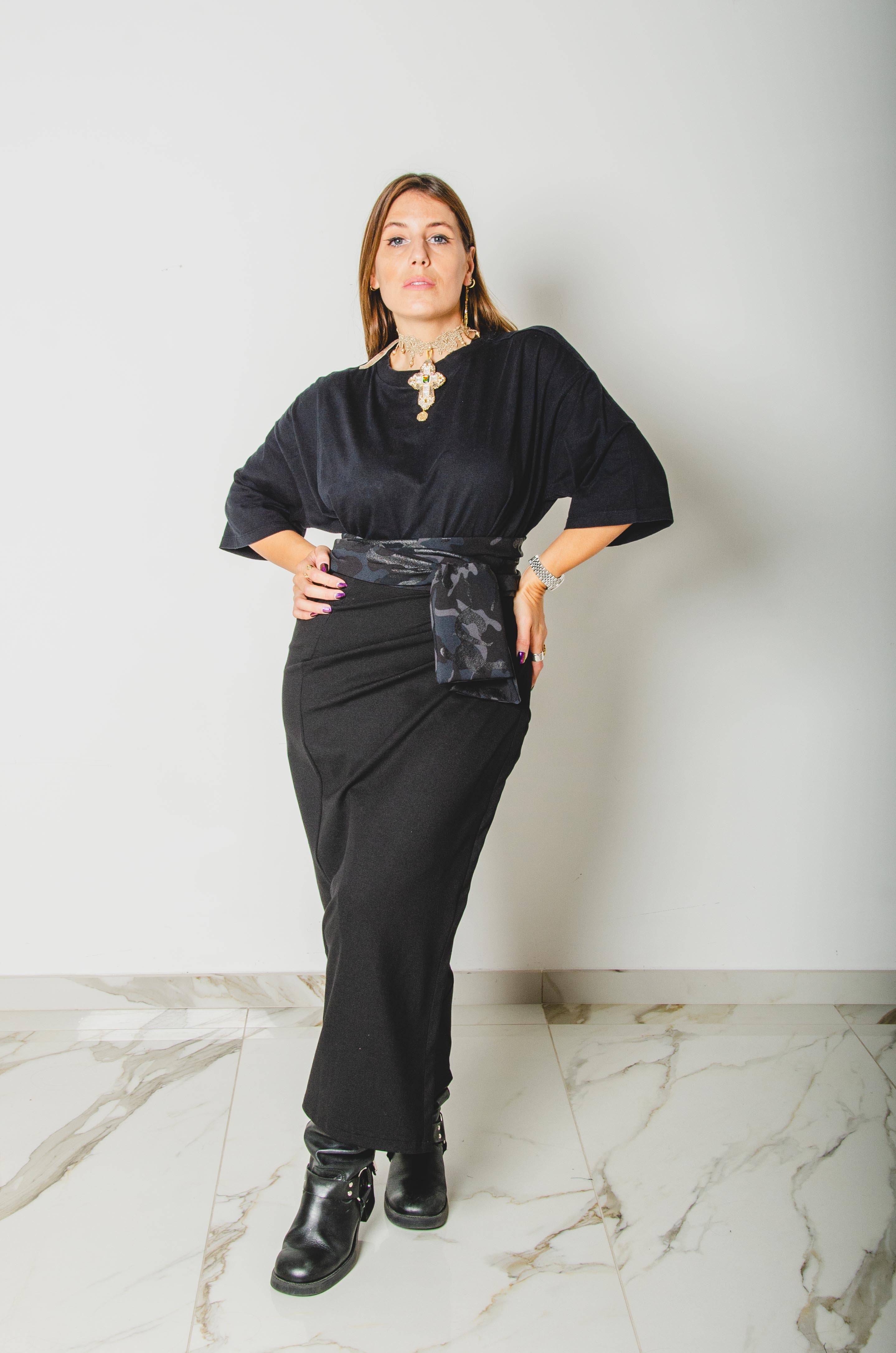 In più stiamo realizzando capi che si possano indossare indistintamente dalla propria taglia, come queste gonne che vestono dalla tg 36 alla tg 46, fino alla 48/50 se realizzate in tessuto elastico e si chiudono con la cintura.