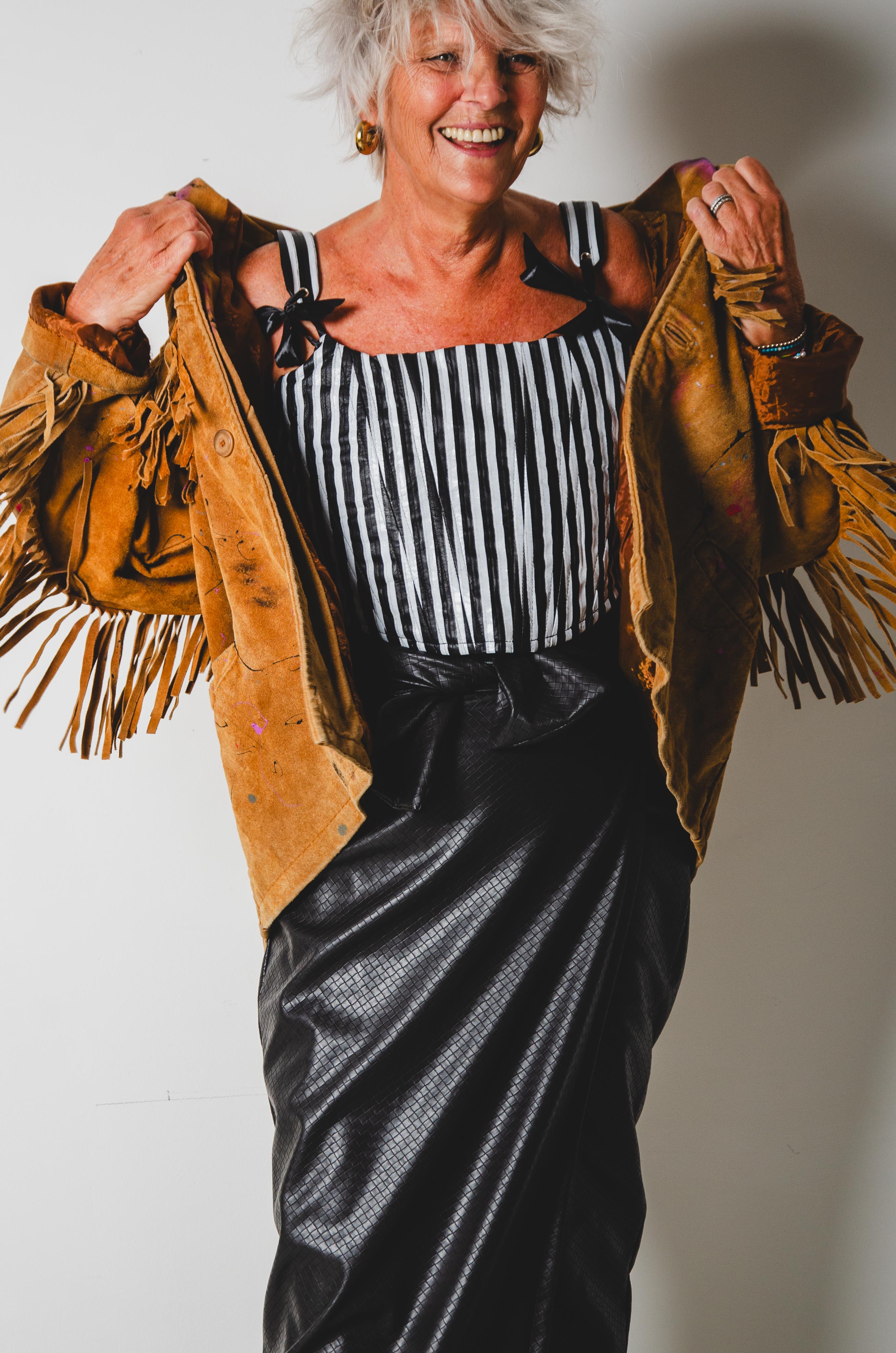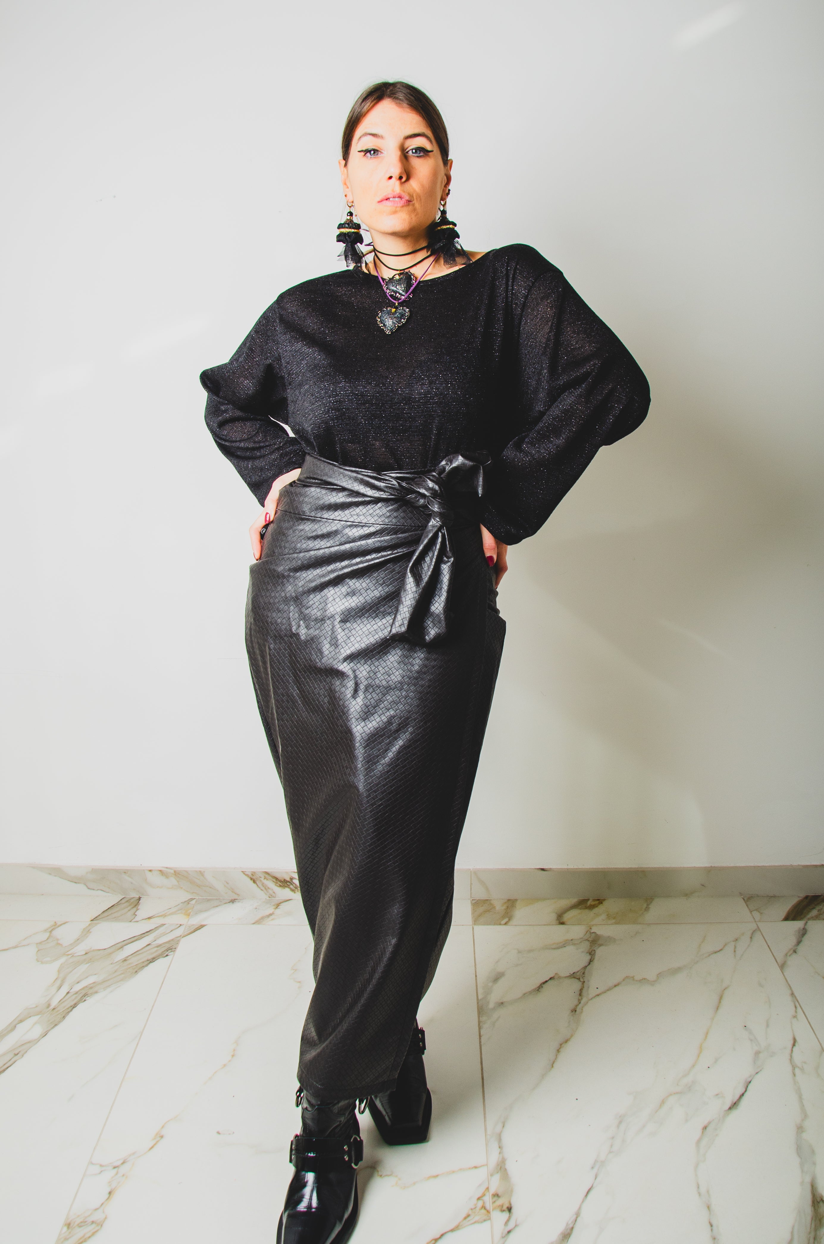 In più stiamo realizzando capi che si possano indossare indistintamente dalla propria taglia, come queste gonne che vestono dalla tg 36 alla tg 46, fino alla 48/50 se realizzate in tessuto elastico e si chiudono con la cintura.