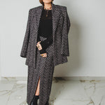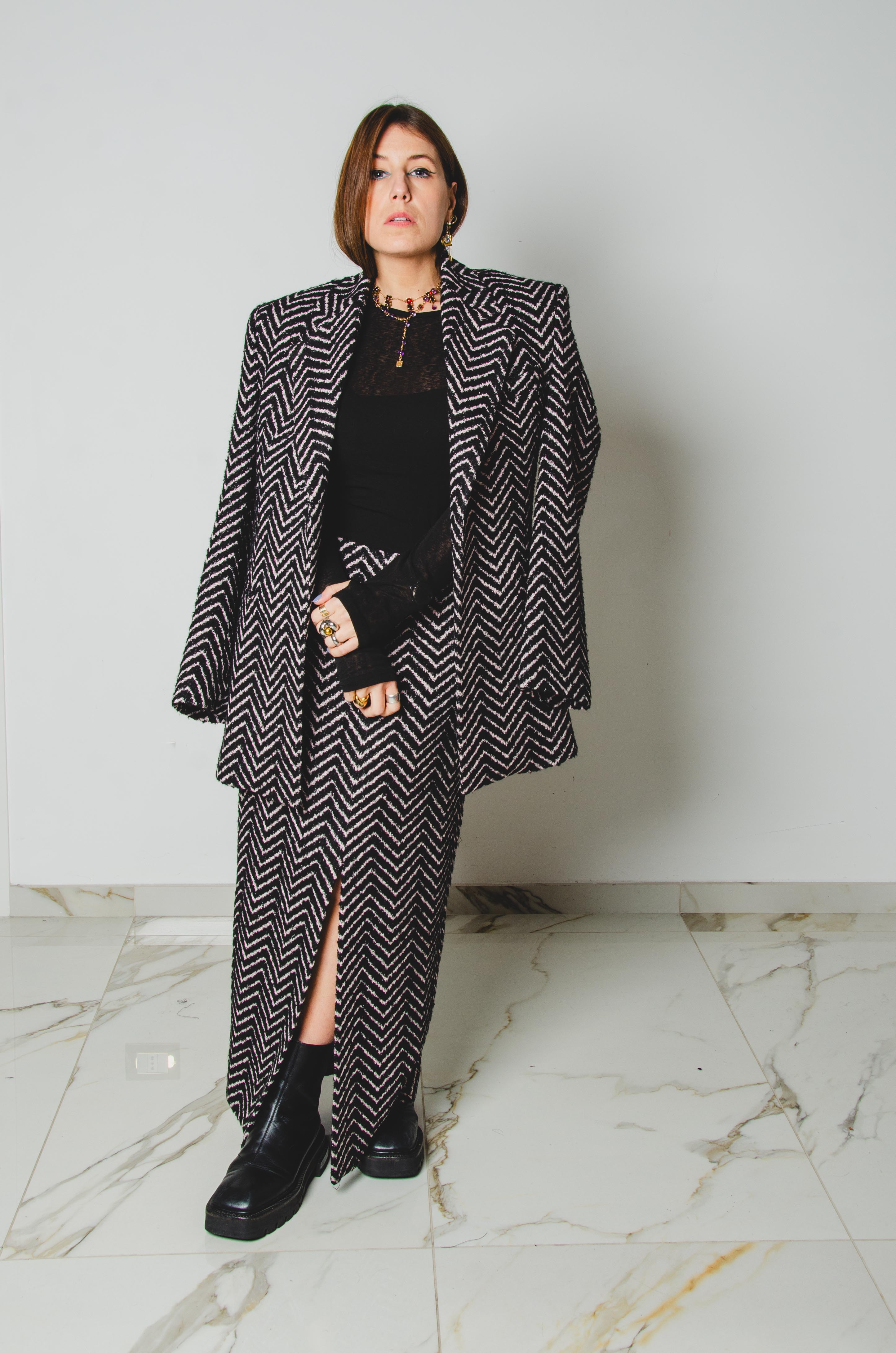 La silhouette è aderente sui fianchi, disegnata con equilibrio e rigore, mentre lo spacco centrale rompe la geometria con un gesto femminile e deciso, accompagnando il passo con naturalezza.