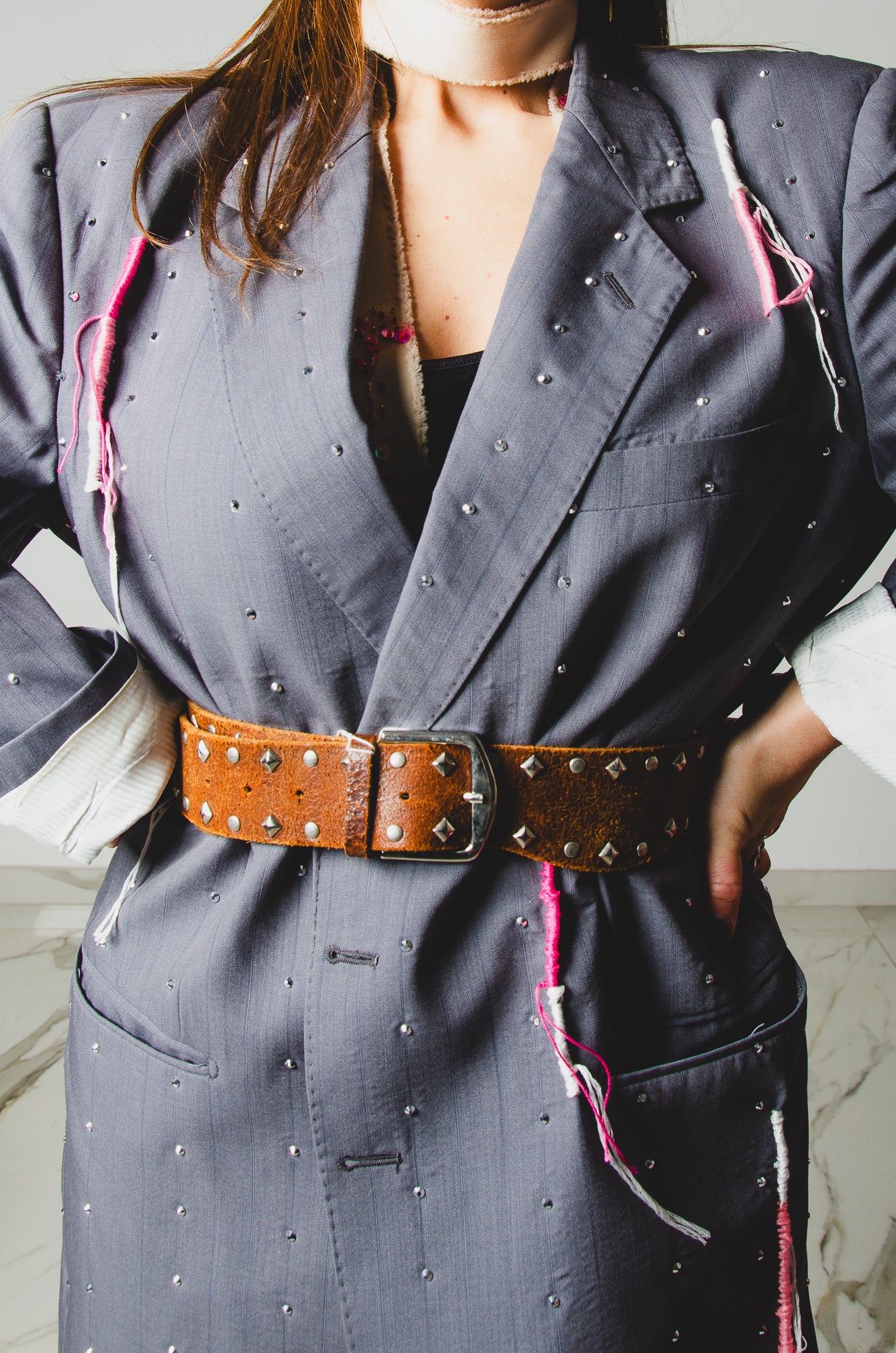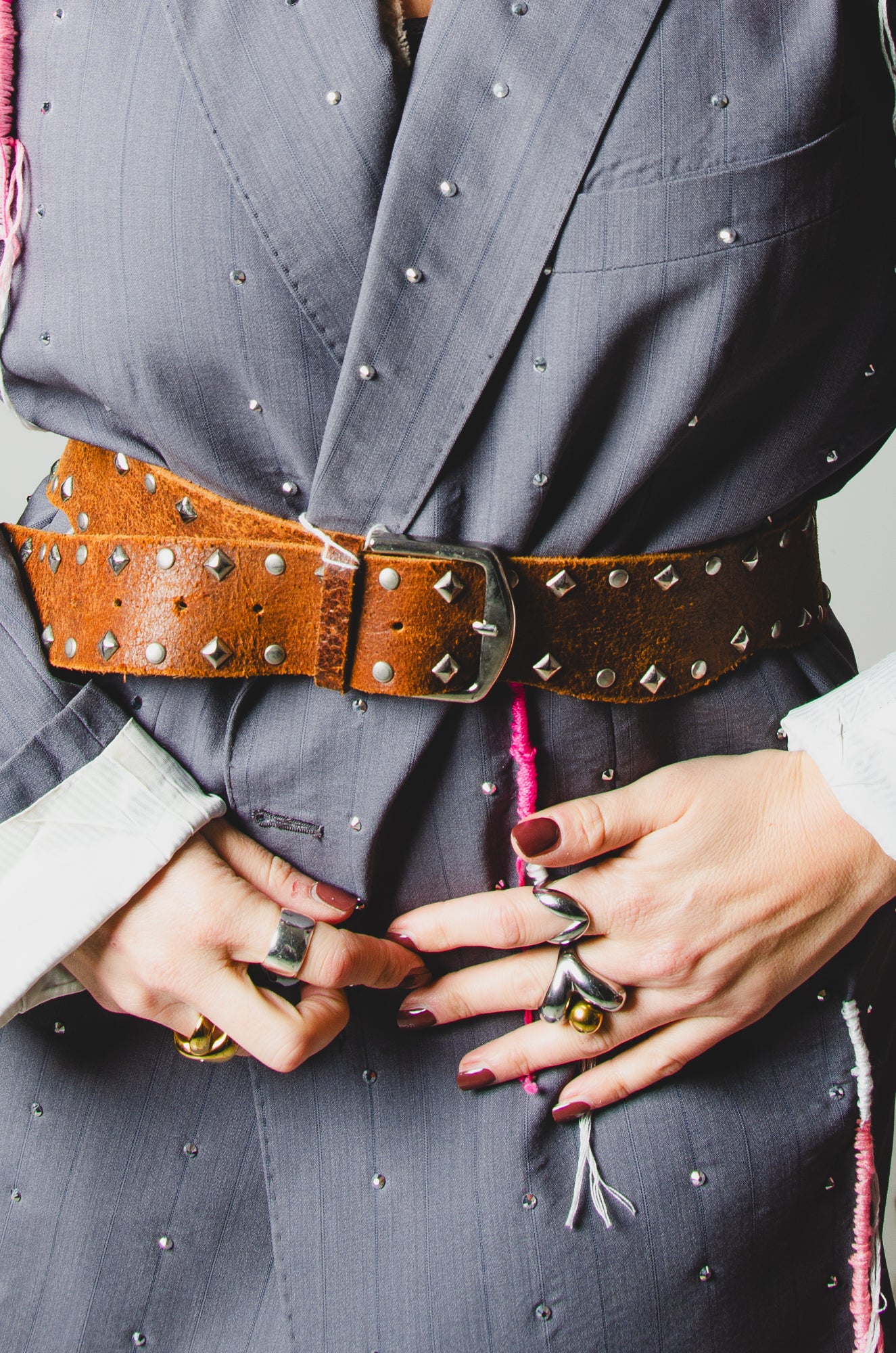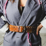 Questa cintura vintage in vera pelle scamosciata color cuoio è impreziosita da borchie metalliche applicate lungo tutta la fascia, per un effetto western-rock irresistibile.