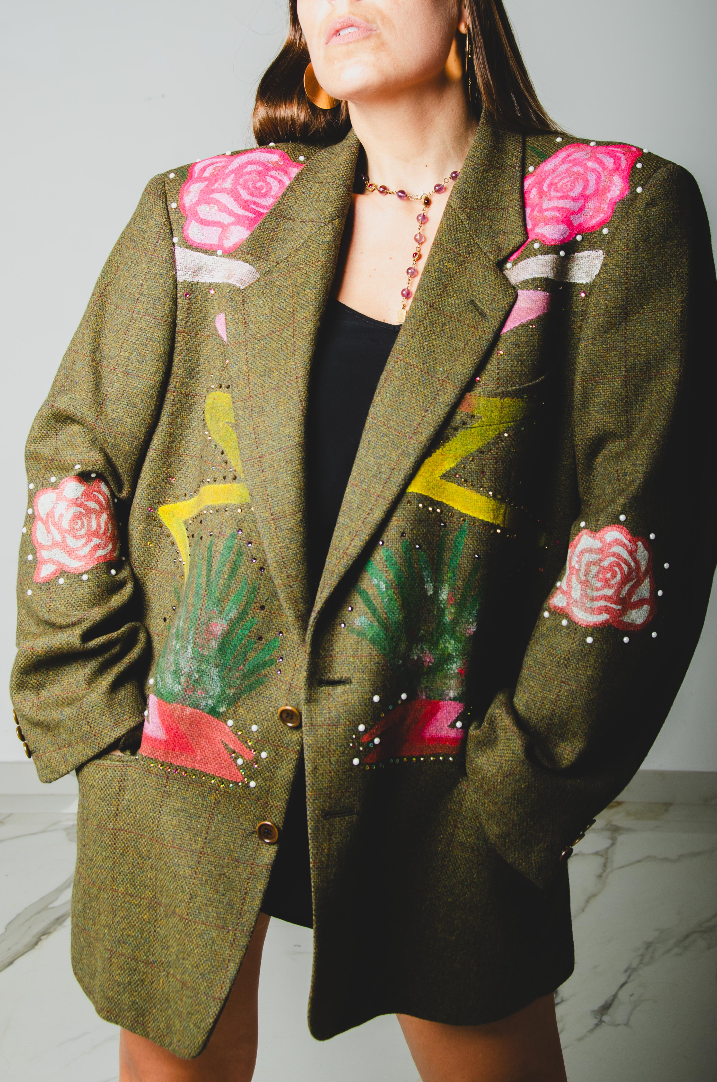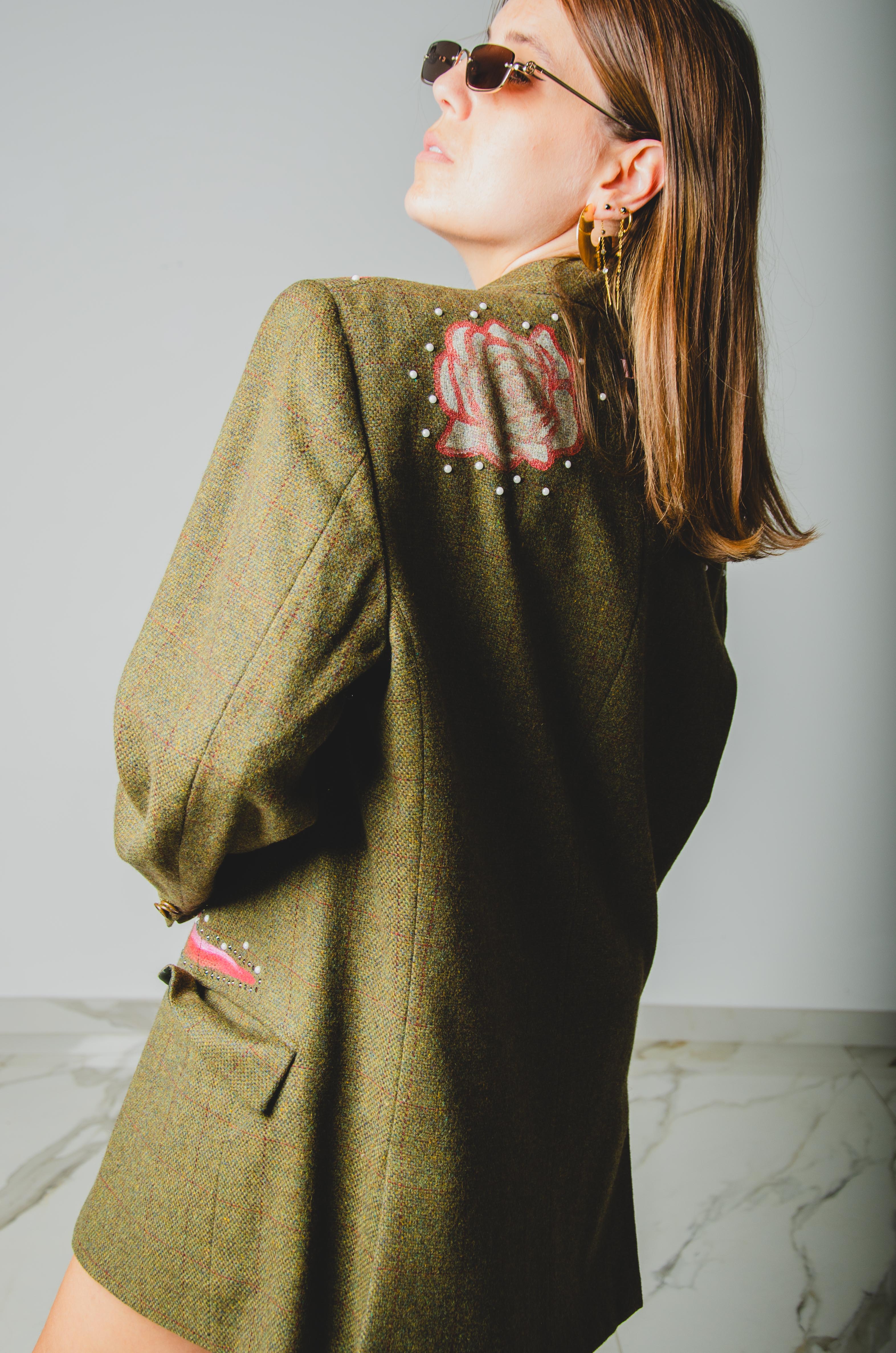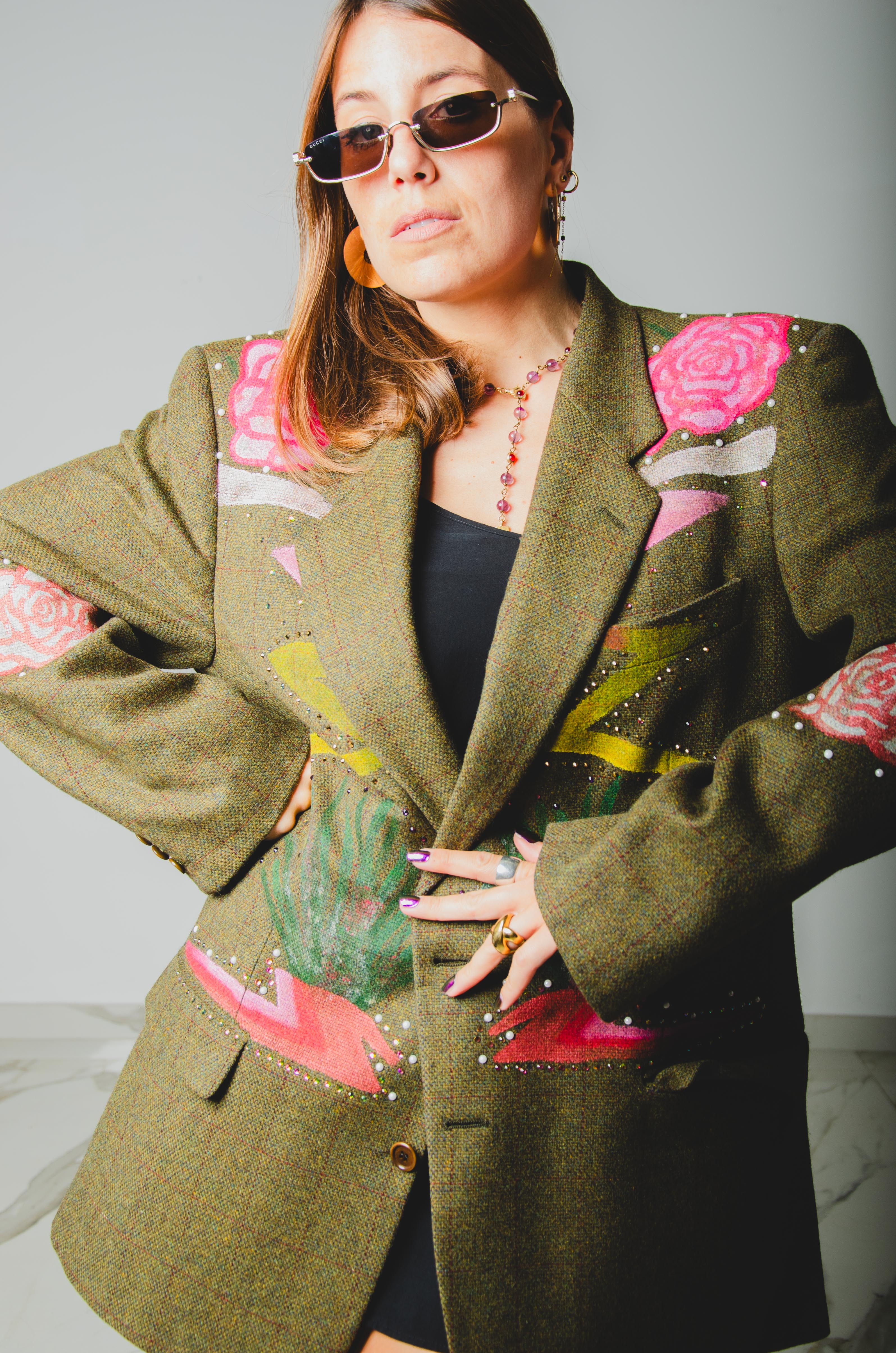 Ti presentiamo la nostra giacca uomo vintage upcycling pensata per le donne , l'aggiunta perfetta al guardaroba di ogni individuo alla moda. Ogni giacca è realizzata con cura con materiali vintage, rendendola non solo elegante ma sostenibile. Modifichiamo personalmente giacche vintage che hanno una qualità decisamente superiore alle giacche di nuova generazione e le impreziosiamo con colori e ricami a mano.