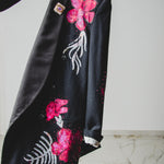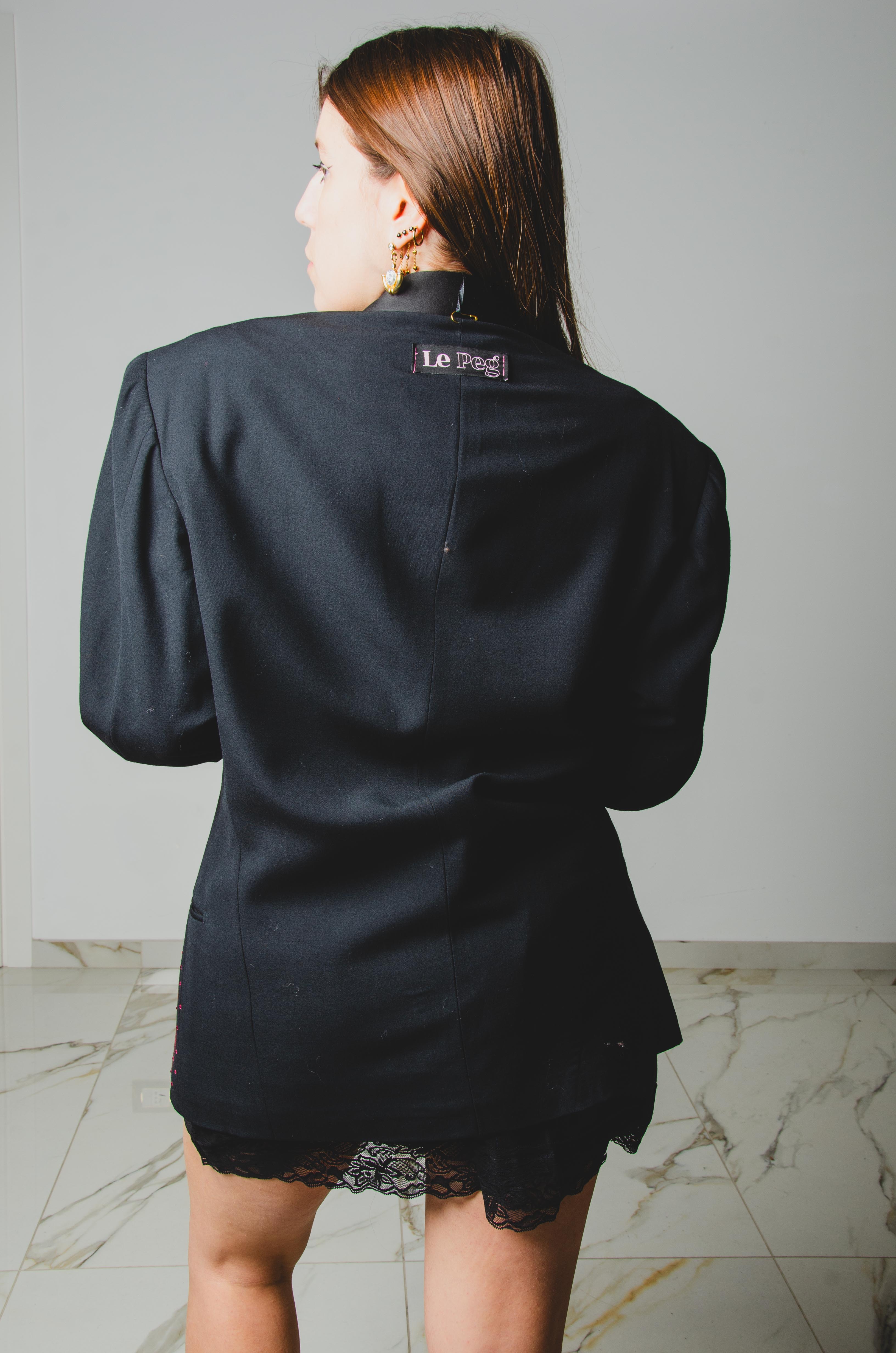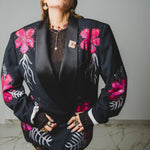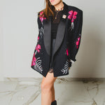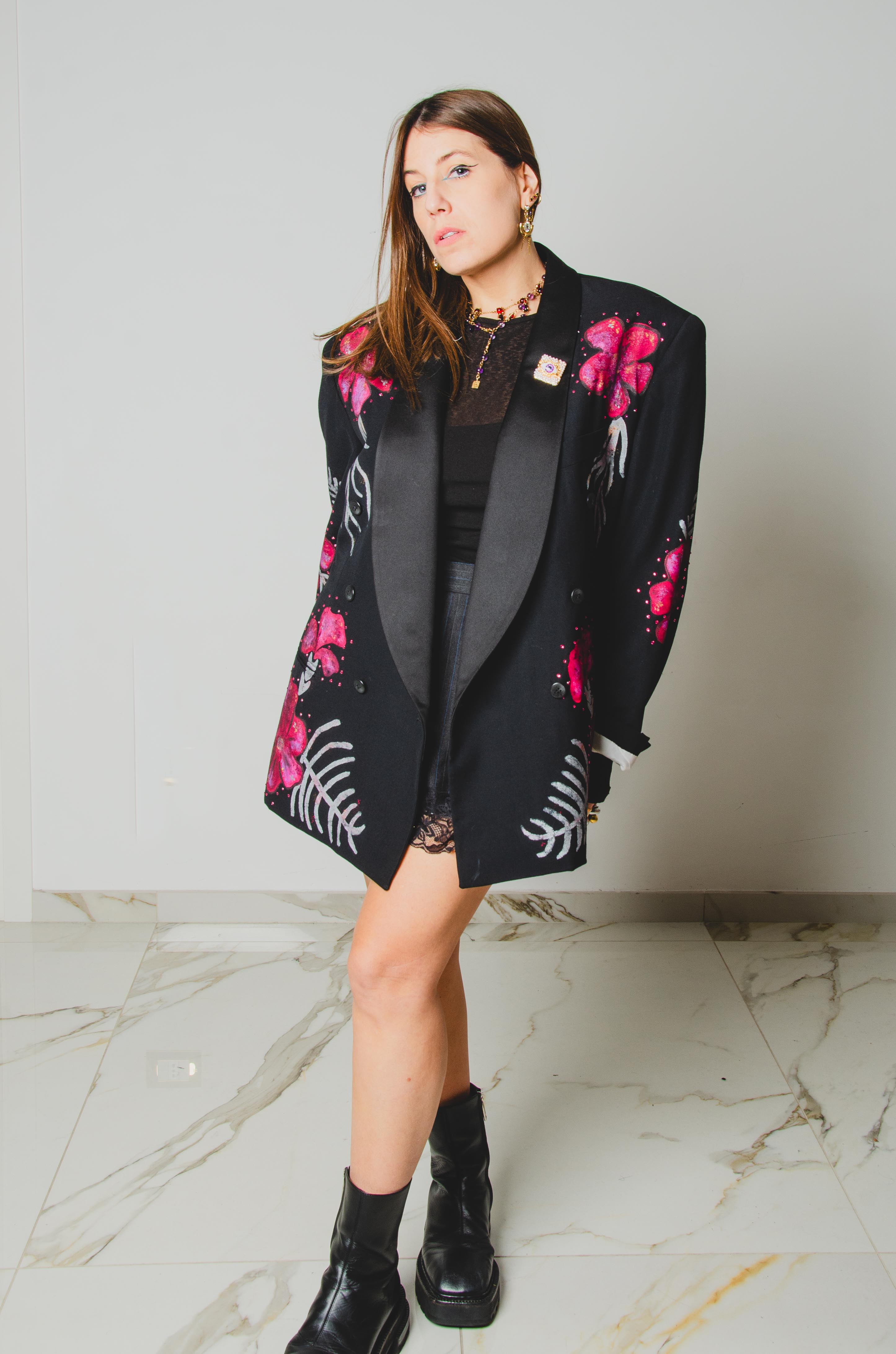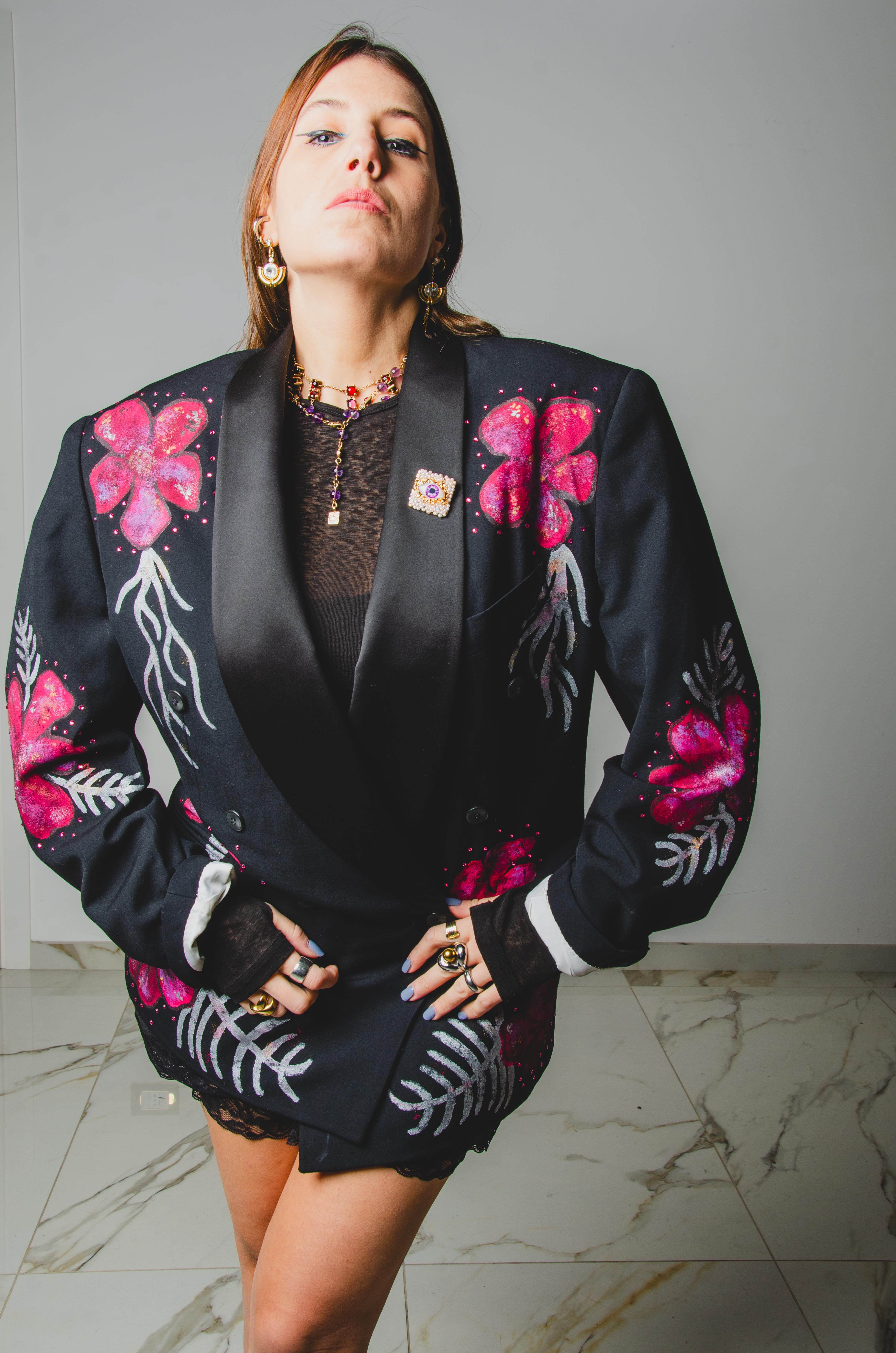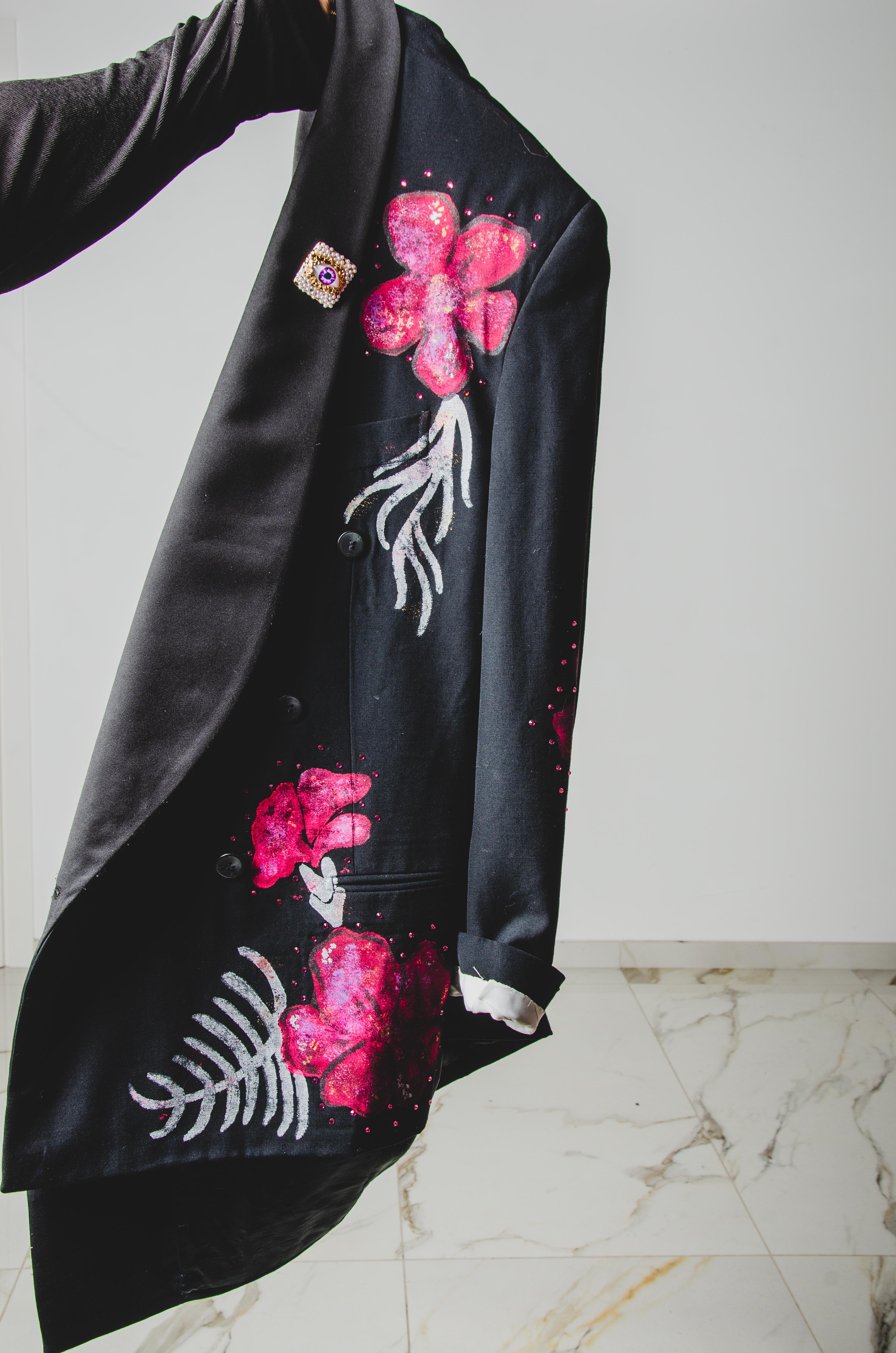 539 Giacca smoking nera doppiopetto con fiori dipinti a mano e strass - tg 50 -