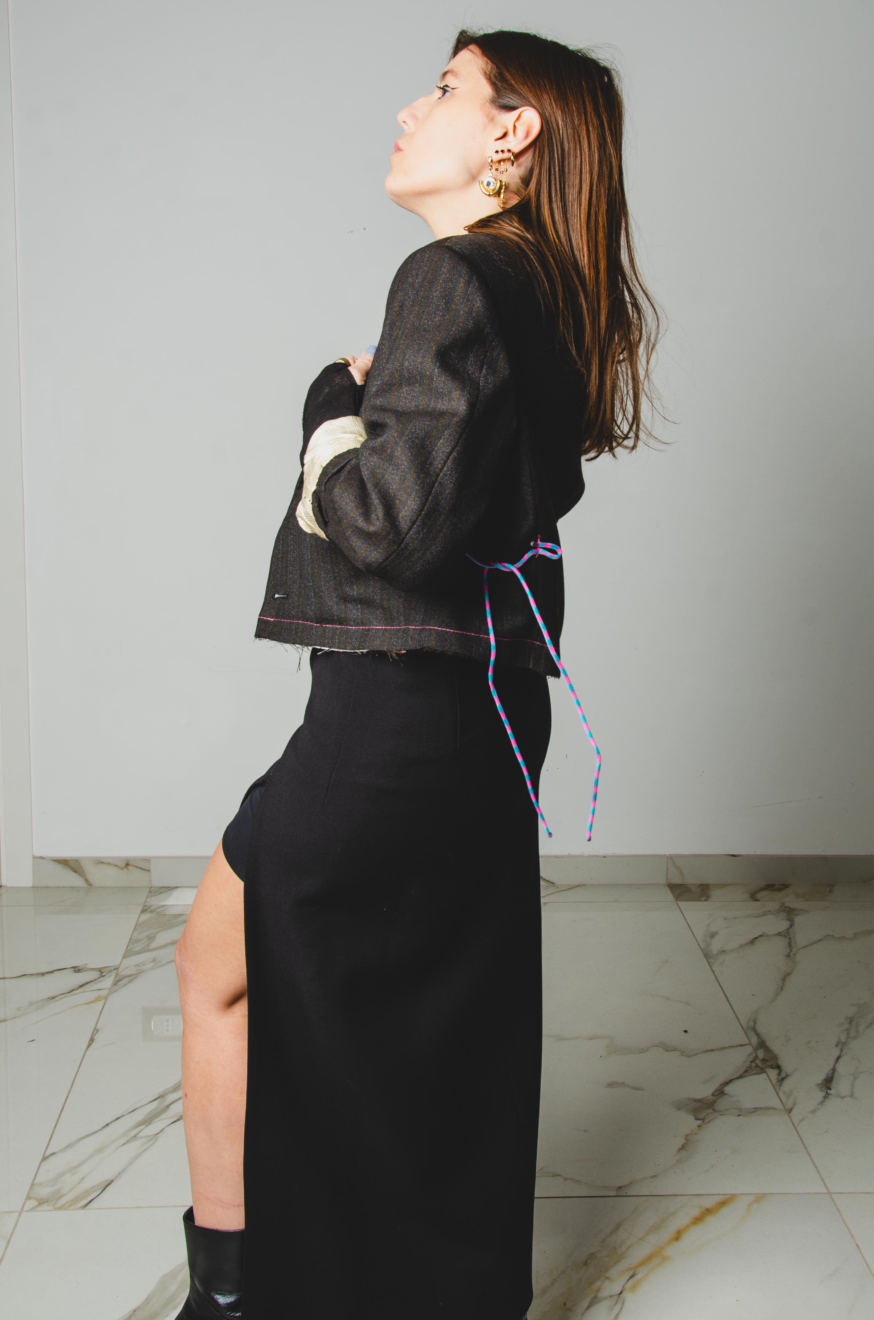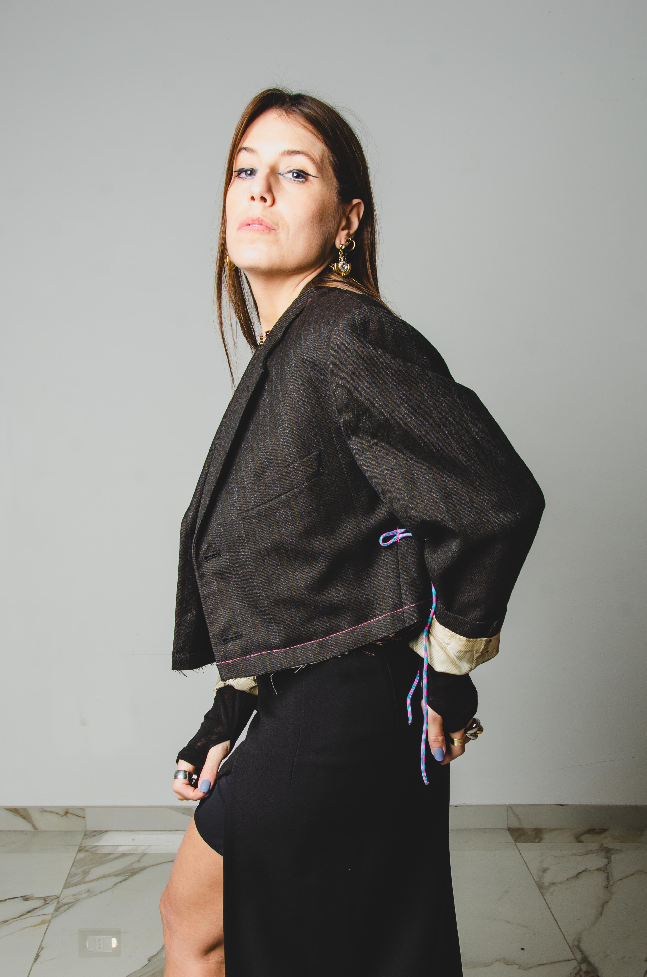 552 Giacca marrone a righe in lana con laccini crop e tagli a vivo tg 50