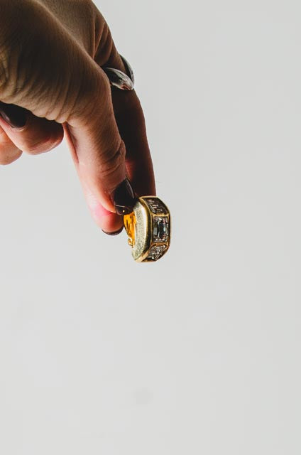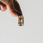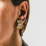 Questi orecchini vintage con clip si distinguono per il loro design elegante e deciso, caratterizzato da una struttura rettangolare in metallo dorato impreziosita da cristalli luminosi incastonati. Un accessorio raffinato ma di carattere, capace di catturare la luce e valorizzare il volto con discreta intensità.
