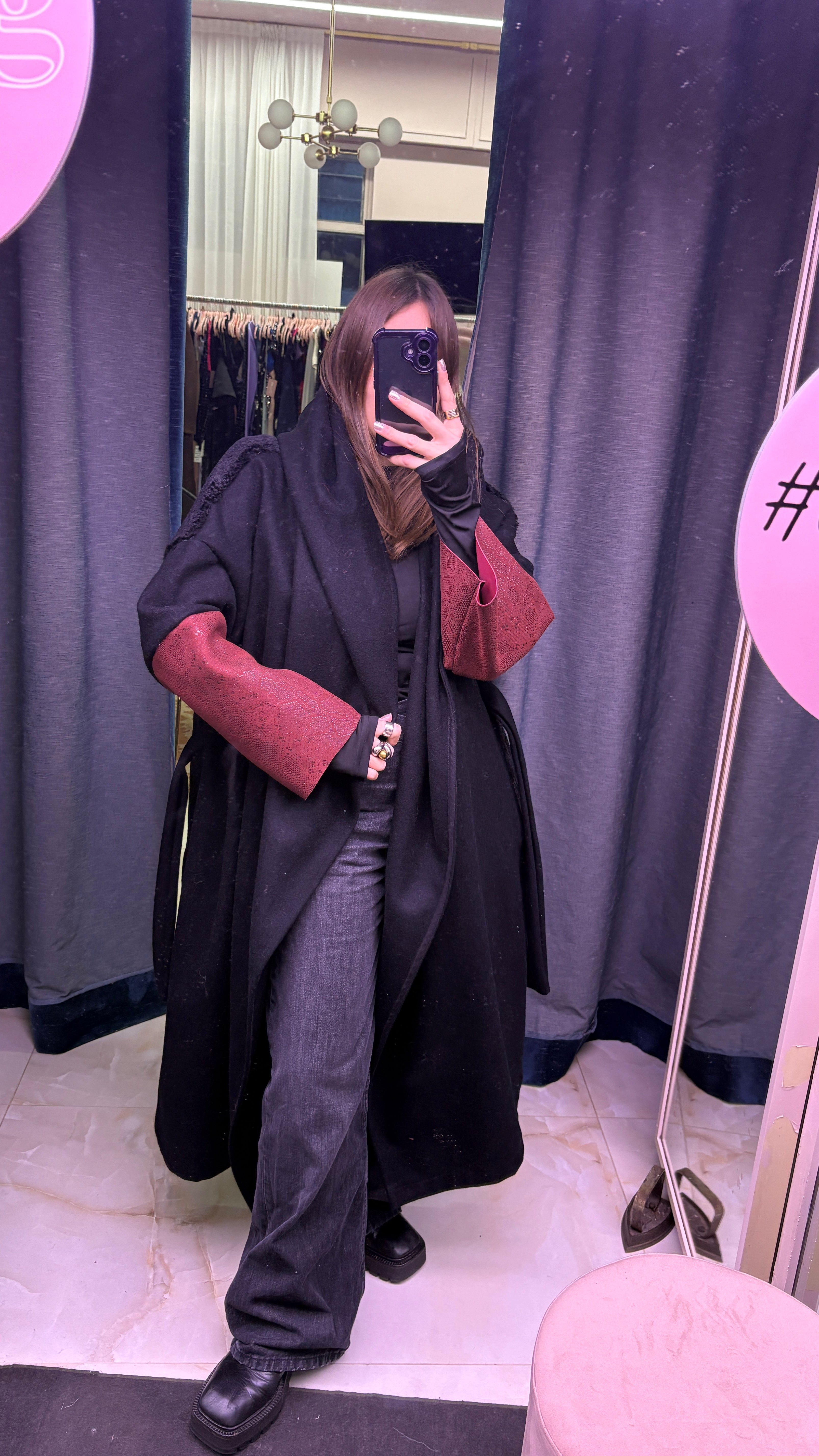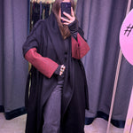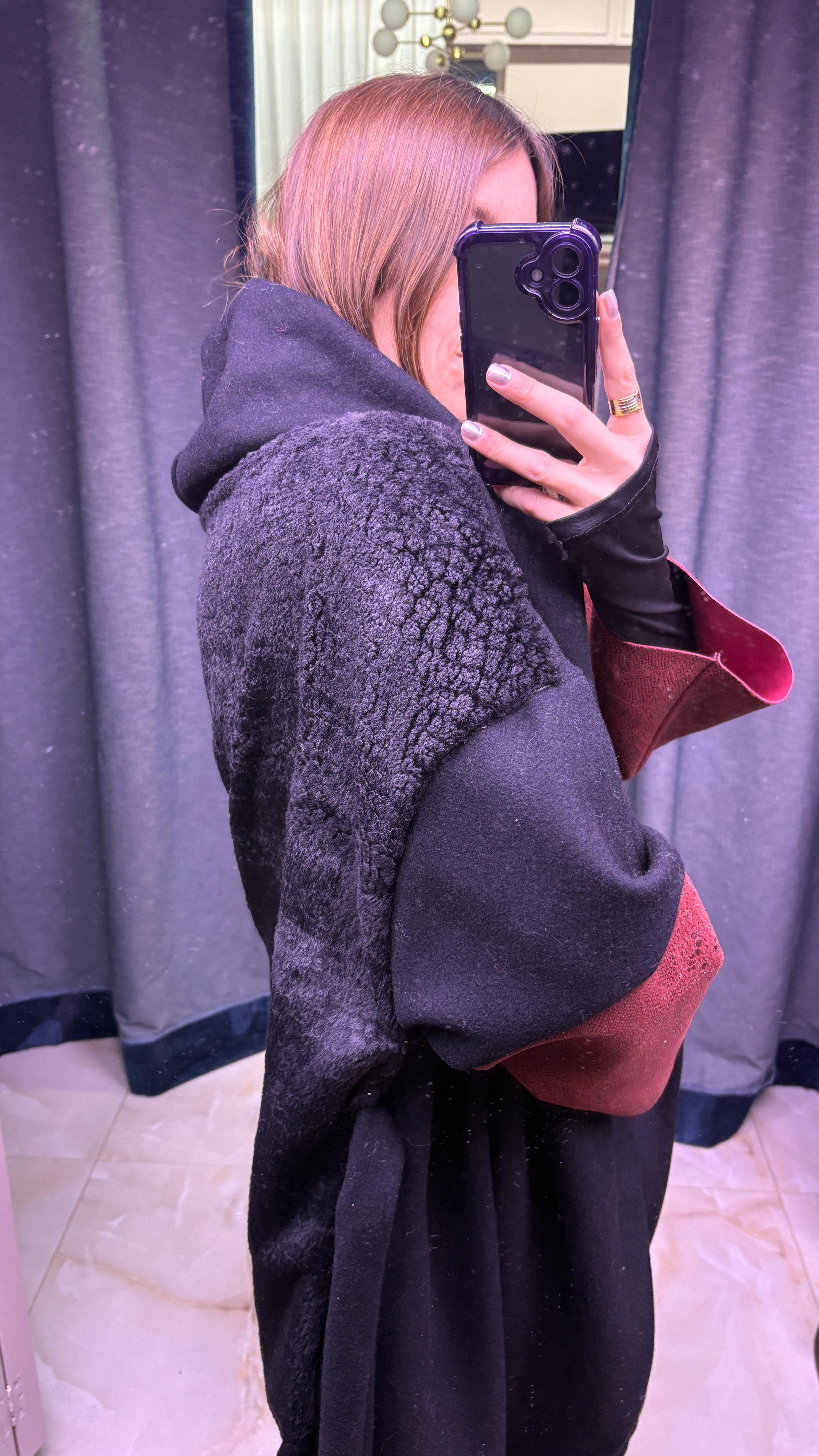 CAPPOTTO WRAP IN LANA NERA E ECOPELLICCIA CON MANICA A CONTRASTO IN PELLE BORDEAUX