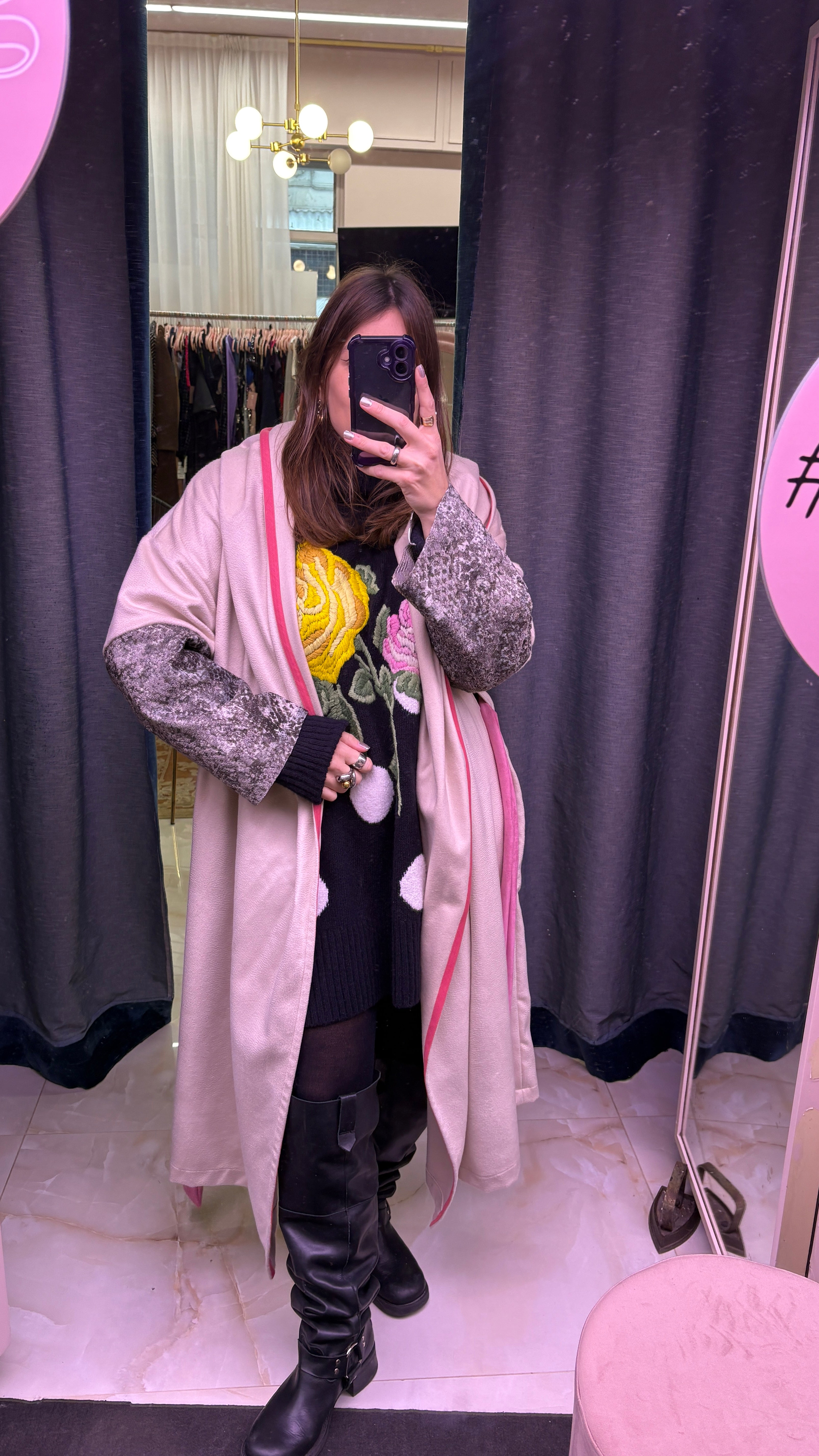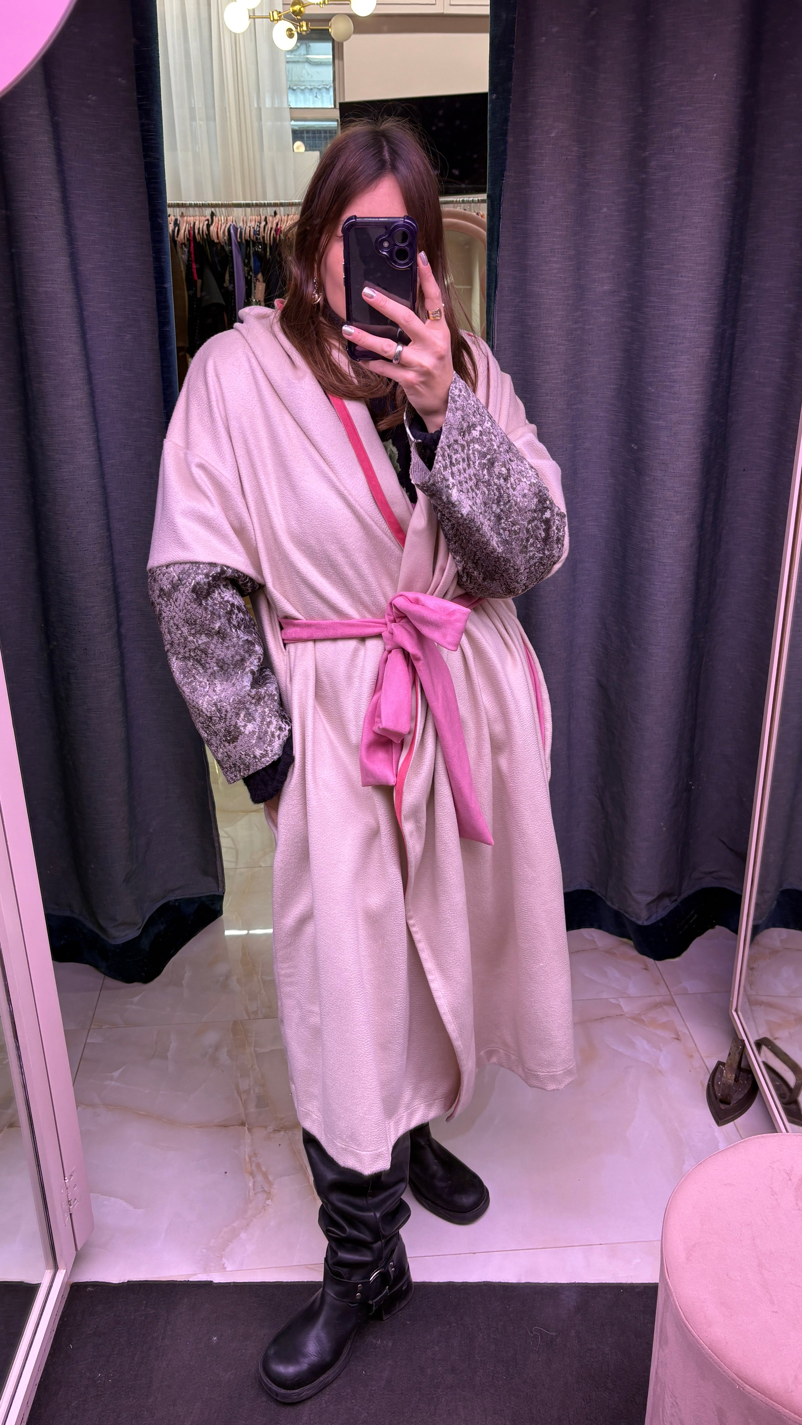 CAPPOTTO WRAP IN LANA VERGINE COLOR PANNA CON MANICA A CONTRASTO