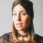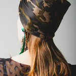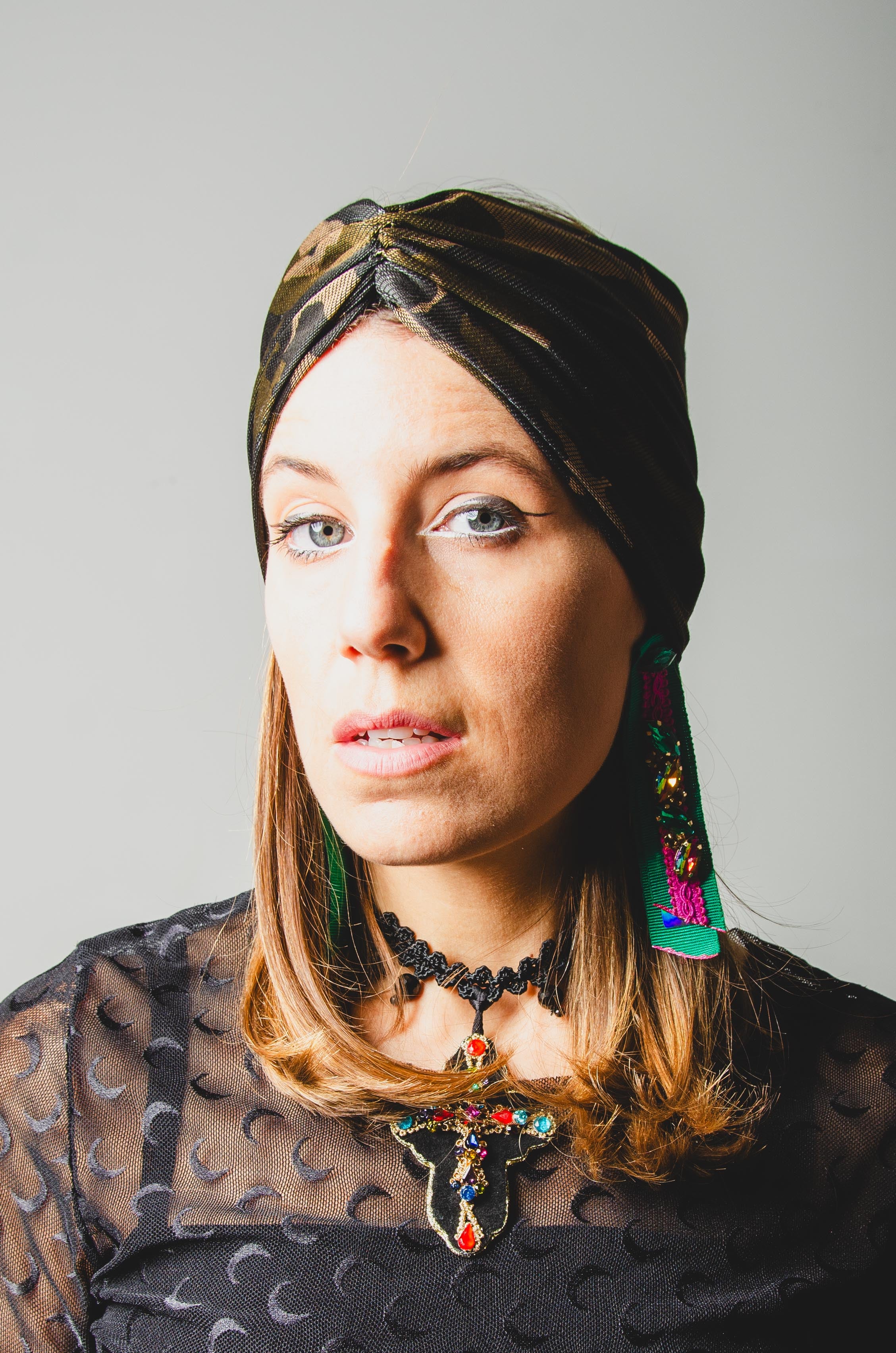Elastic headband with stripes curled at the top, made with the highest quality fabrics.