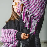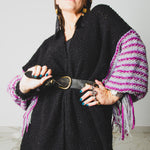 • Caratteristiche: base nera, maniche multicolor lilla/viola/verde, frange decorative, vestibilità oversize taglia unica