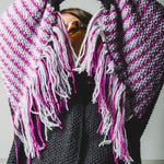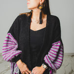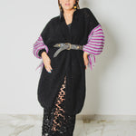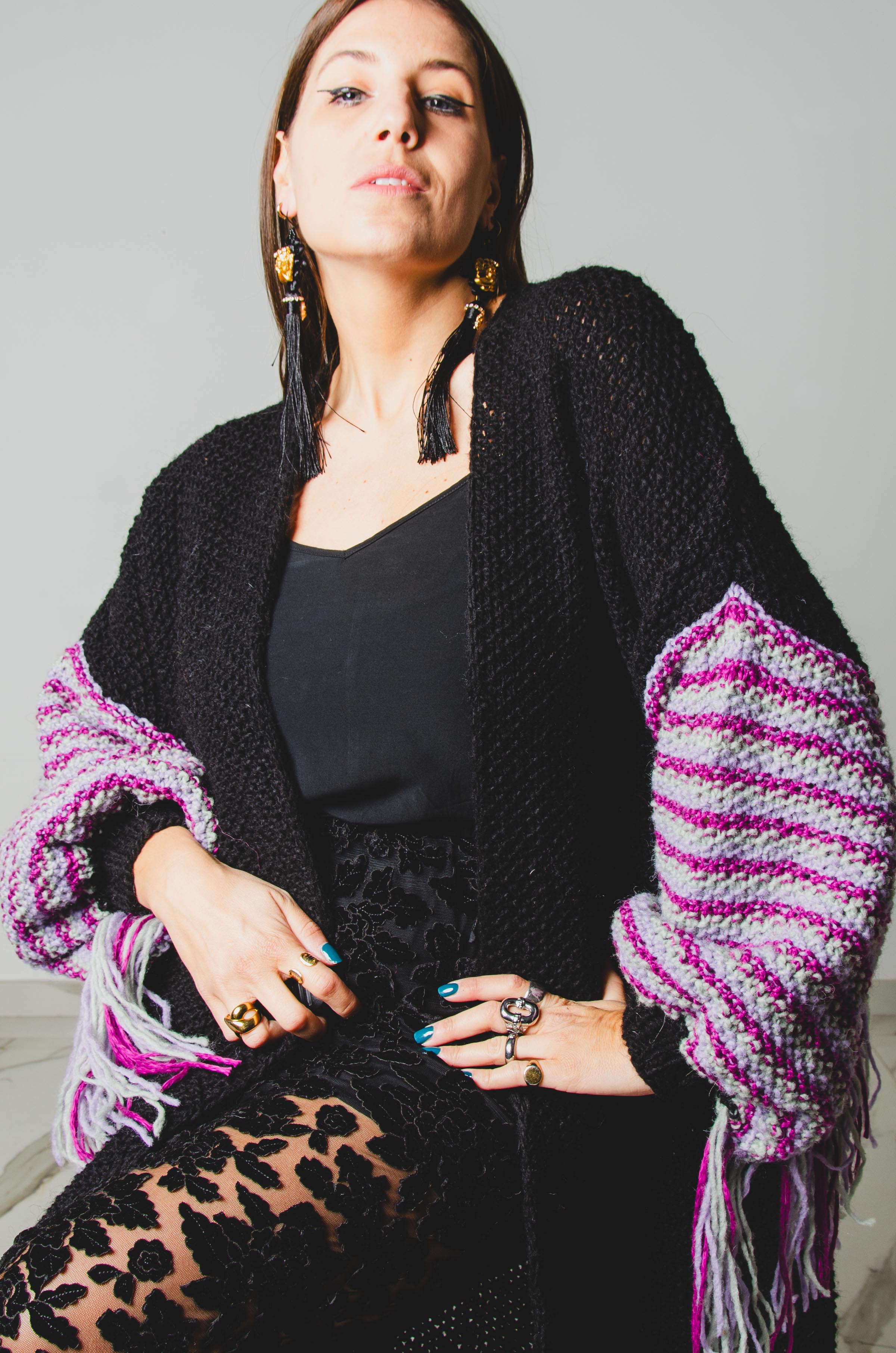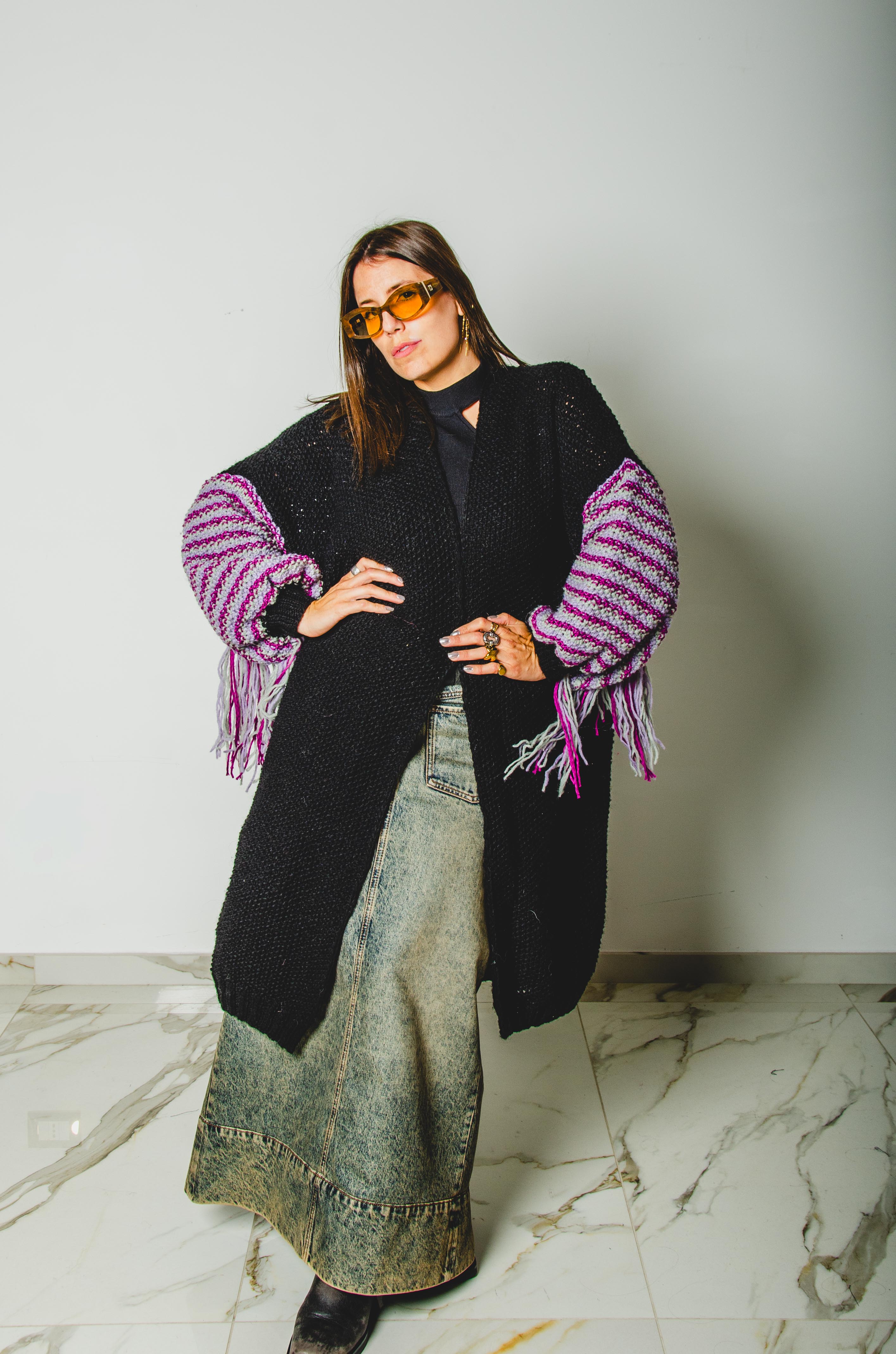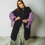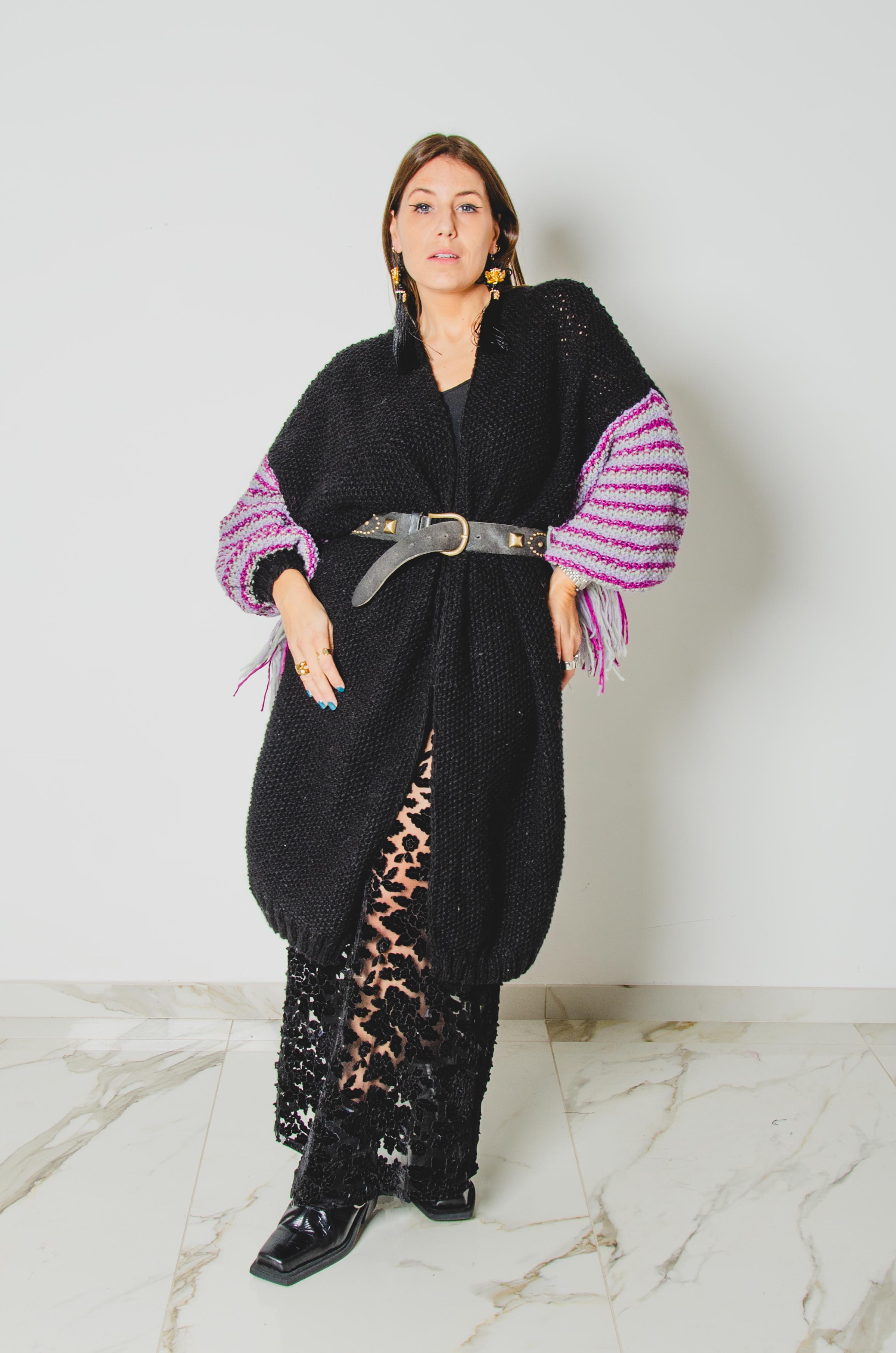 Questo cardigan lungo è un capo unico, realizzato interamente a mano da donne artigiane serbe con lana locale proveniente dalla Serbia. La base nera viene valorizzata da maniche lavorate a maglia multicolor nei toni del lilla, viola e verde, impreziosite da lunghe frange che aggiungono movimento e carattere al design.