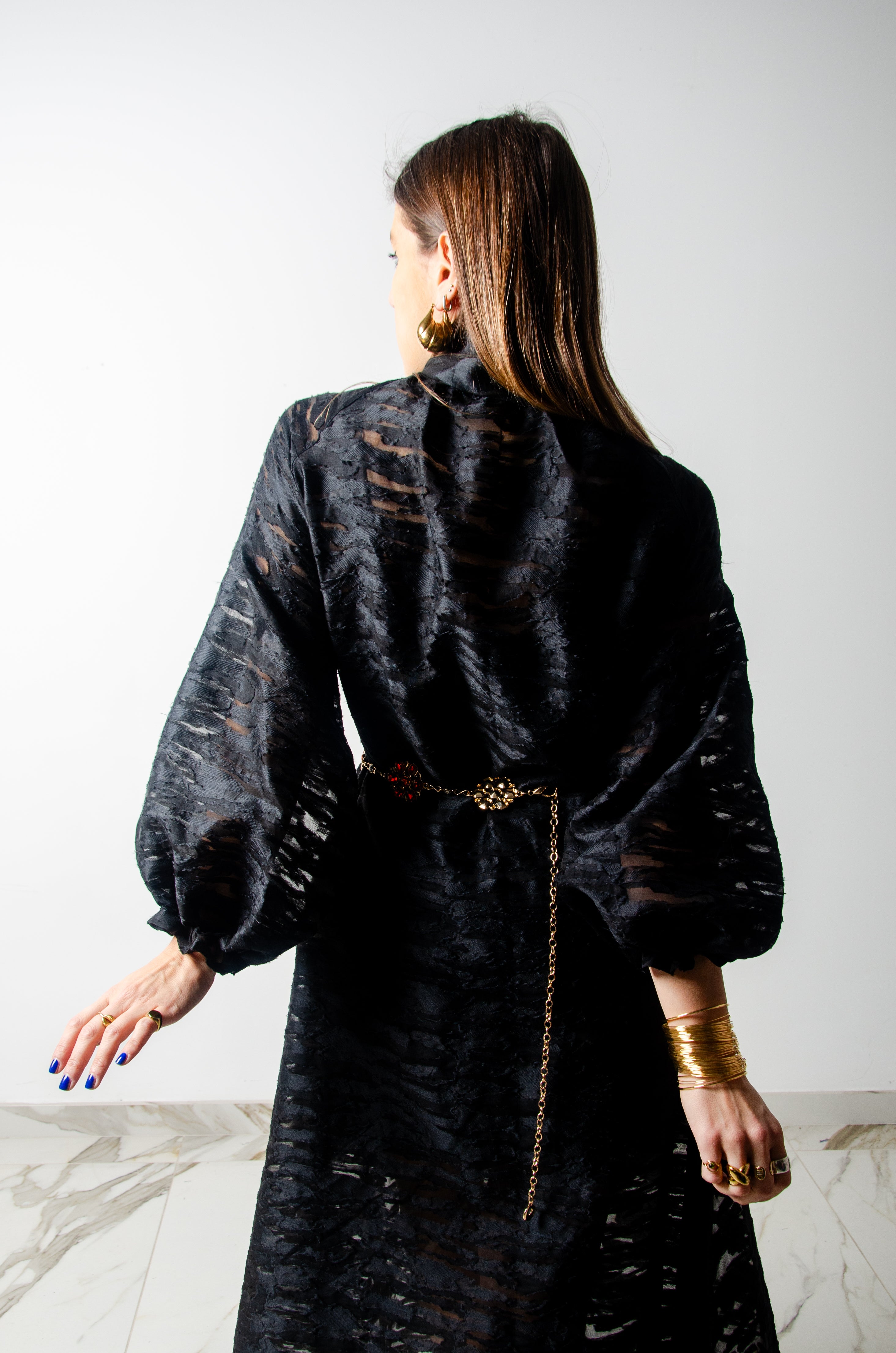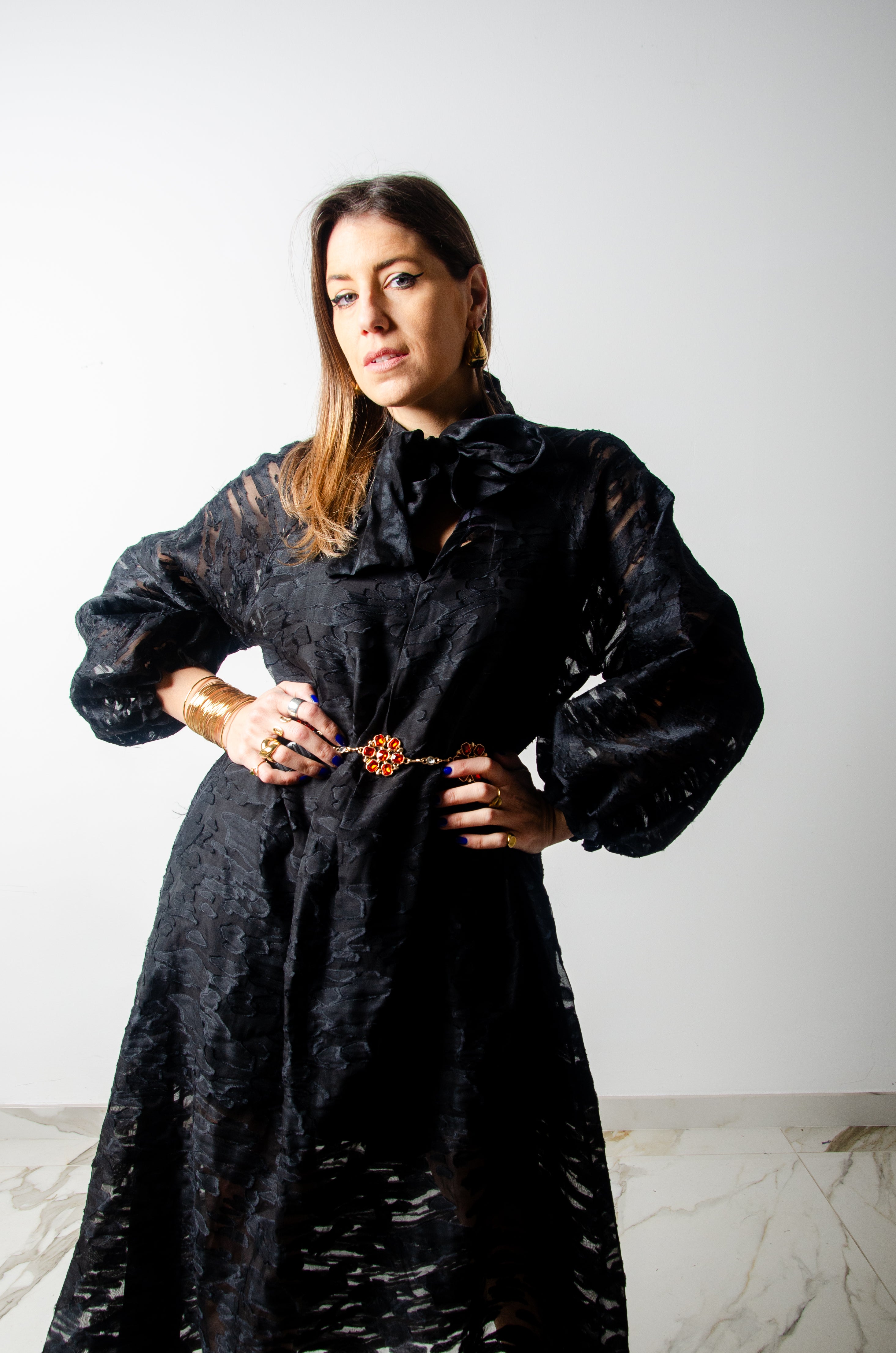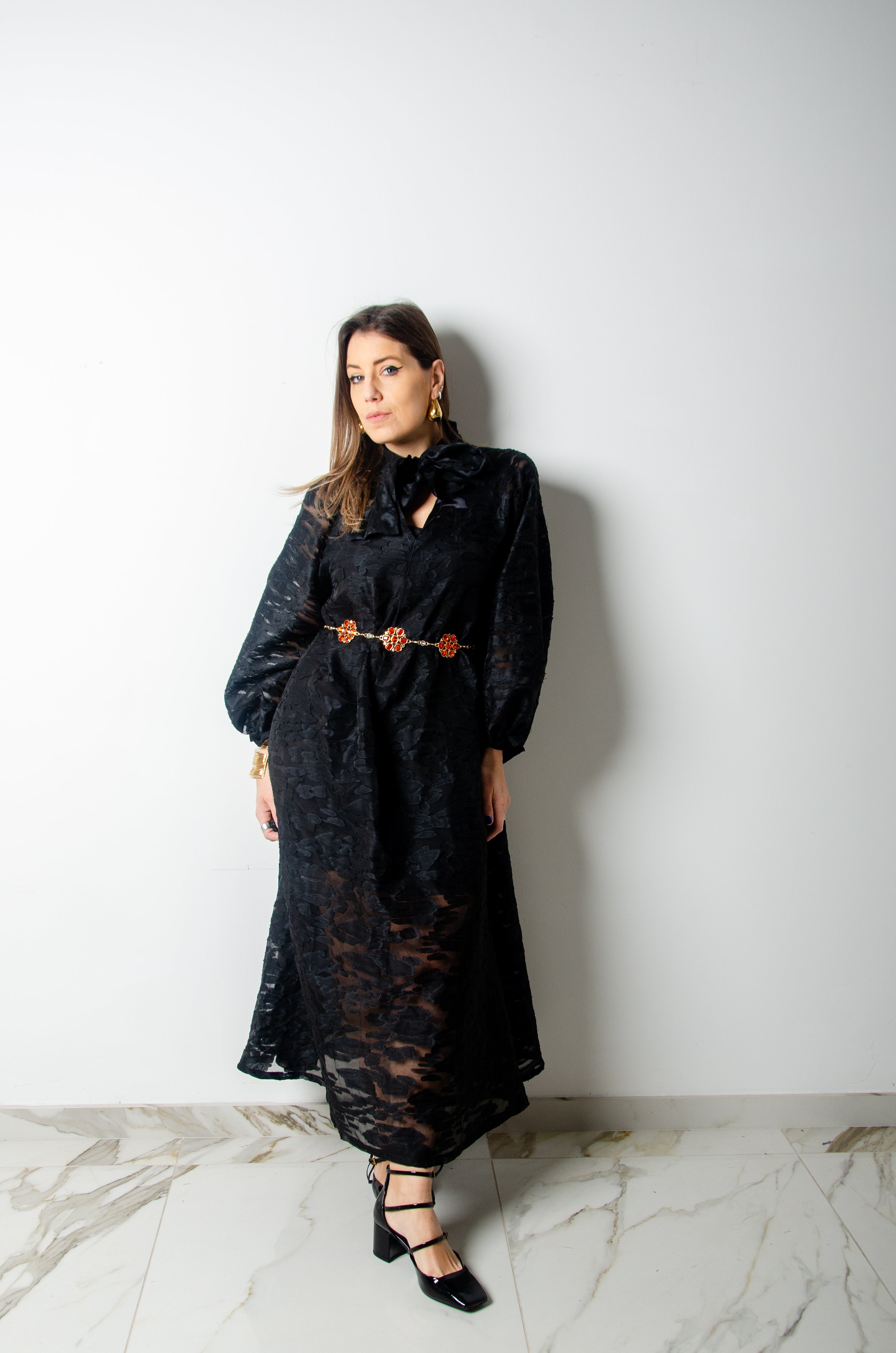 Questo vestito sartoriale  è un pezzo unico, realizzato in tessuto di alta qualità. La sua ampia vestibilità lo rende adatto a più fisicità, fino a taglia 52.