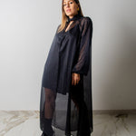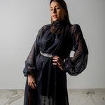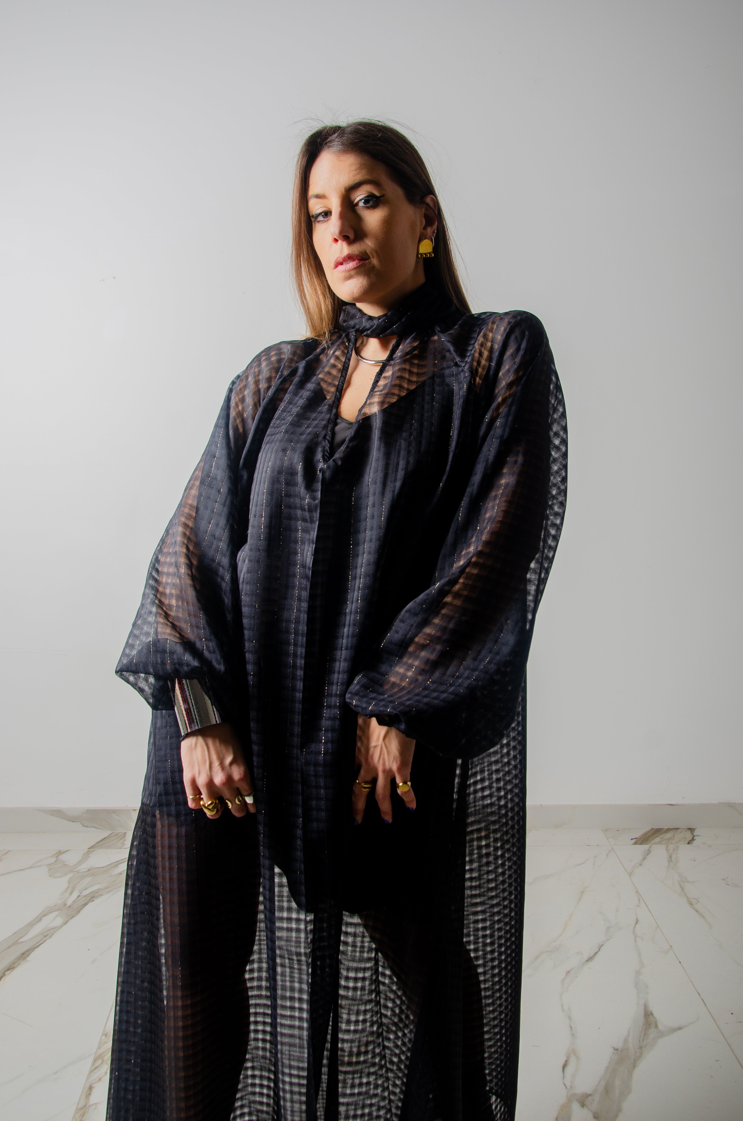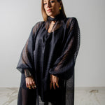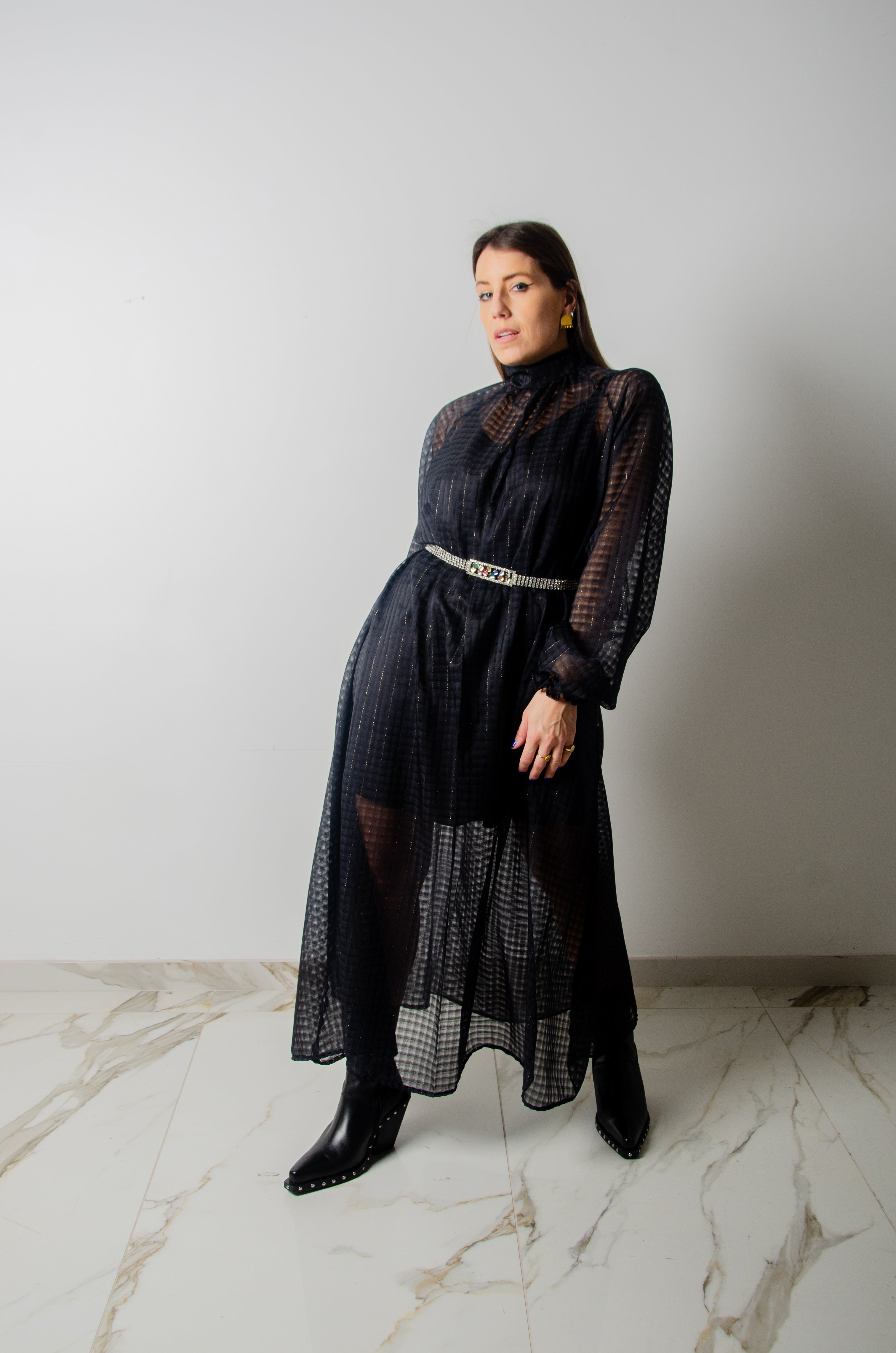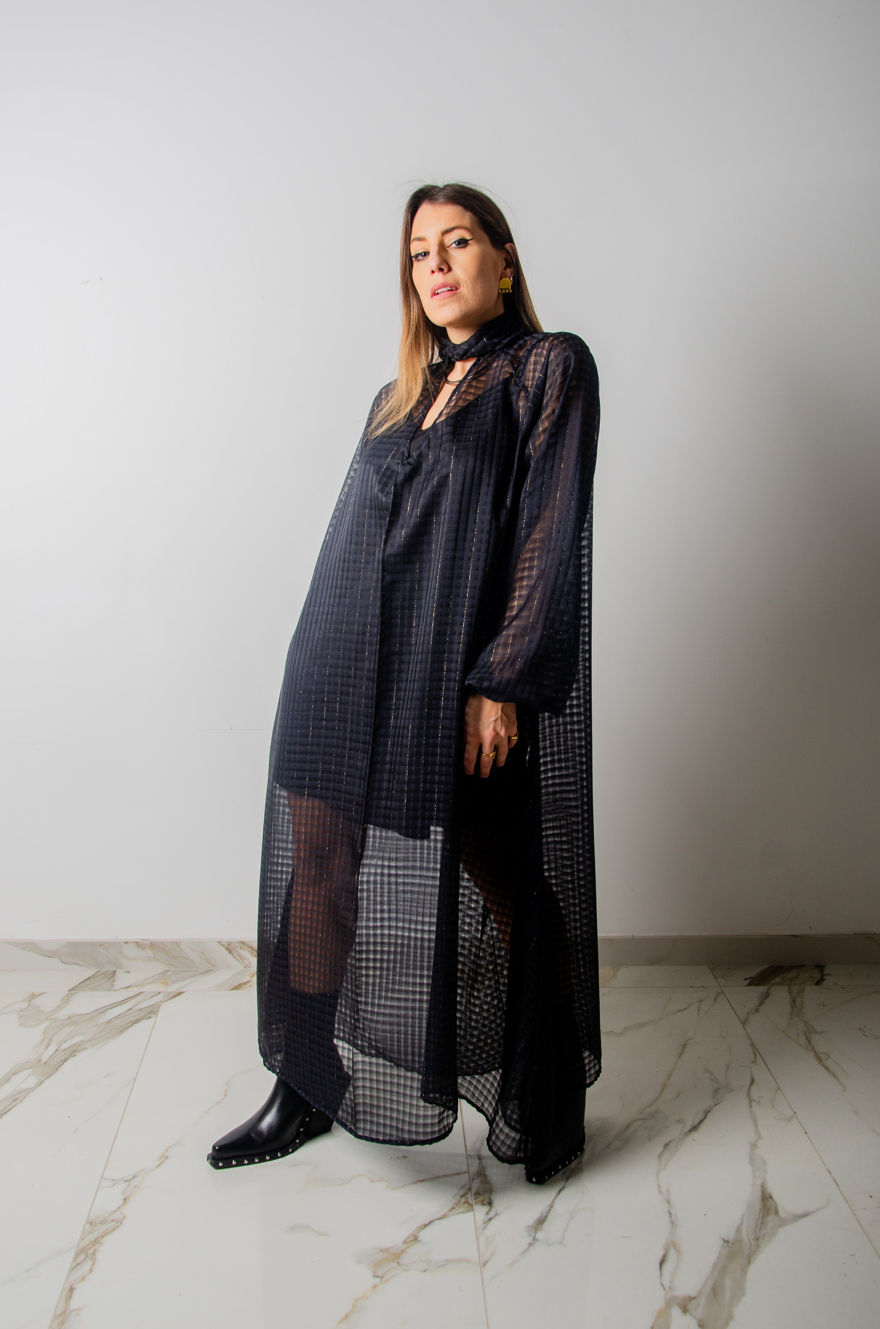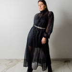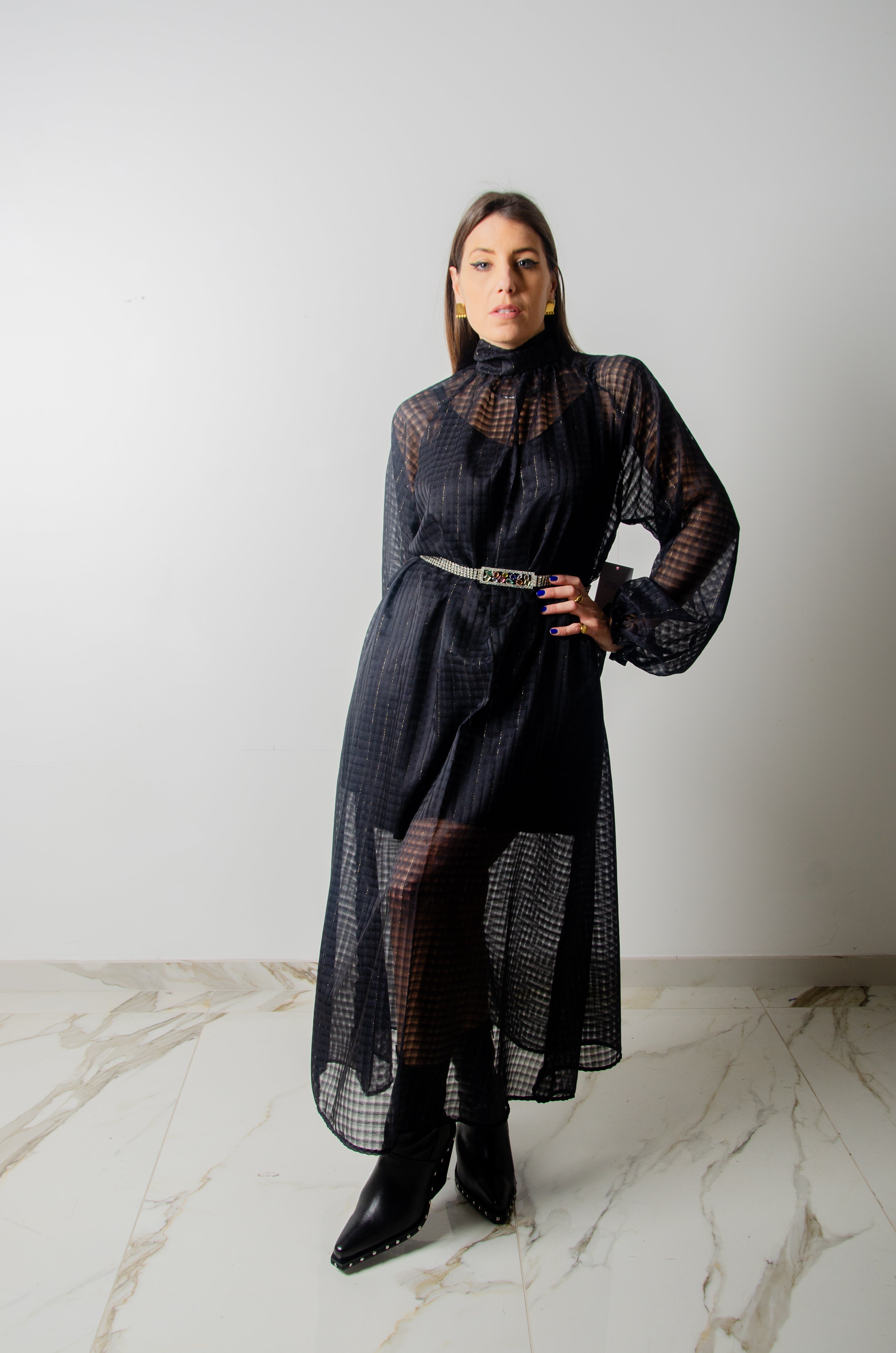 OPERA dress - Vestito sartoriale accollato / scollo a V ampio IN CHIFFON NERO CON LUREX