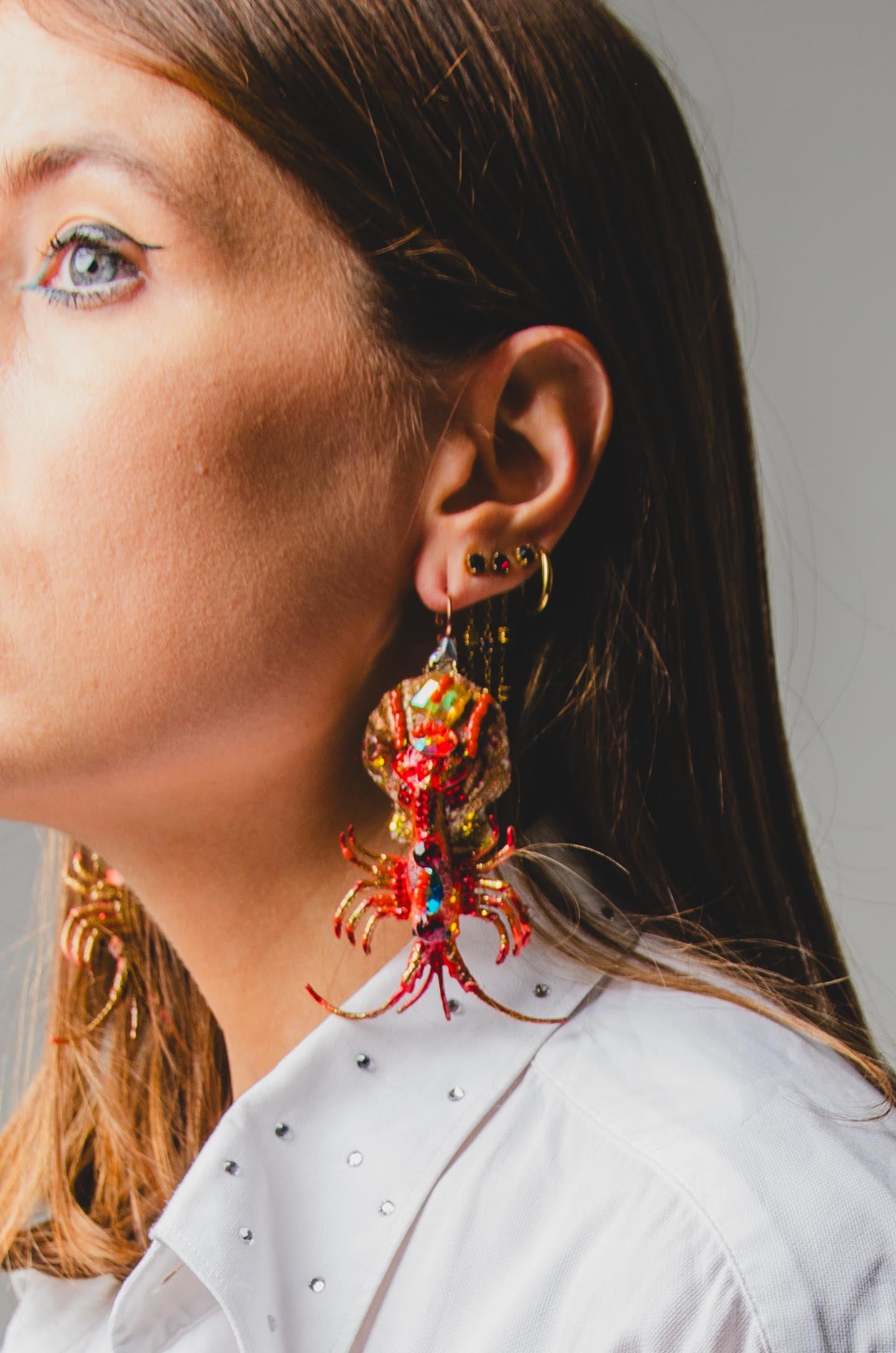 Orecchini realizzati con conchiglie e animaletti marini - aragoste rosse