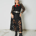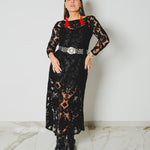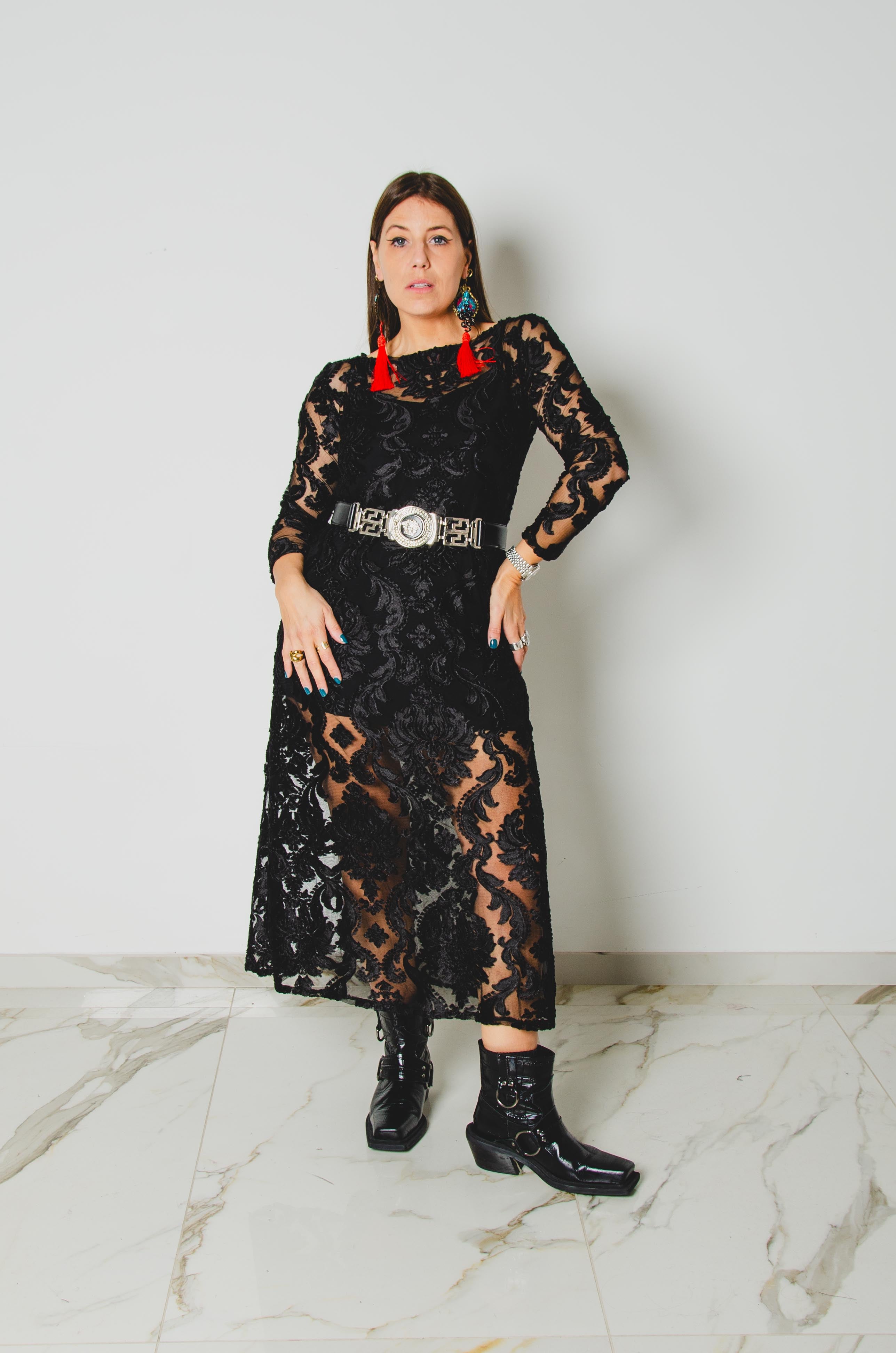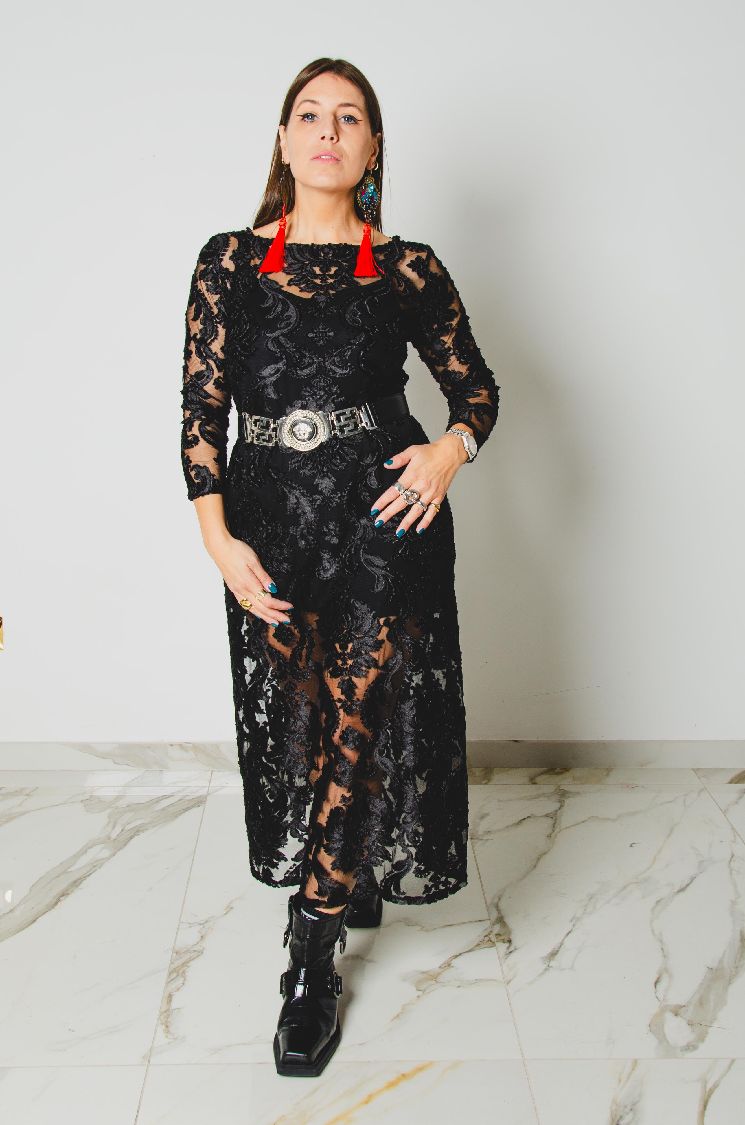 SOFT dress - Vestito con scollo a barchetta lungo con maniche a 3/4 in tulle ricamato nero
