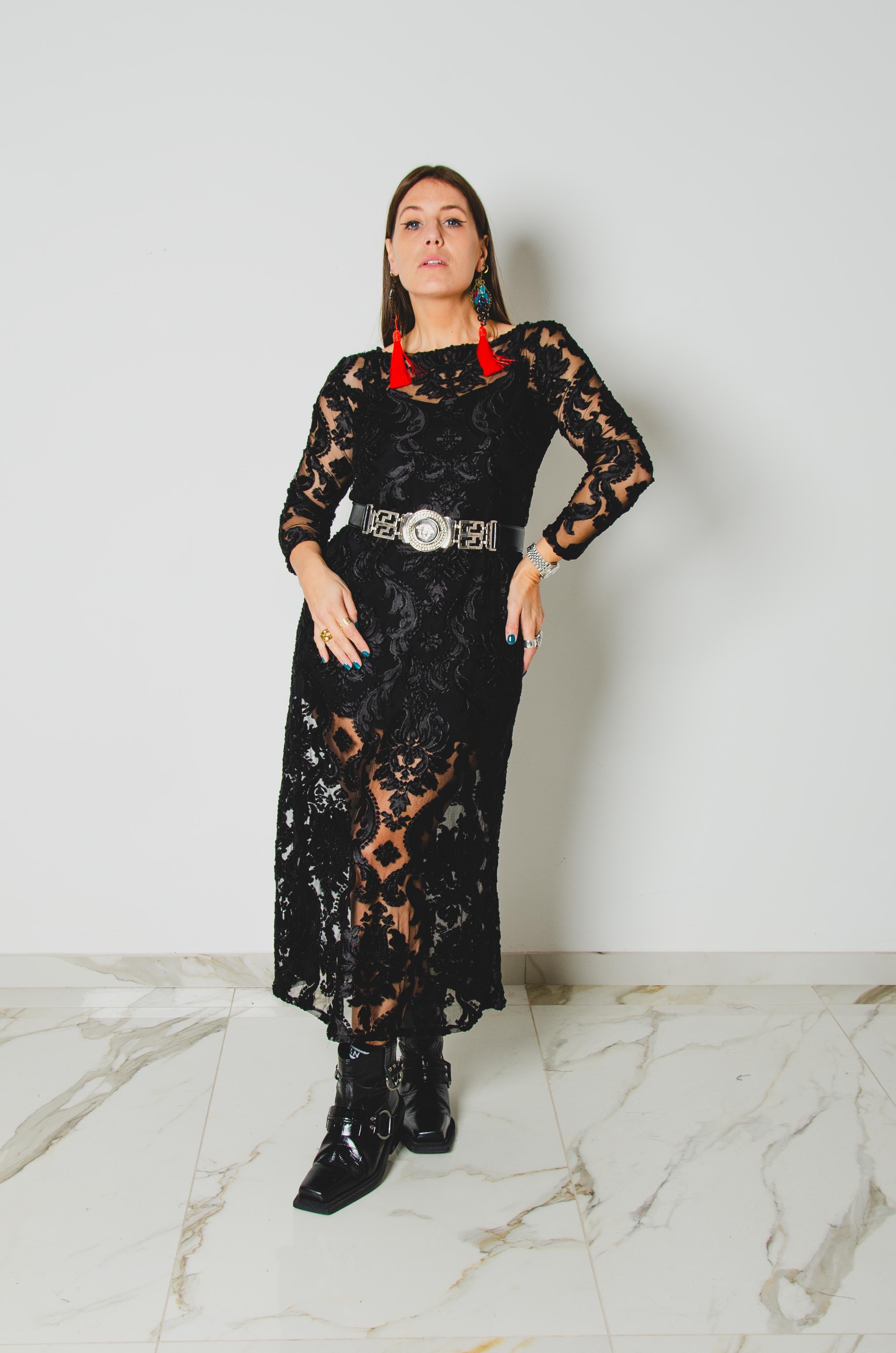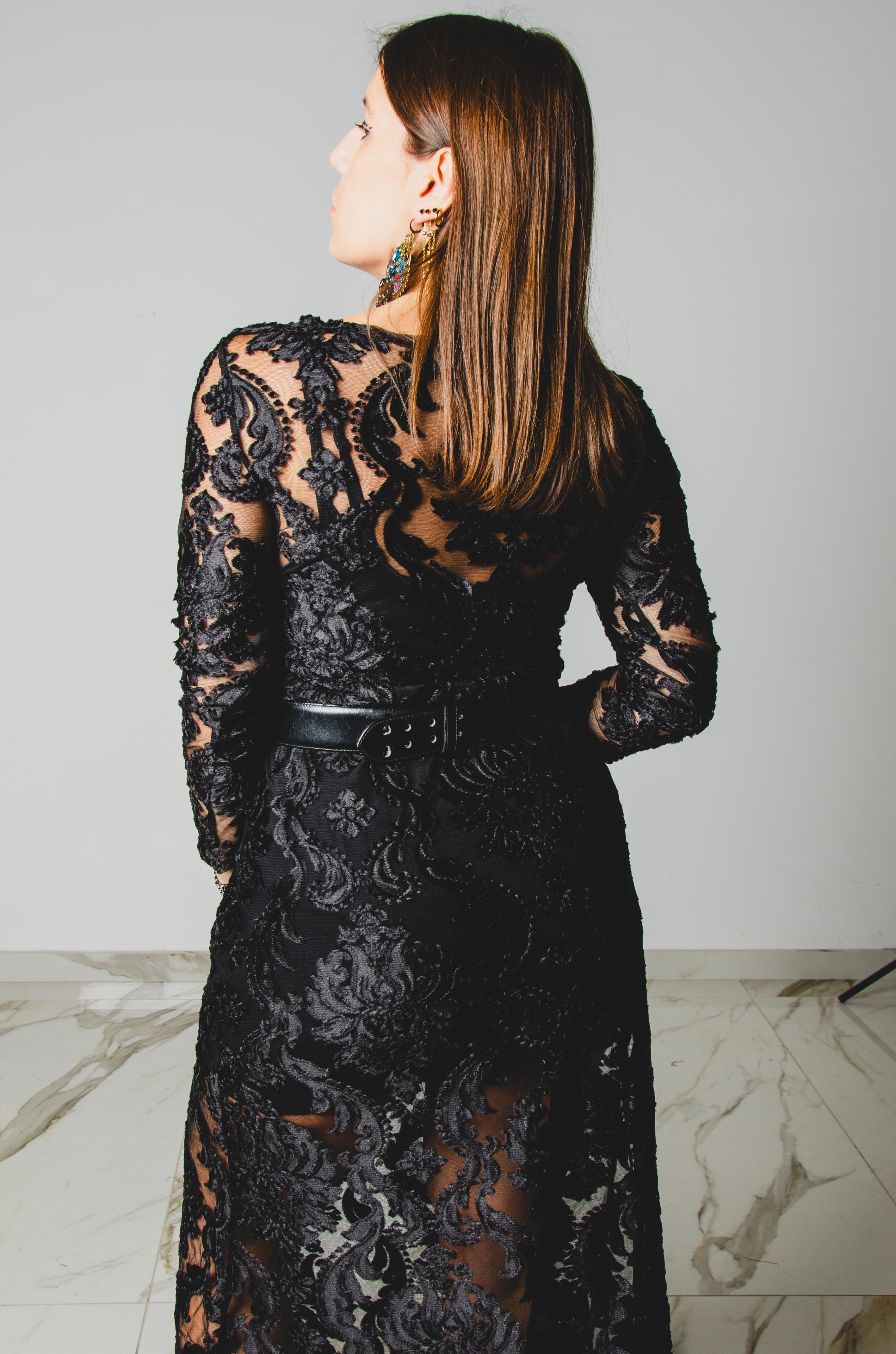 Questo vestito sartoriale  è un pezzo unico, realizzato in tessuto di alta qualità in maglina elasticizzata.